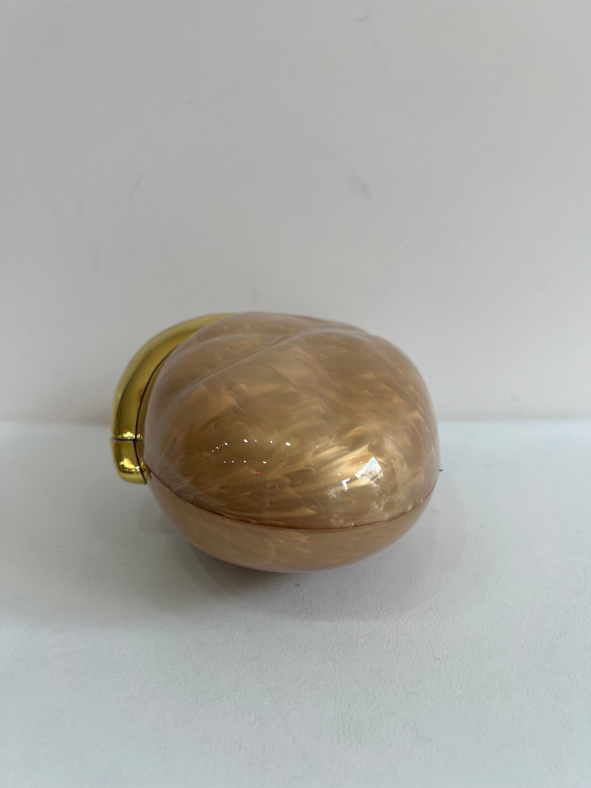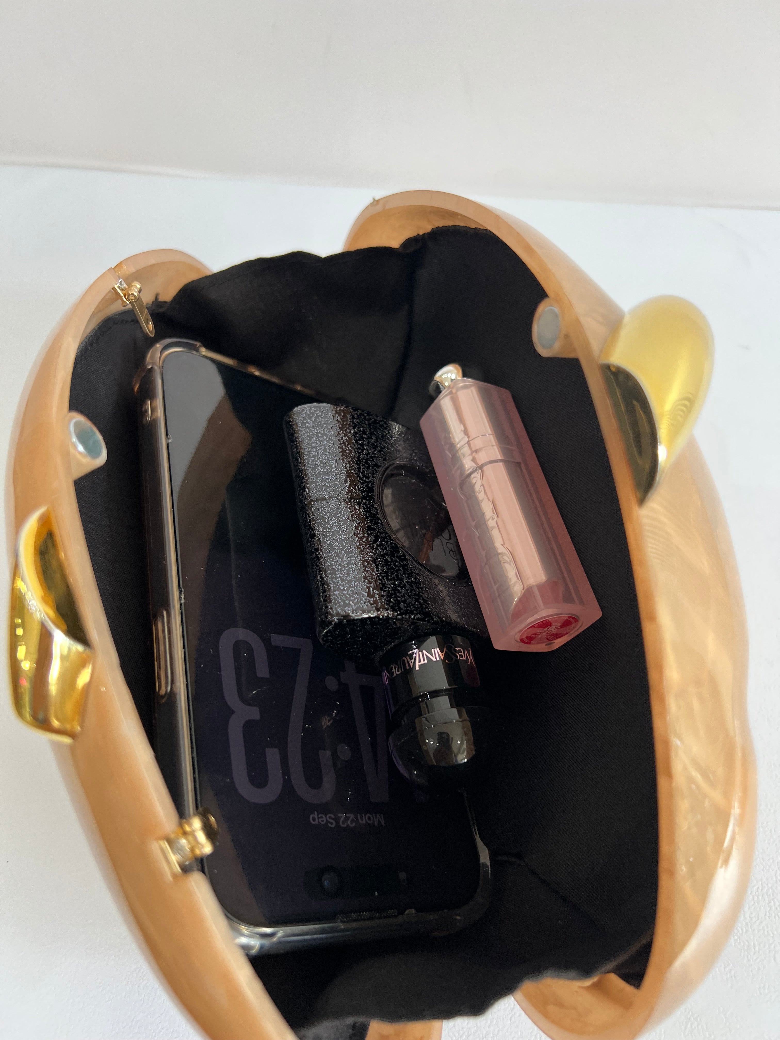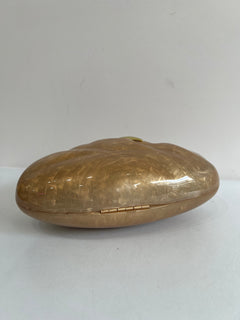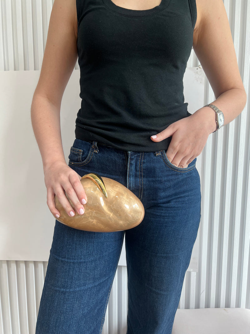 Clutch de mano pequeño con forma inspirada en una concha marina, de diseño rígido y elaborado en acrílico con cierre magnetico.