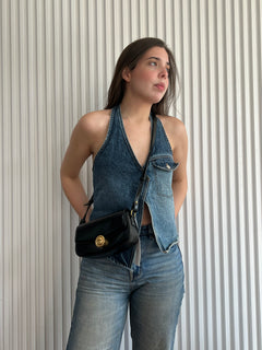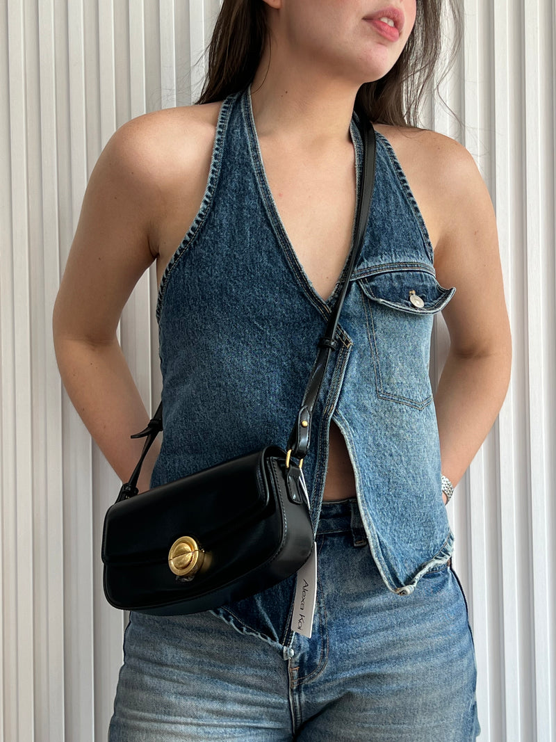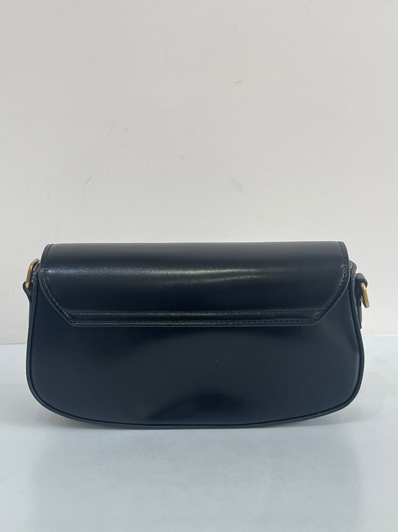 Bolso de hombro en color negro, con estructura suave. Cuenta con una correa ajustable para llevar al hombro o cruzado y cierre frontal.