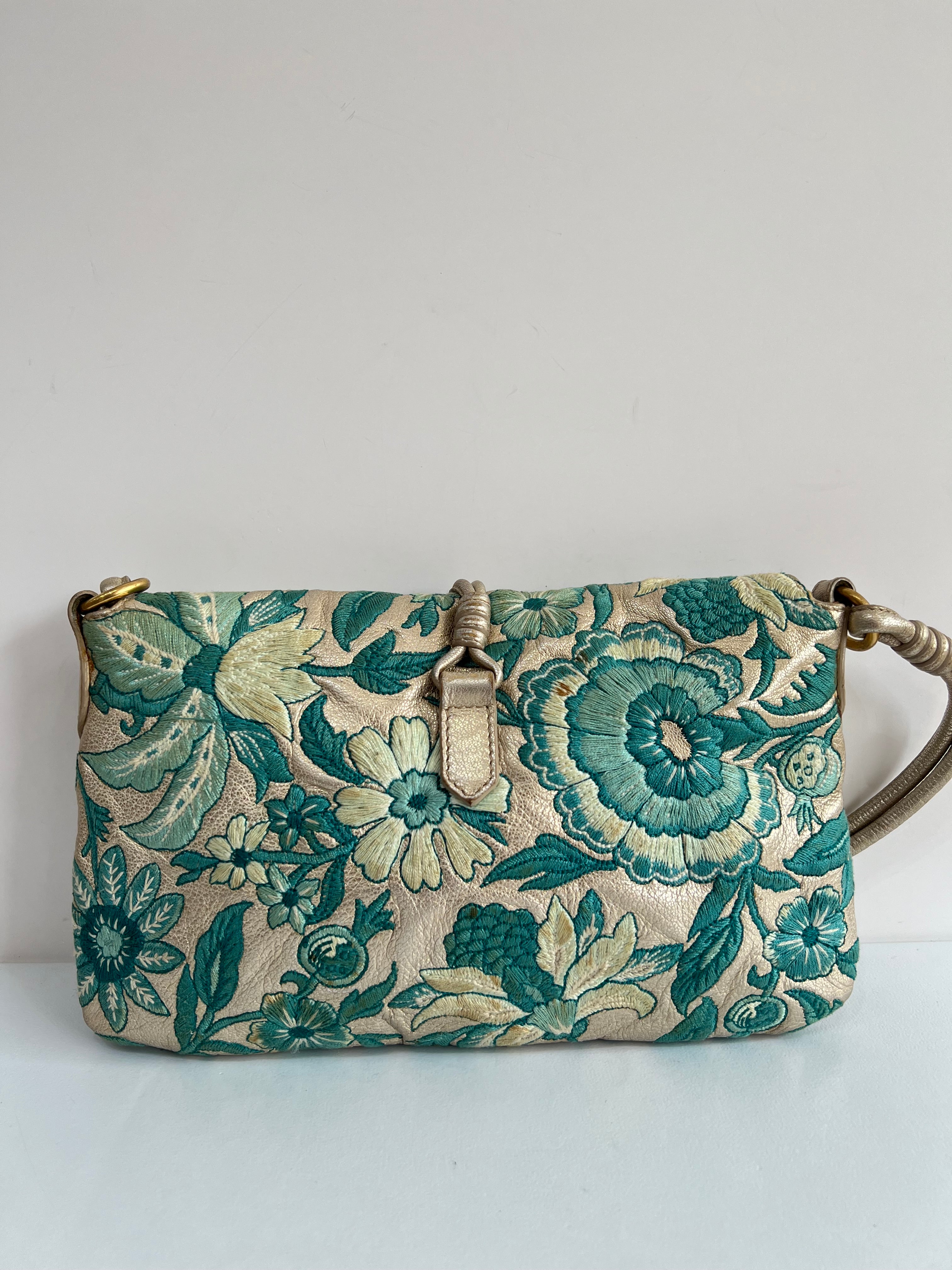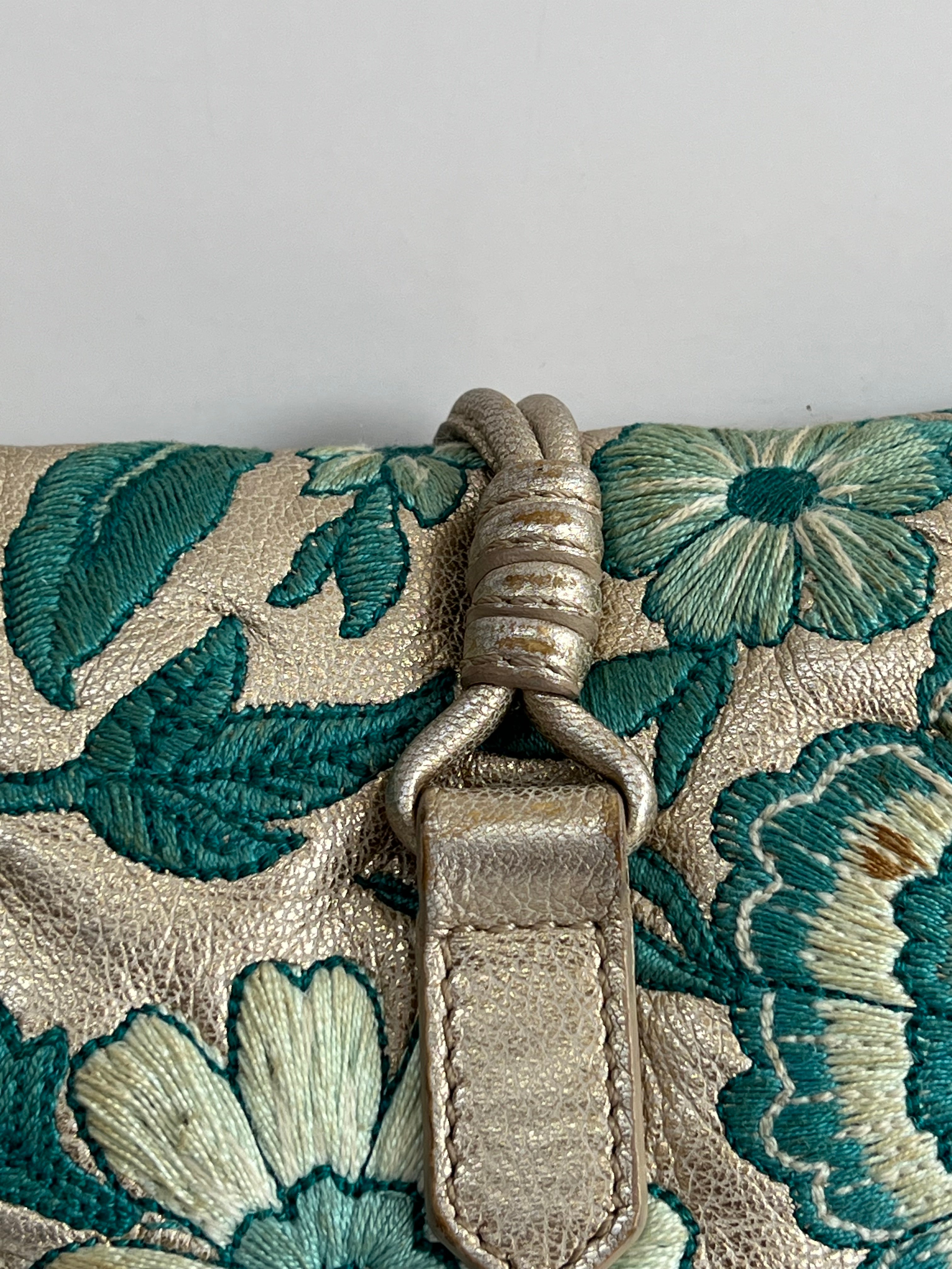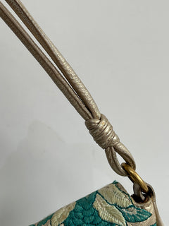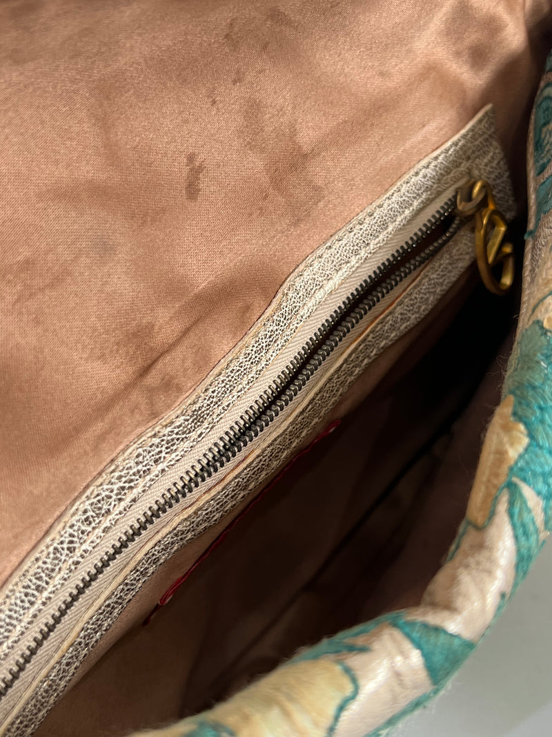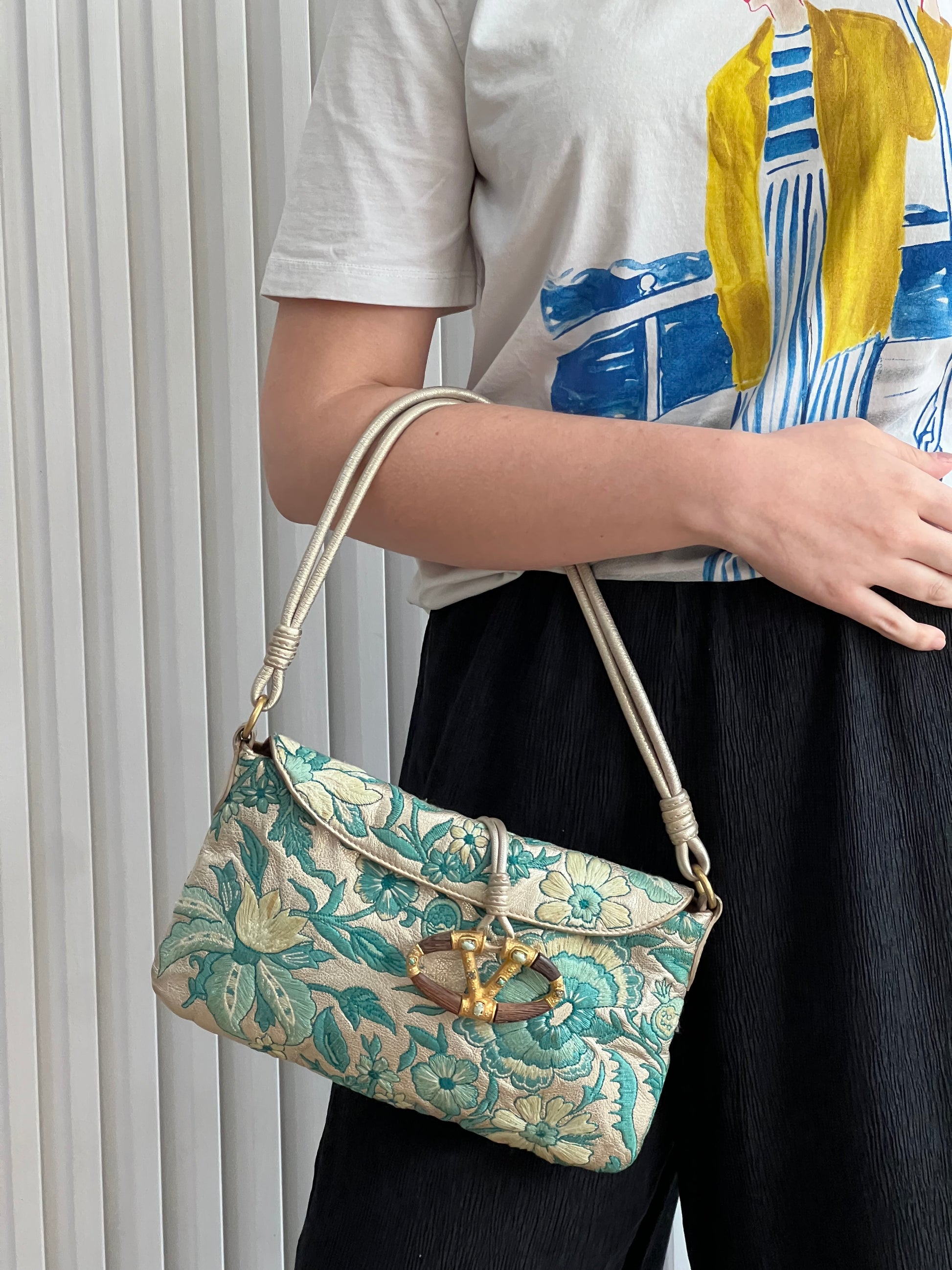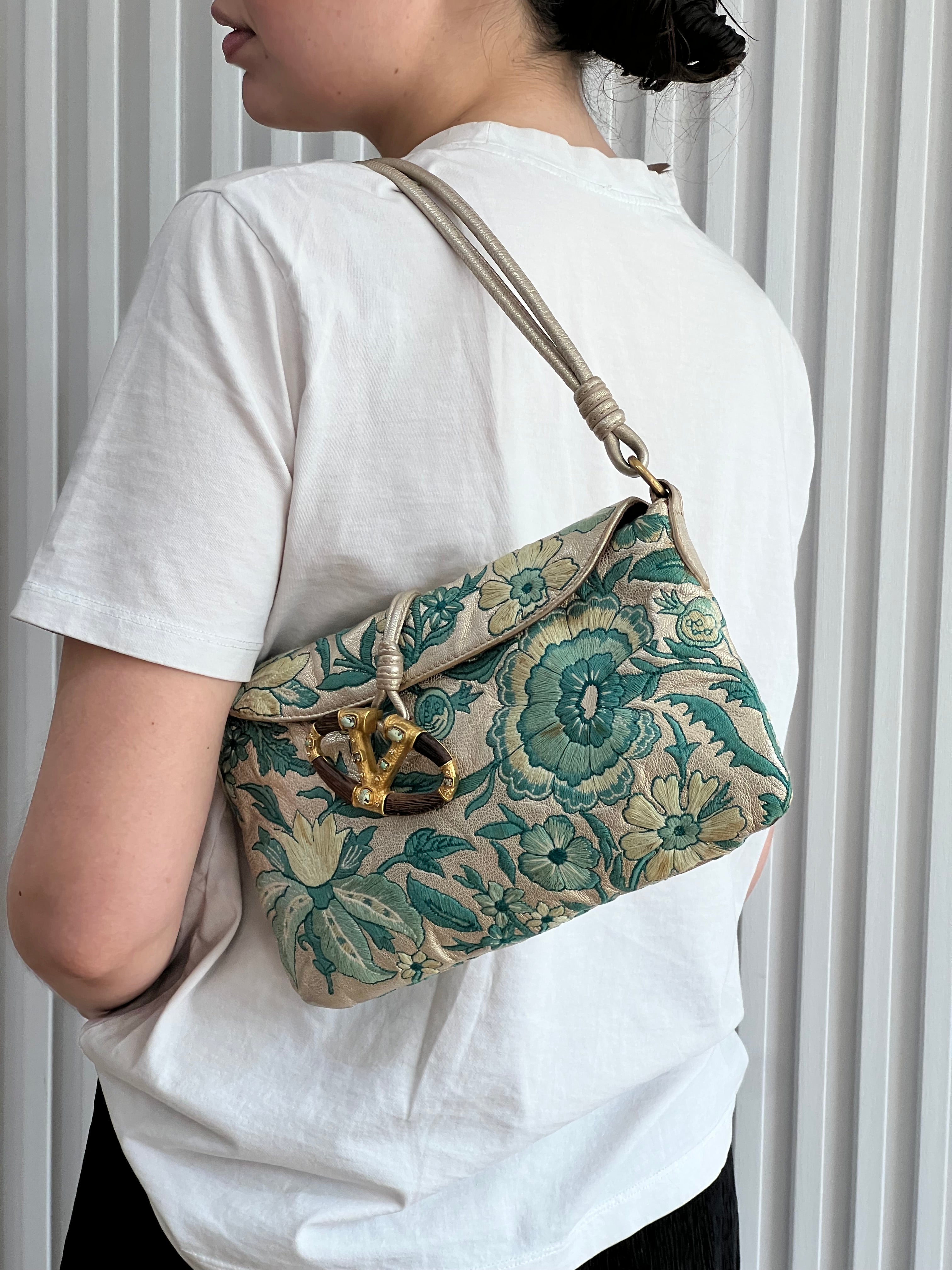 bolso de hombro con cierre de logotipo en dorado. Asa corta doble incorporada. Con compartimento interior de tela con cierre de cremallera. Detalles bordados alrededor, una pieza única edición limitada.