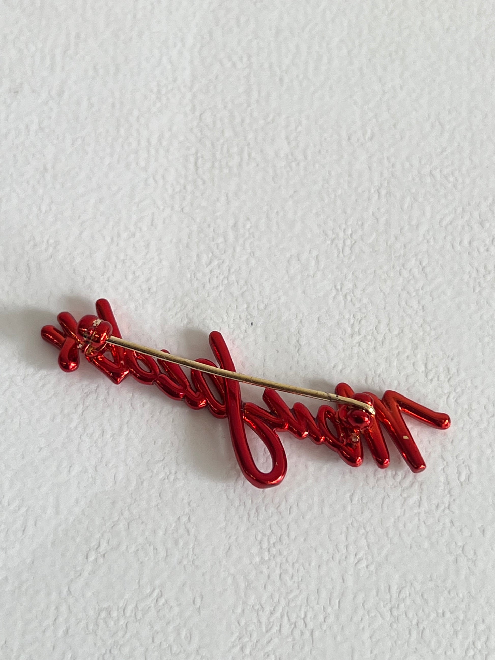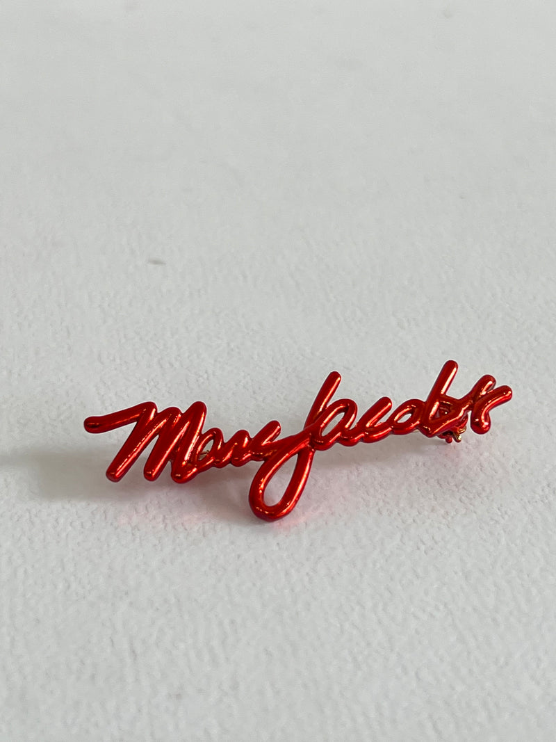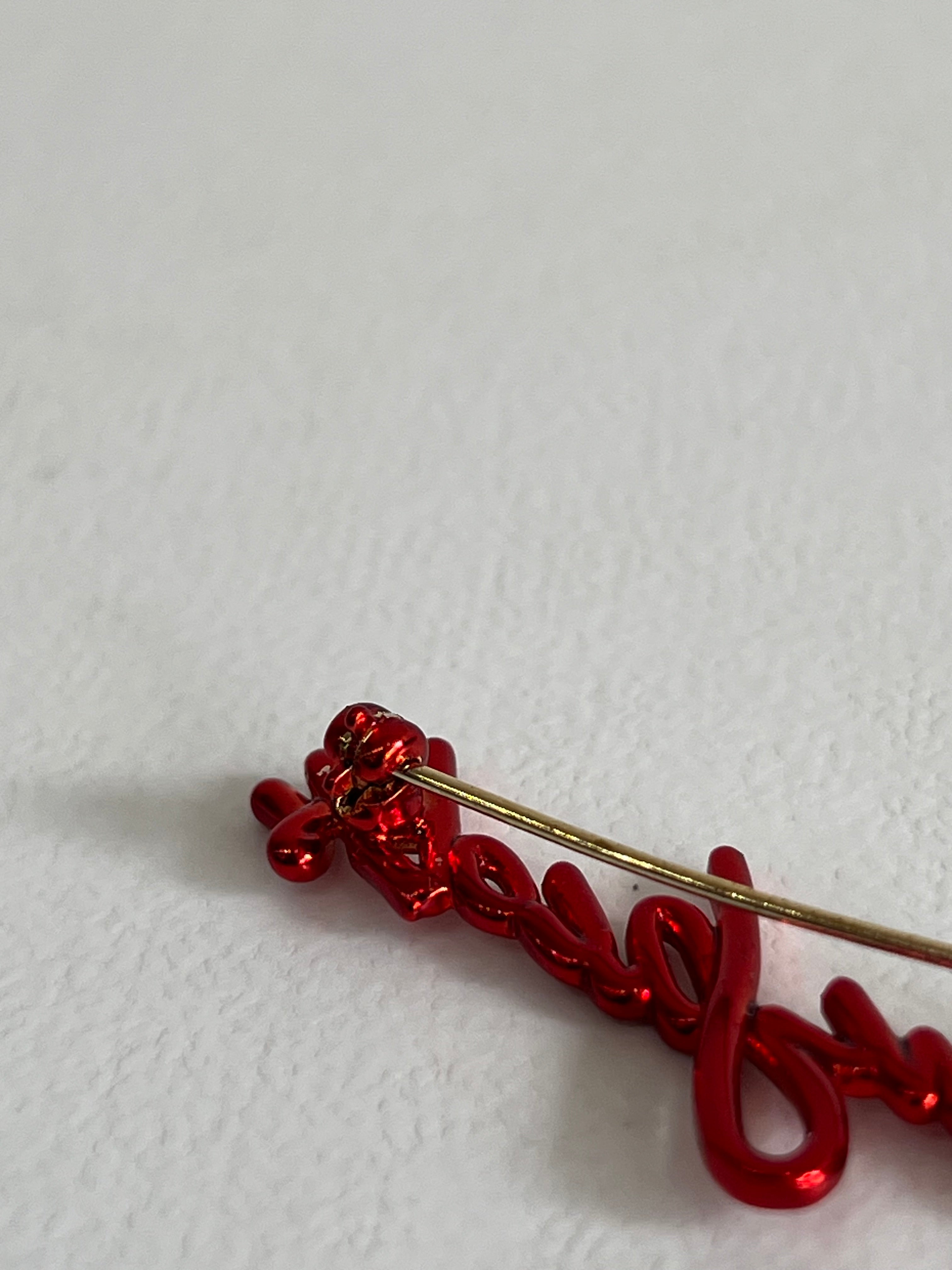 in de metal con acabado rojo, con el logo de la marca en relieve. Cierre tipo alfiler seguro y diseño compacto y sólido.