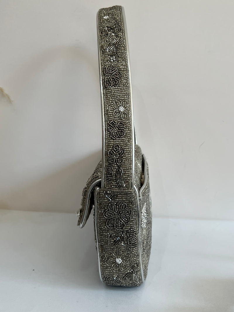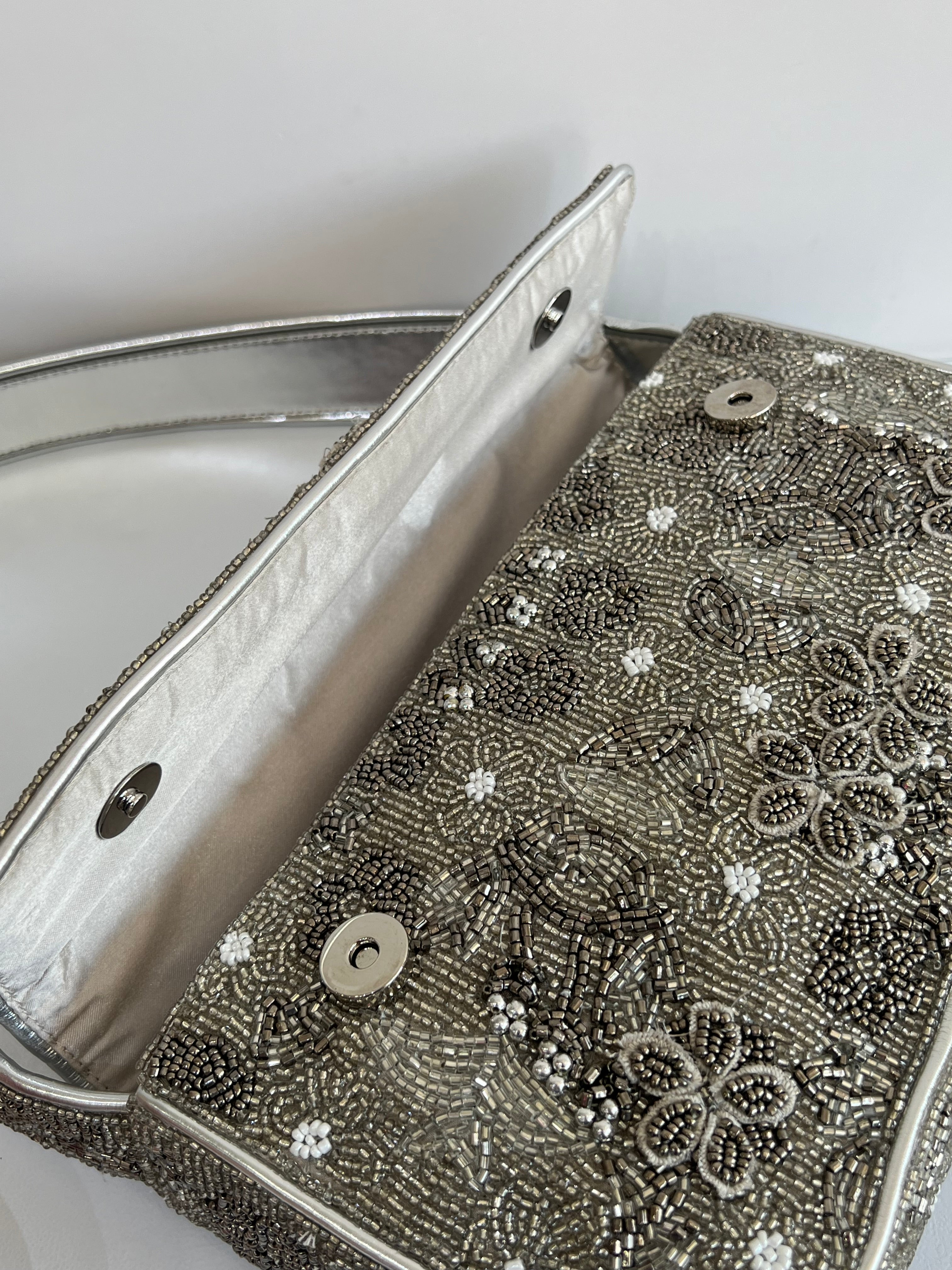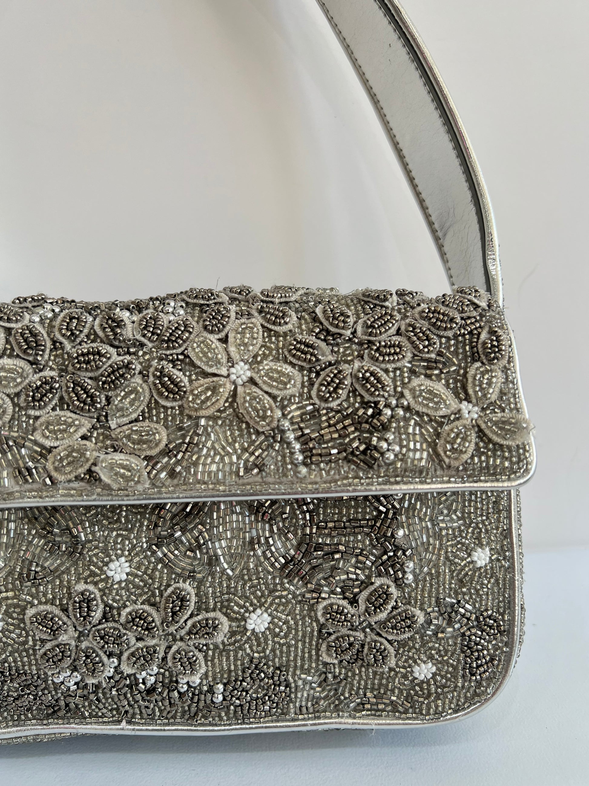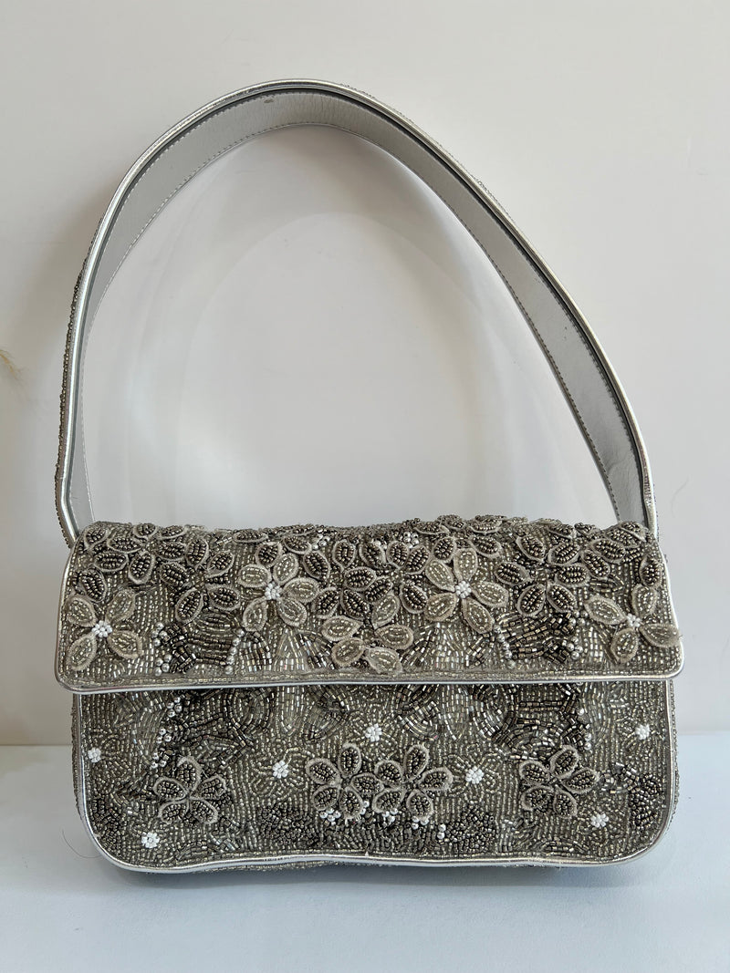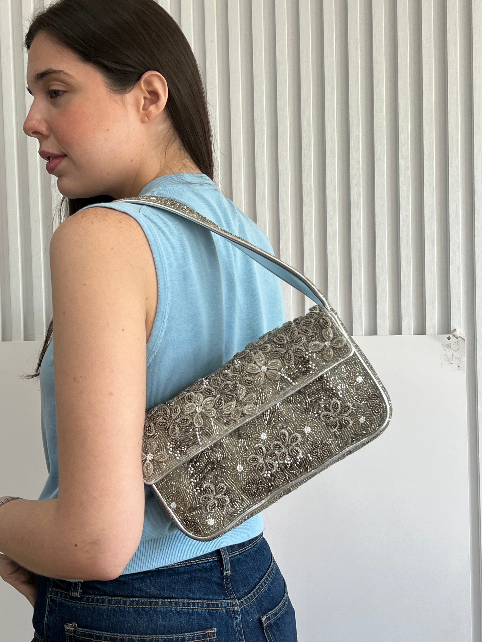 Bolso de hombro en tono plateado con bordados decorativos, diseño estructurado, correa delgada y compartimento principal con cierre superior.