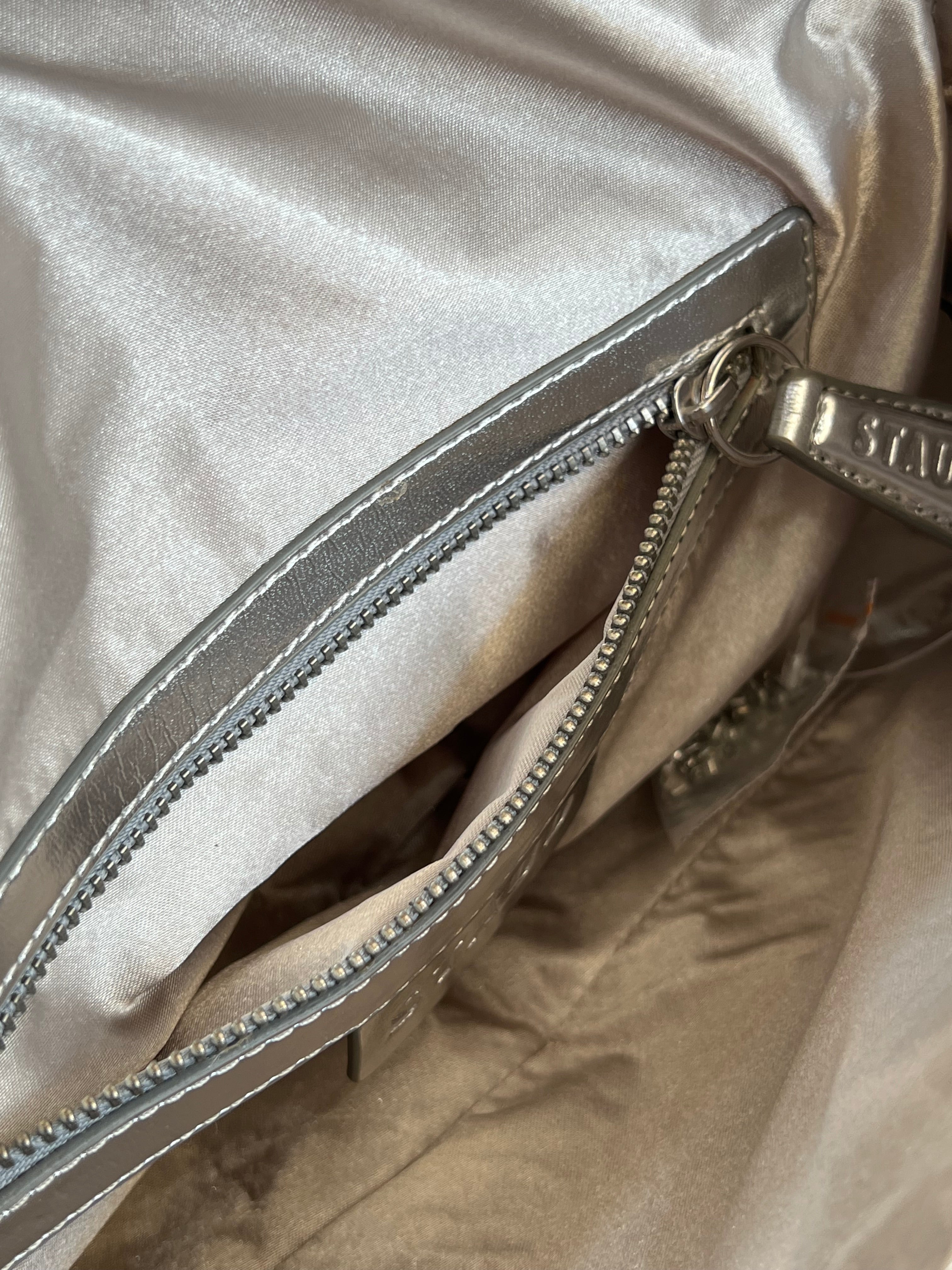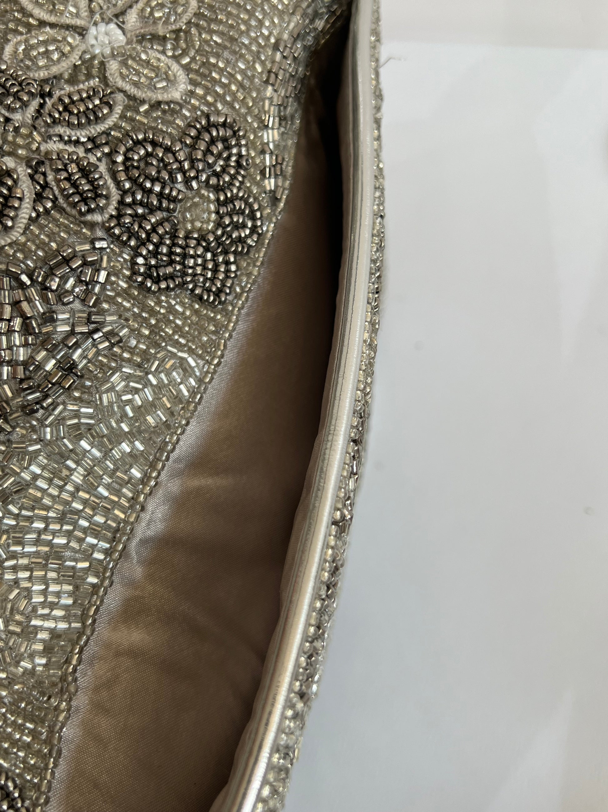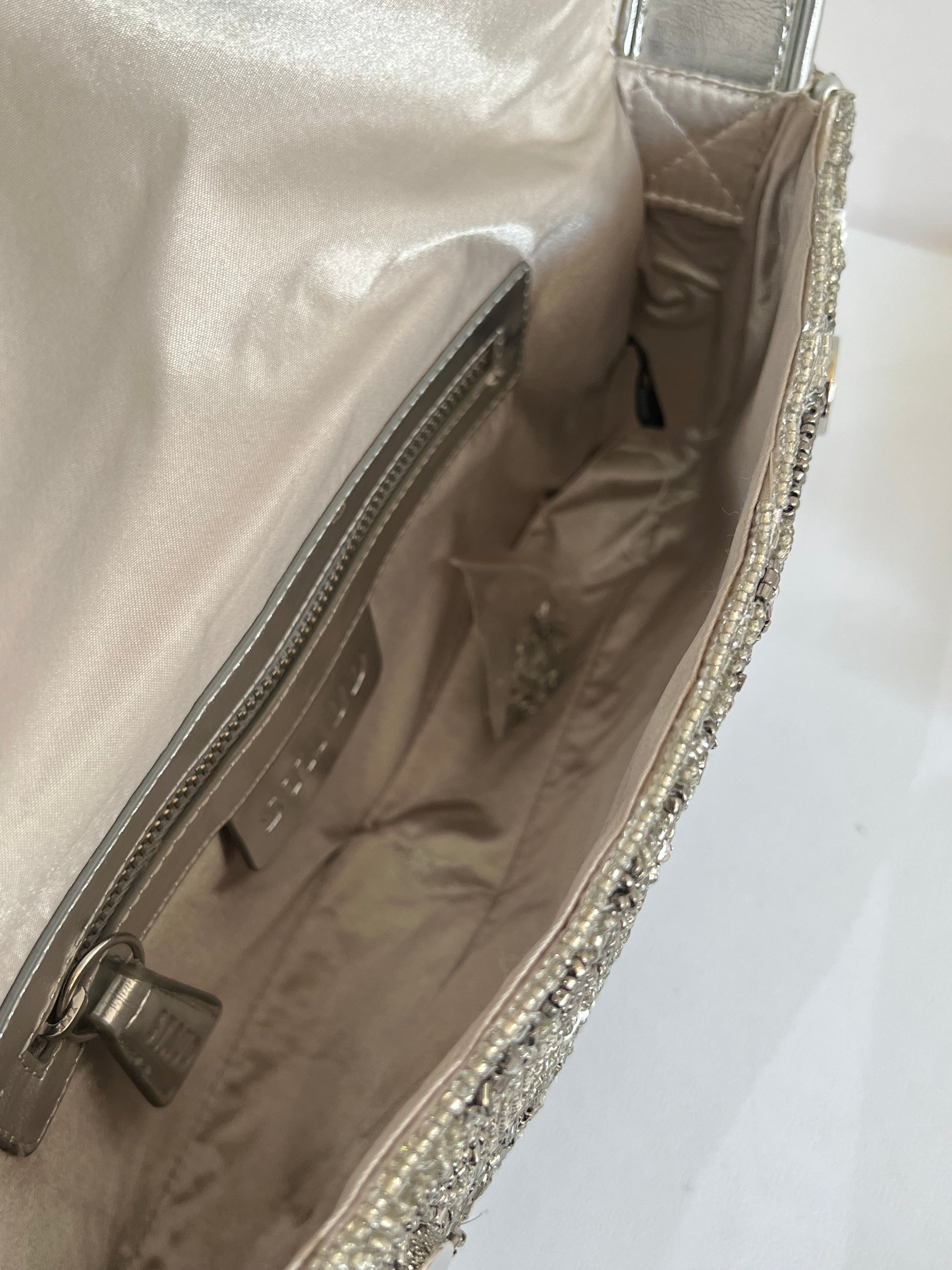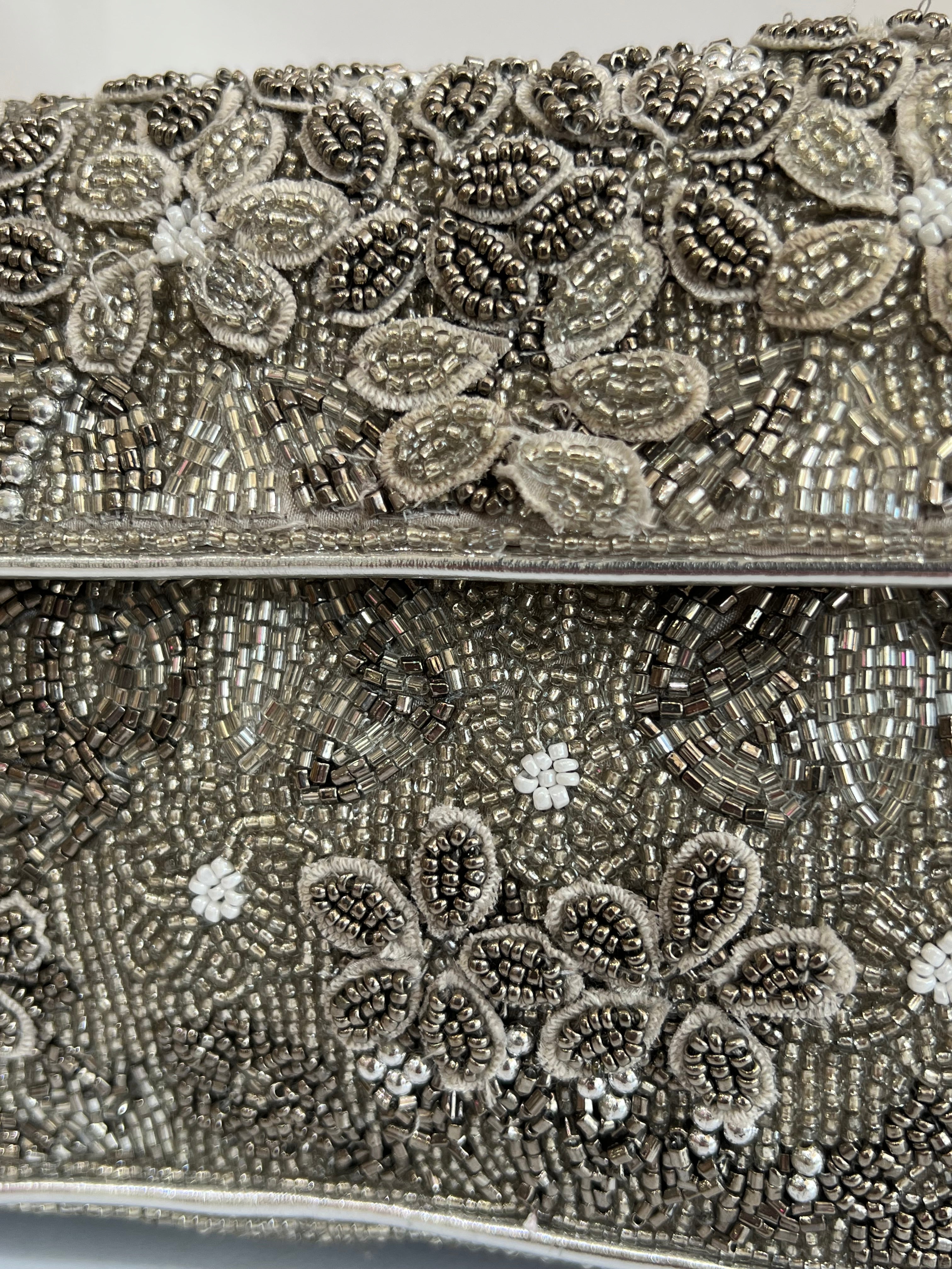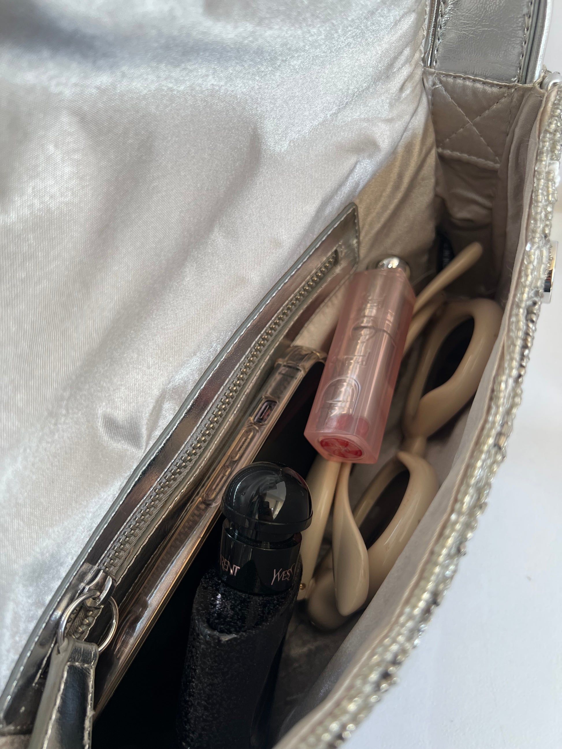 Bolso de hombro en tono plateado con bordados decorativos, diseño estructurado, correa delgada y compartimento principal con cierre superior.
