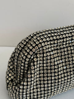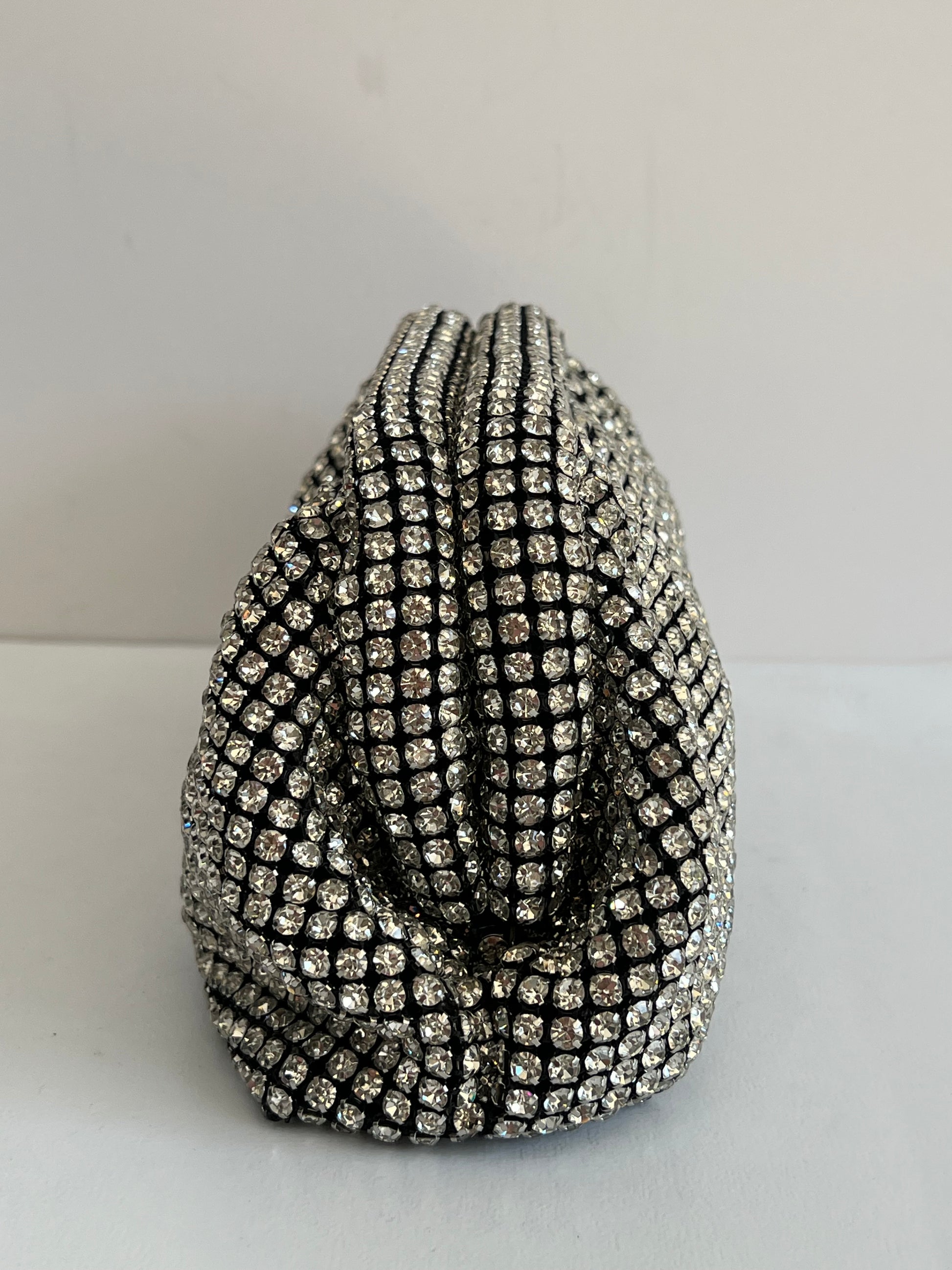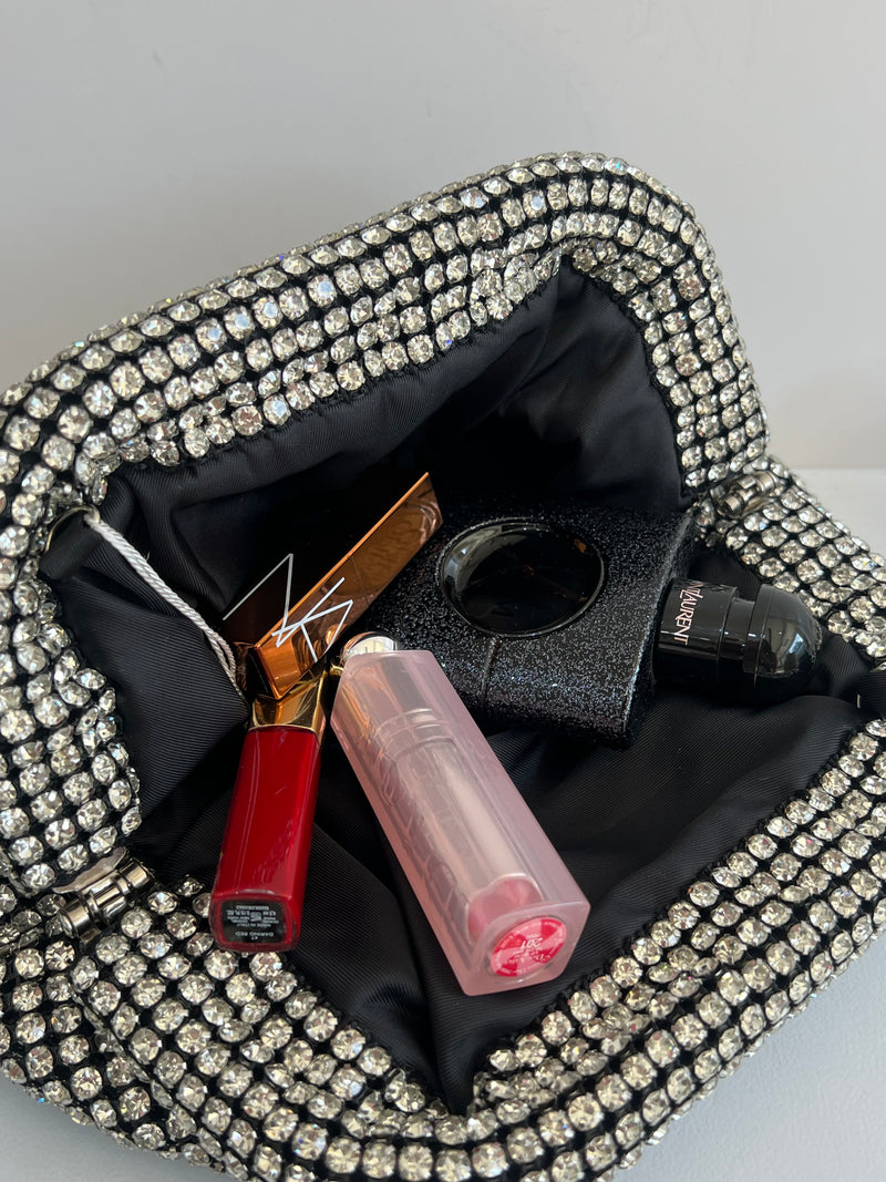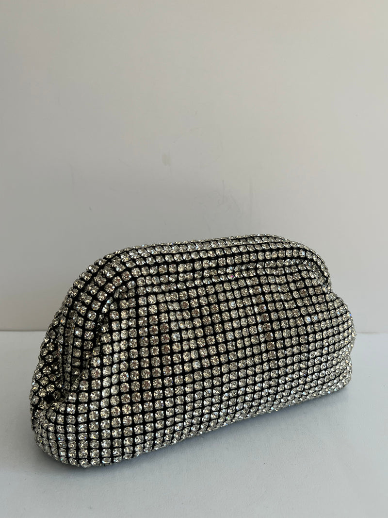 Clutch de tamaño pequeño con acabado glitter en toda la superficie. Tiene estructura rígida, cierre metálico en la parte superior.