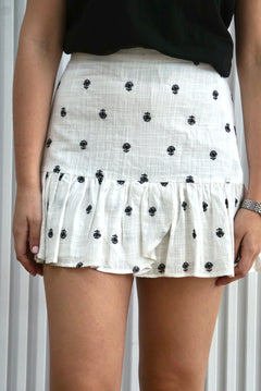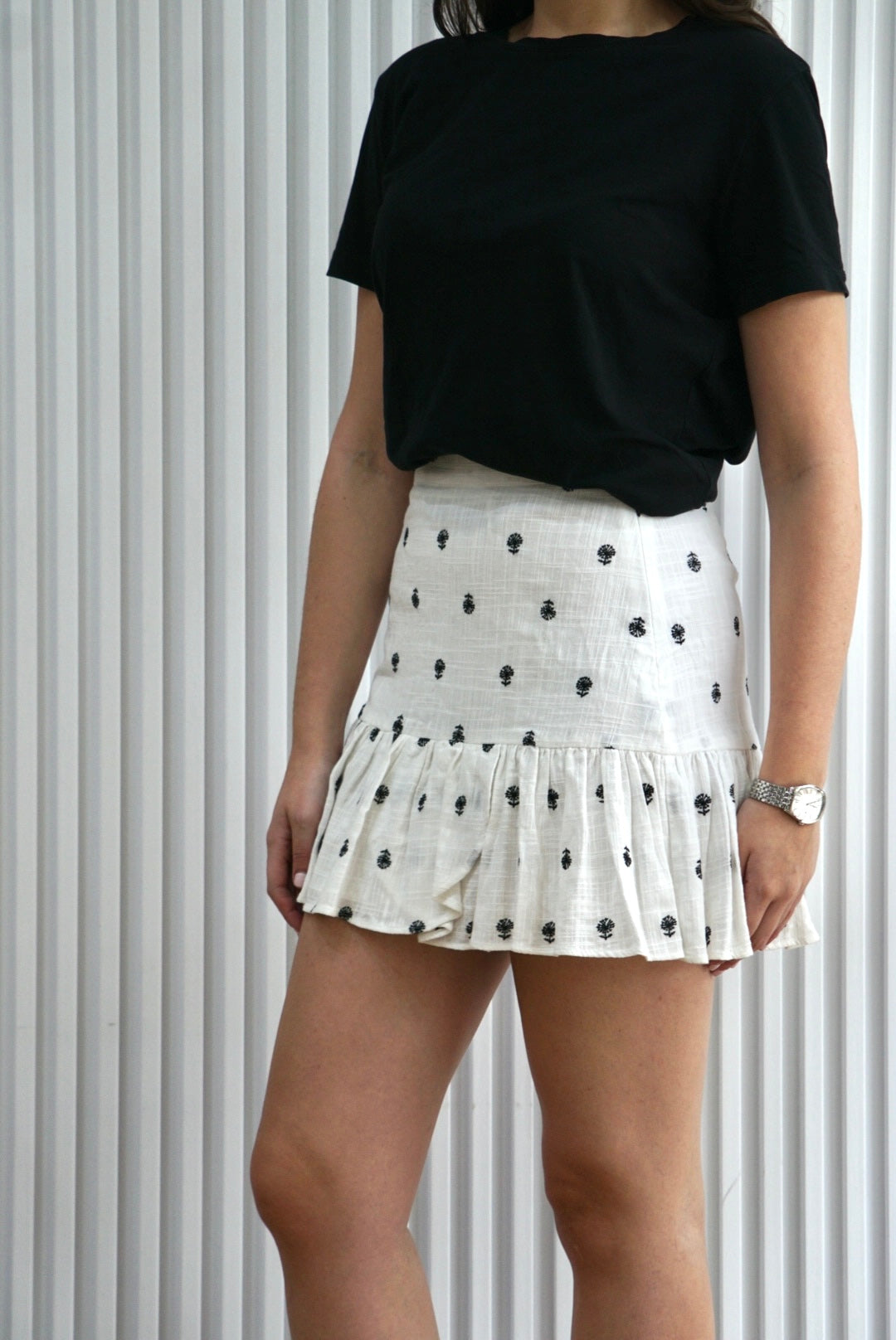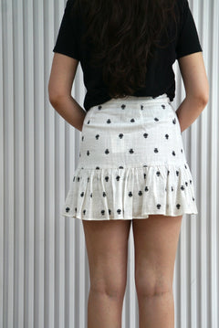 Mini falda con detalles bordados, ideal para climas cálidos.
