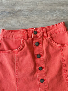 Está mini falda denim tiene un cierre de botones en la parte frontal, cuenta con cuatro bolsillos funcionales, dos al frente y dos atrás. Ideal para uso diario.