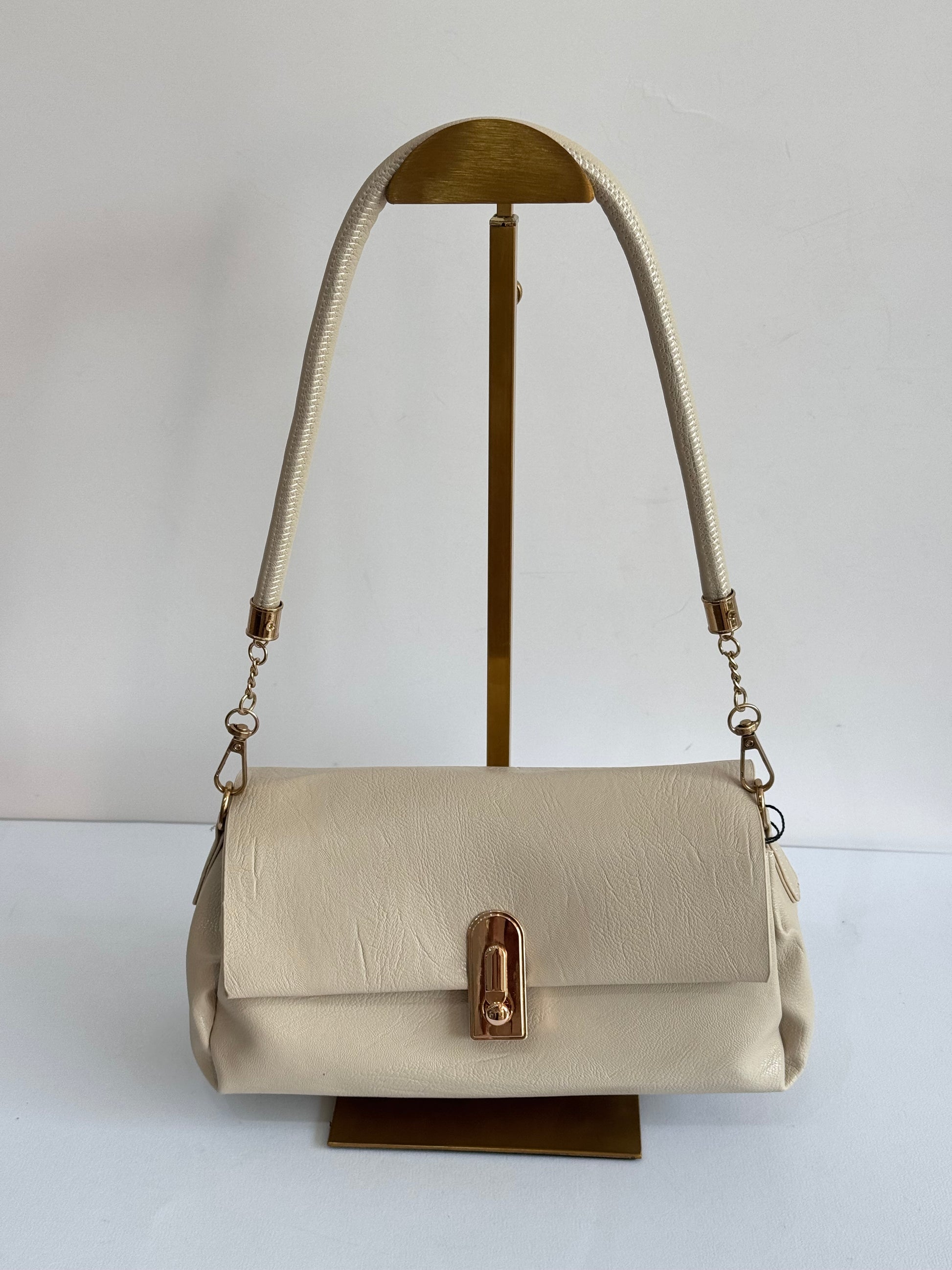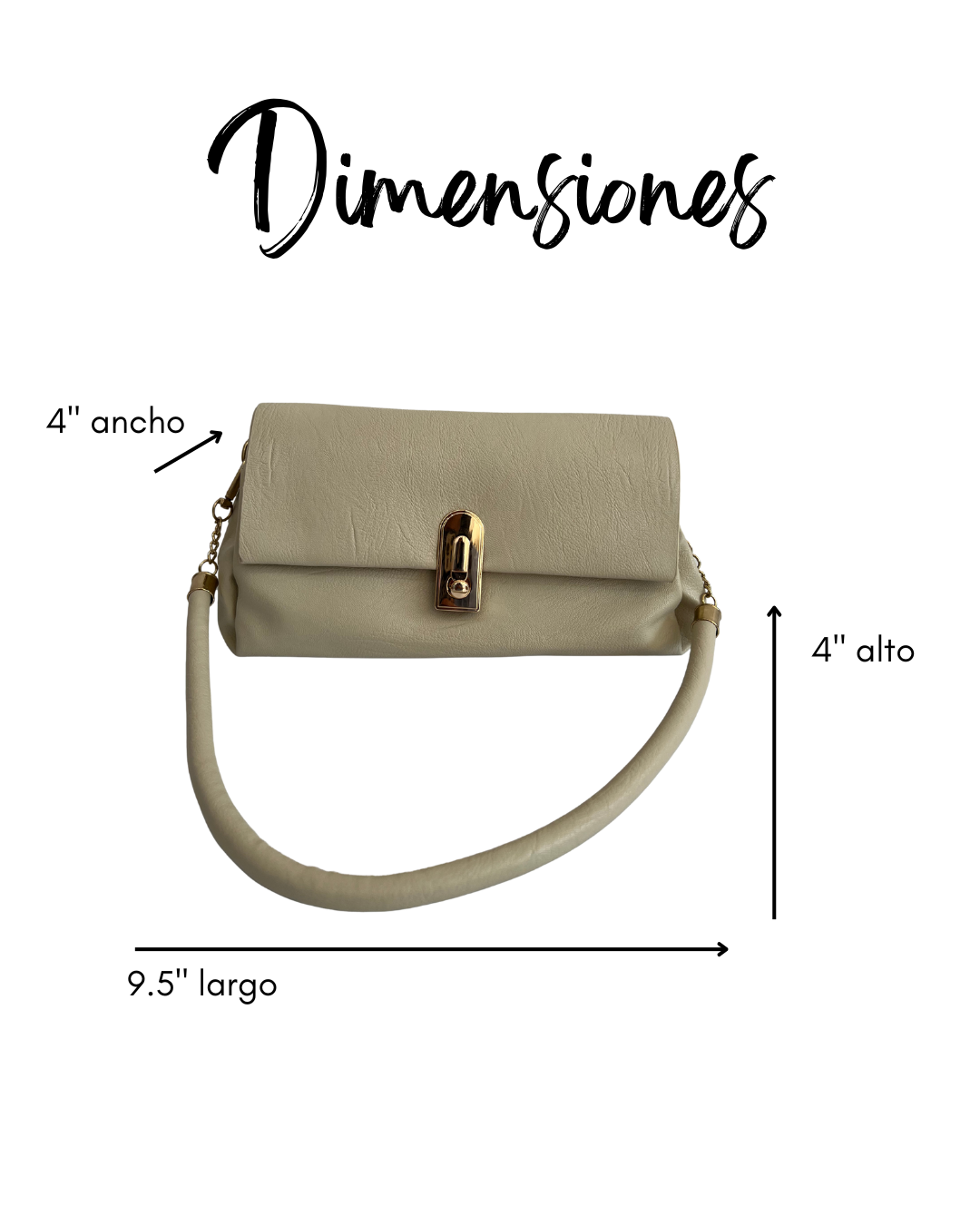 Es un bolso compacto en beige con cuero sintetico, con correa larga ajustable para llevar cruzado al cuerpo, tambien correa corta para usarla como shoulder bag.