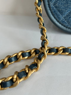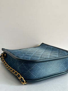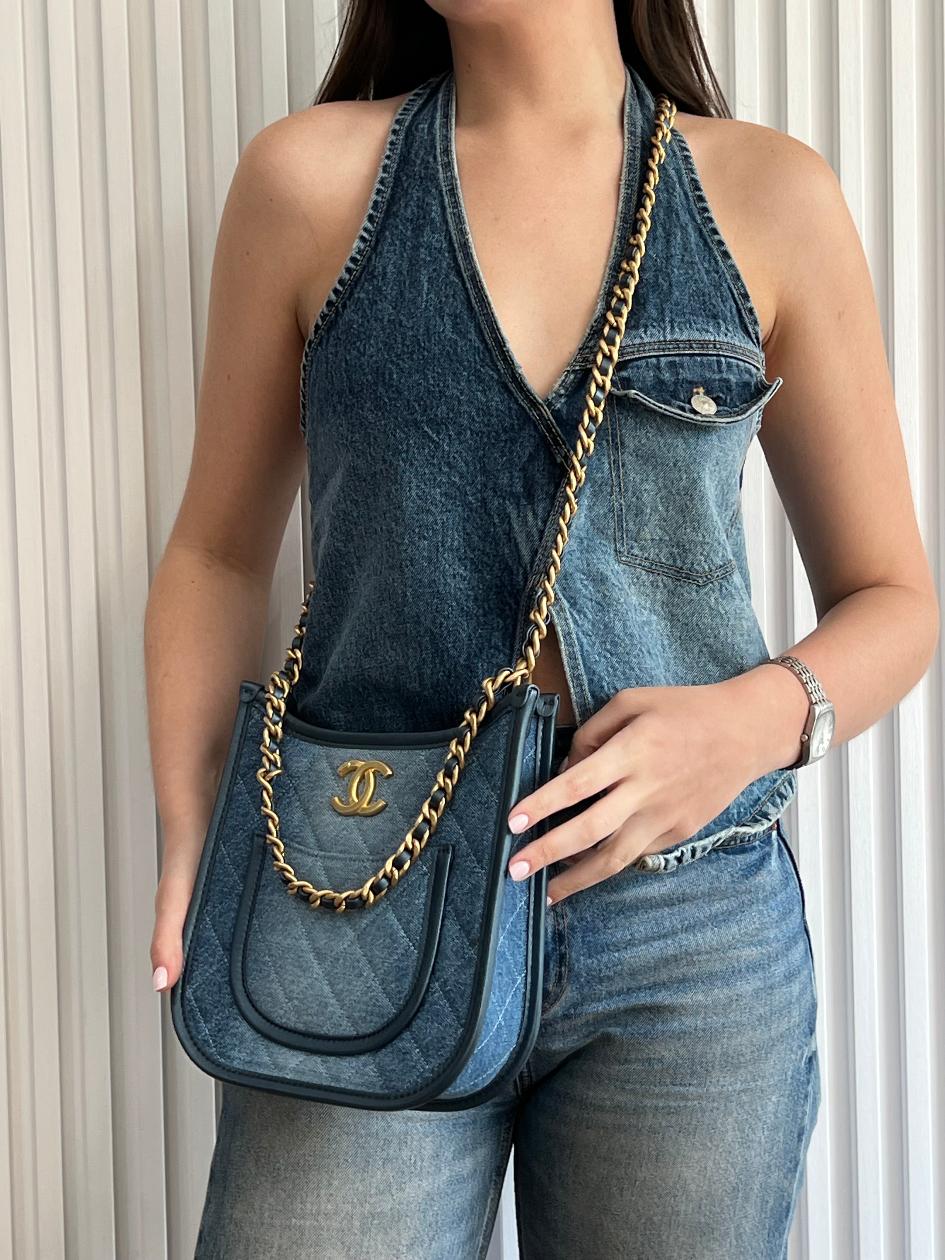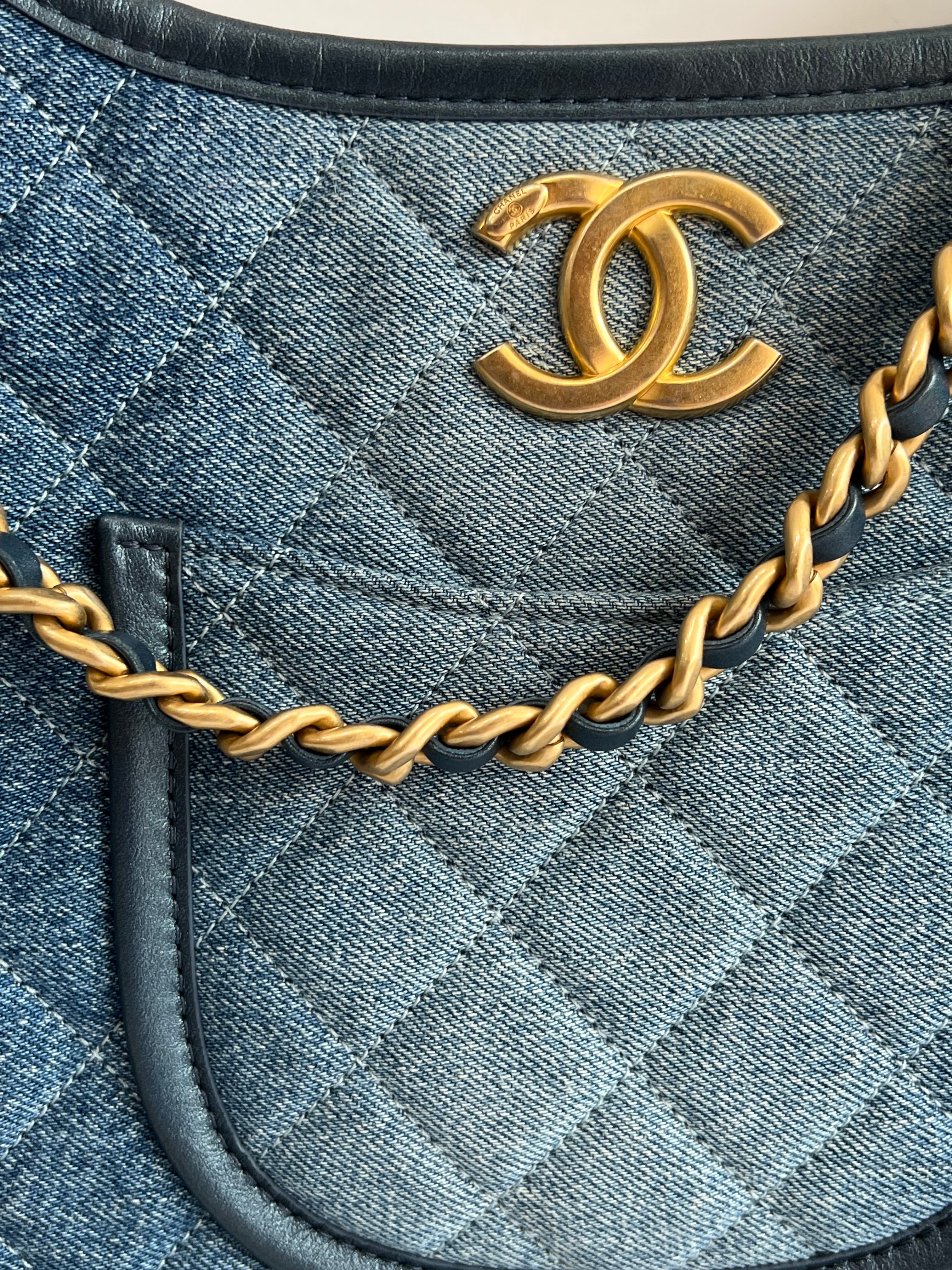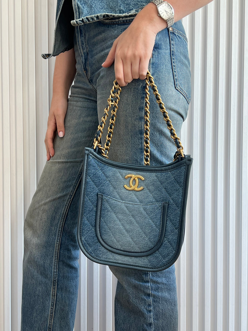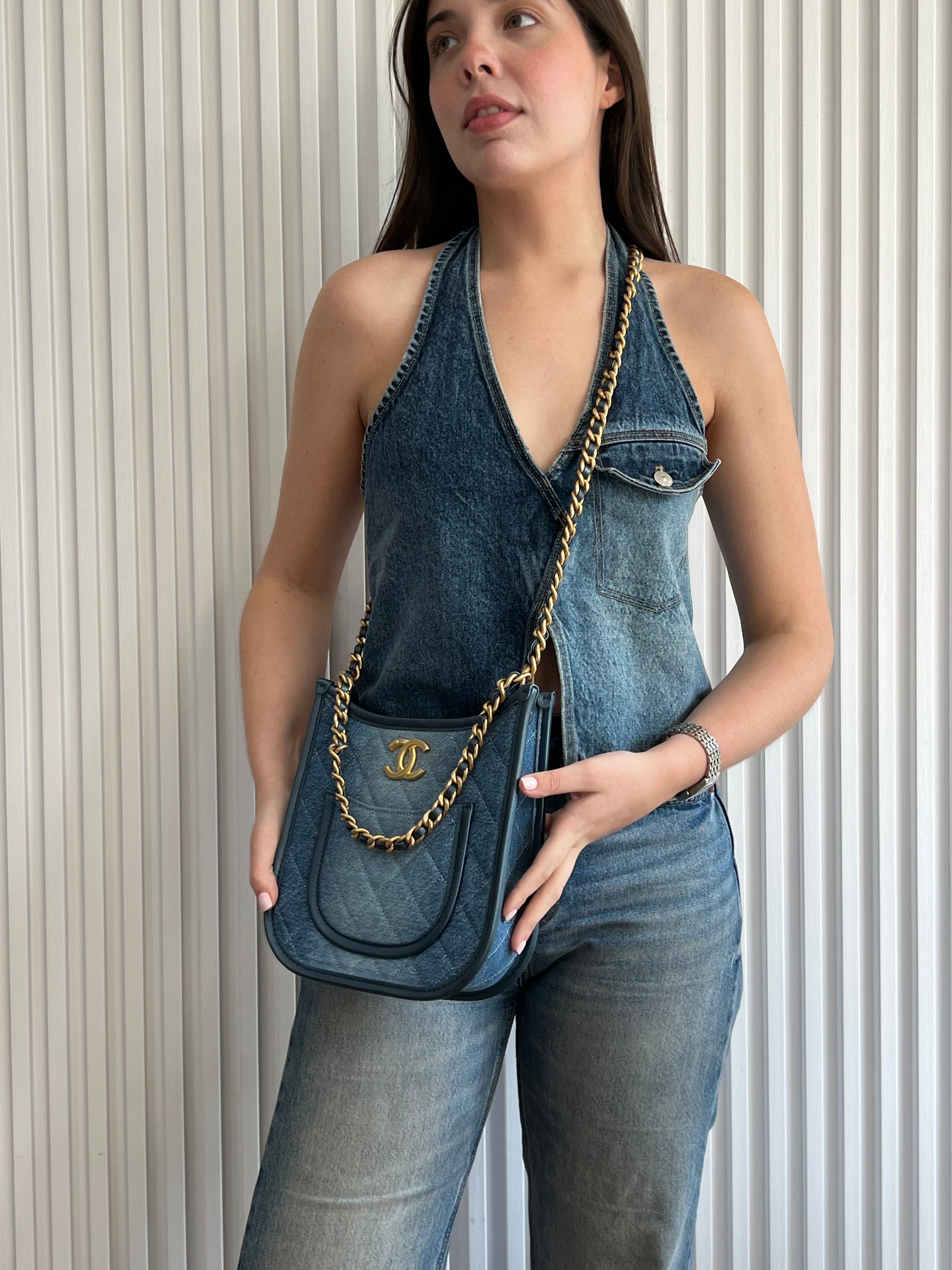 Bolso en canvas vaquero lavado con costura acolchada “quilted”, combinación de piel y hardware metálico. Incluye asa cadena/envuelta en piel, cierre tipo snap (imán) y bolsillo interior con cierre para organización.