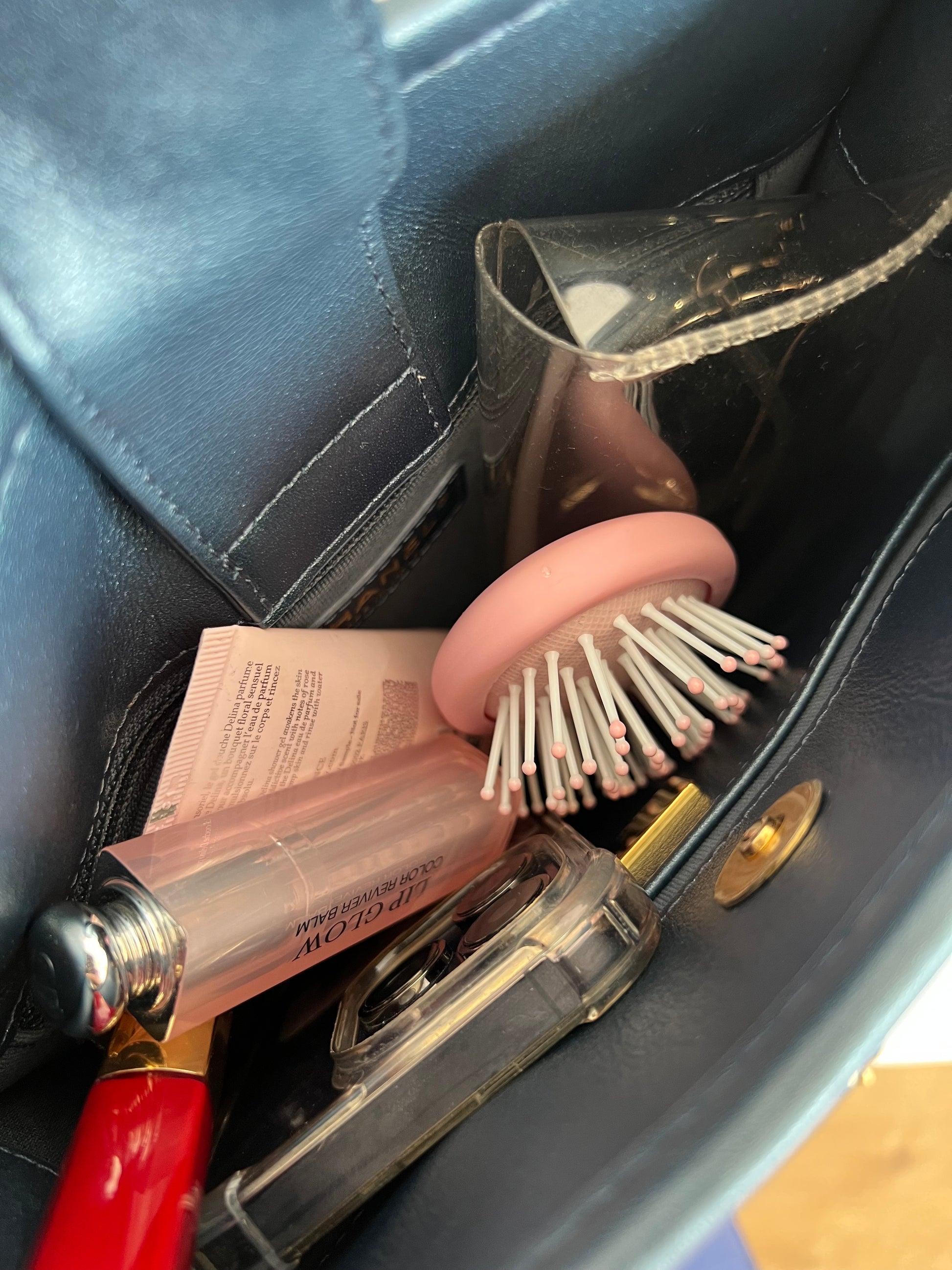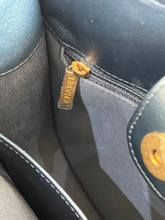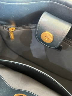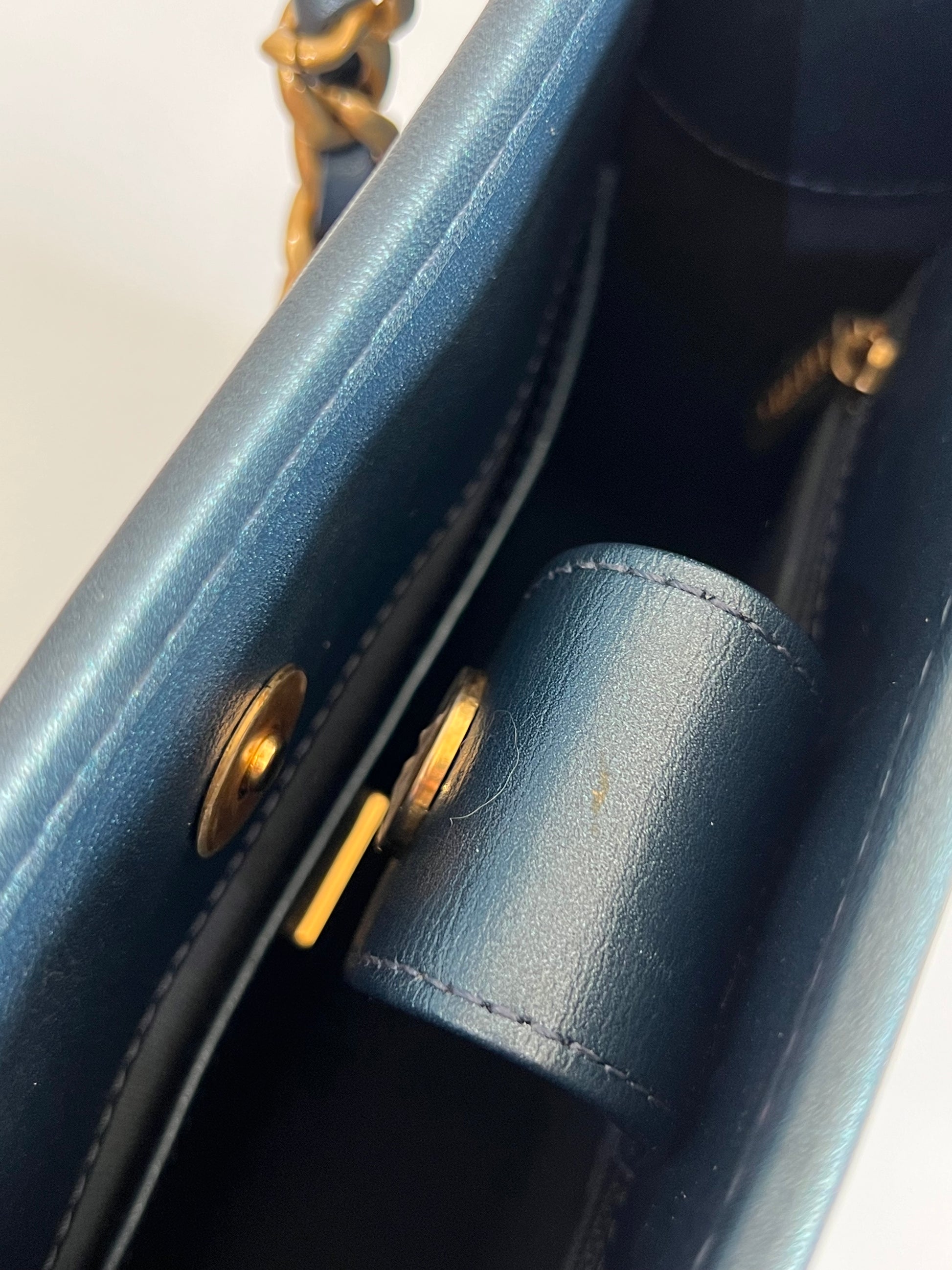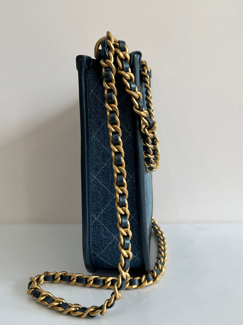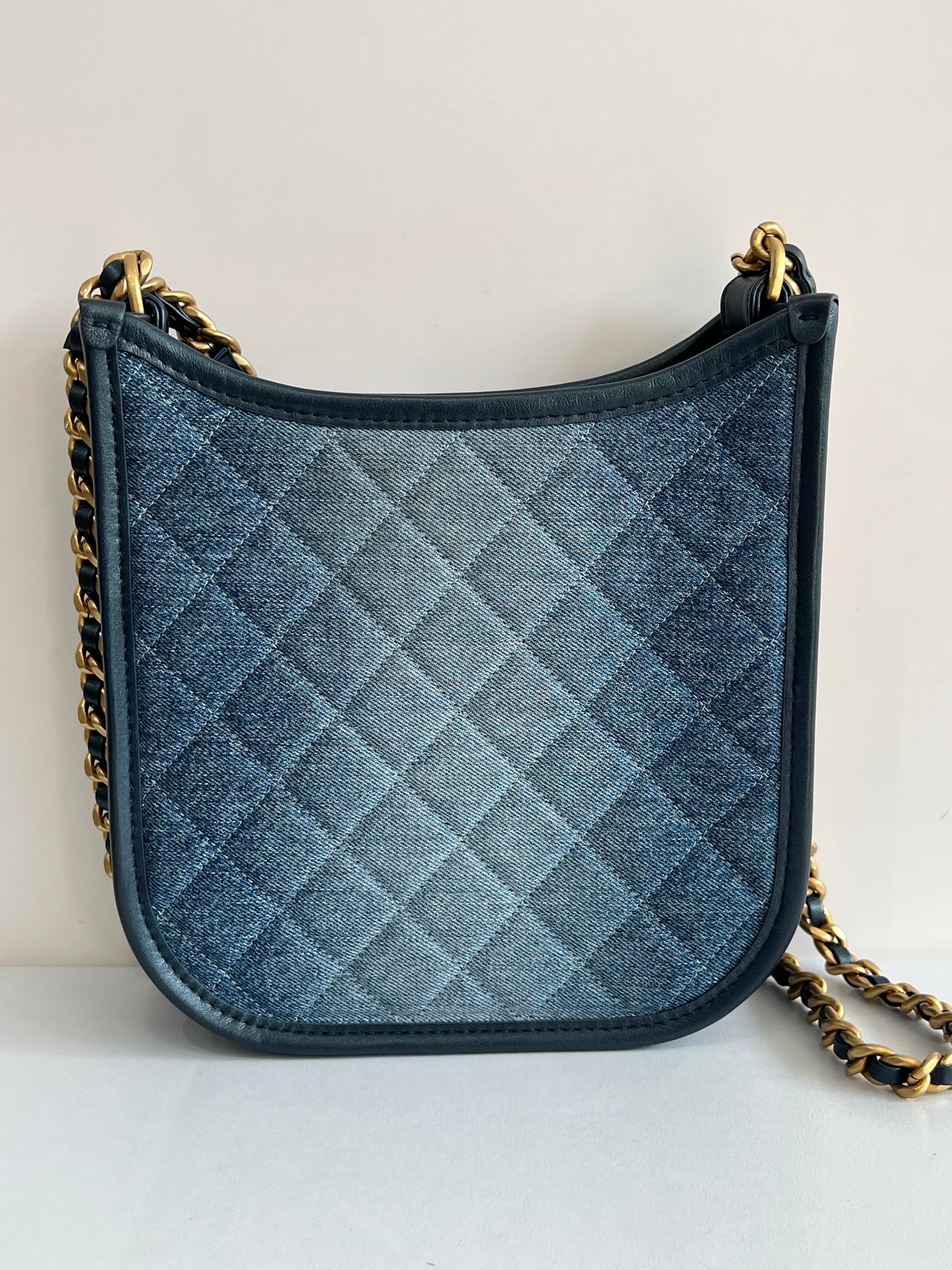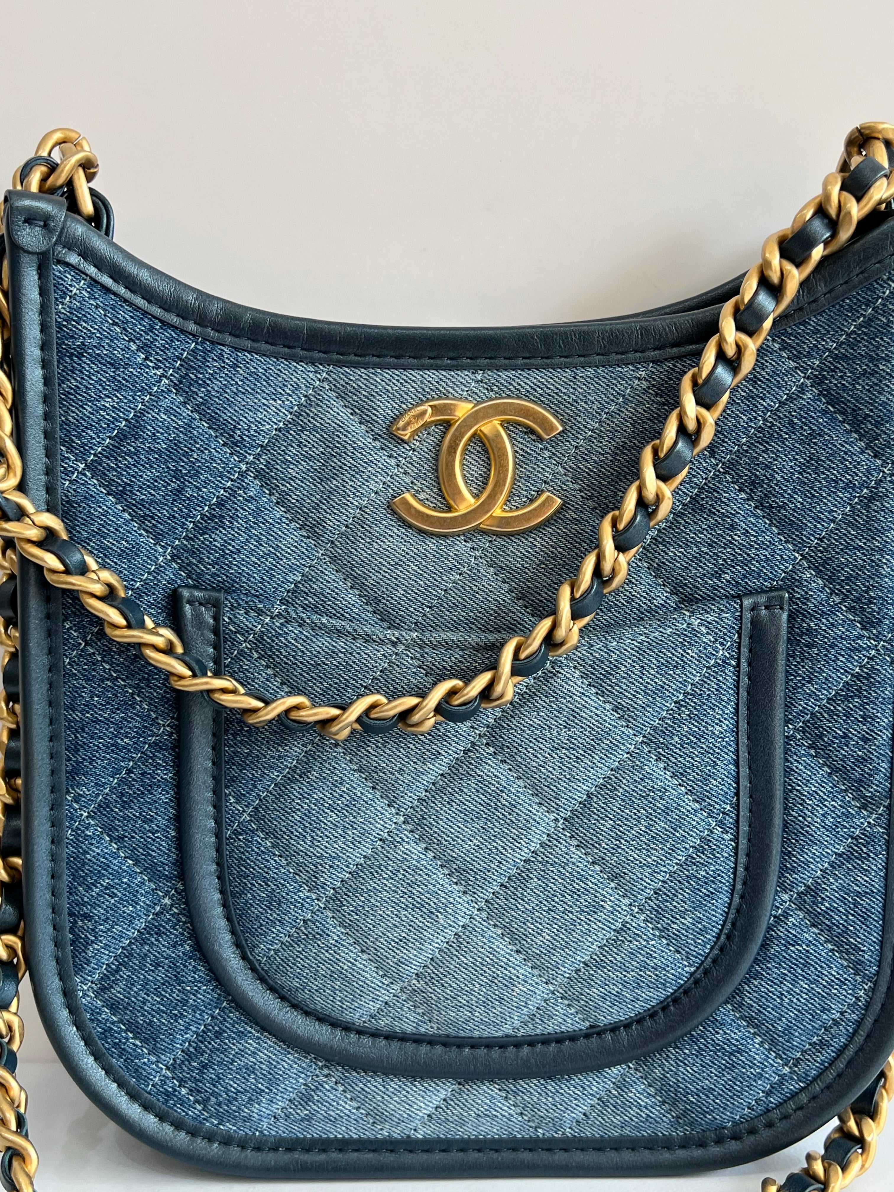 Bolso en canvas vaquero lavado con costura acolchada “quilted”, combinación de piel y hardware metálico. Incluye asa cadena/envuelta en piel, cierre tipo snap (imán) y bolsillo interior con cierre para organización.