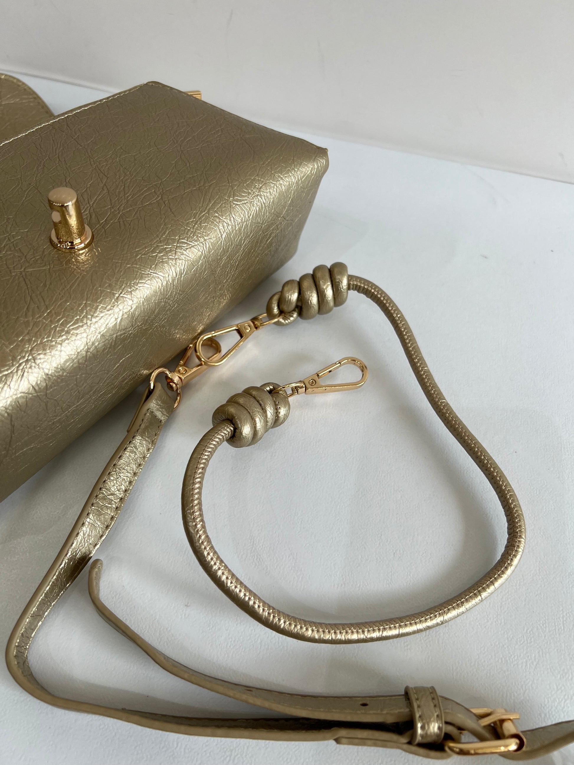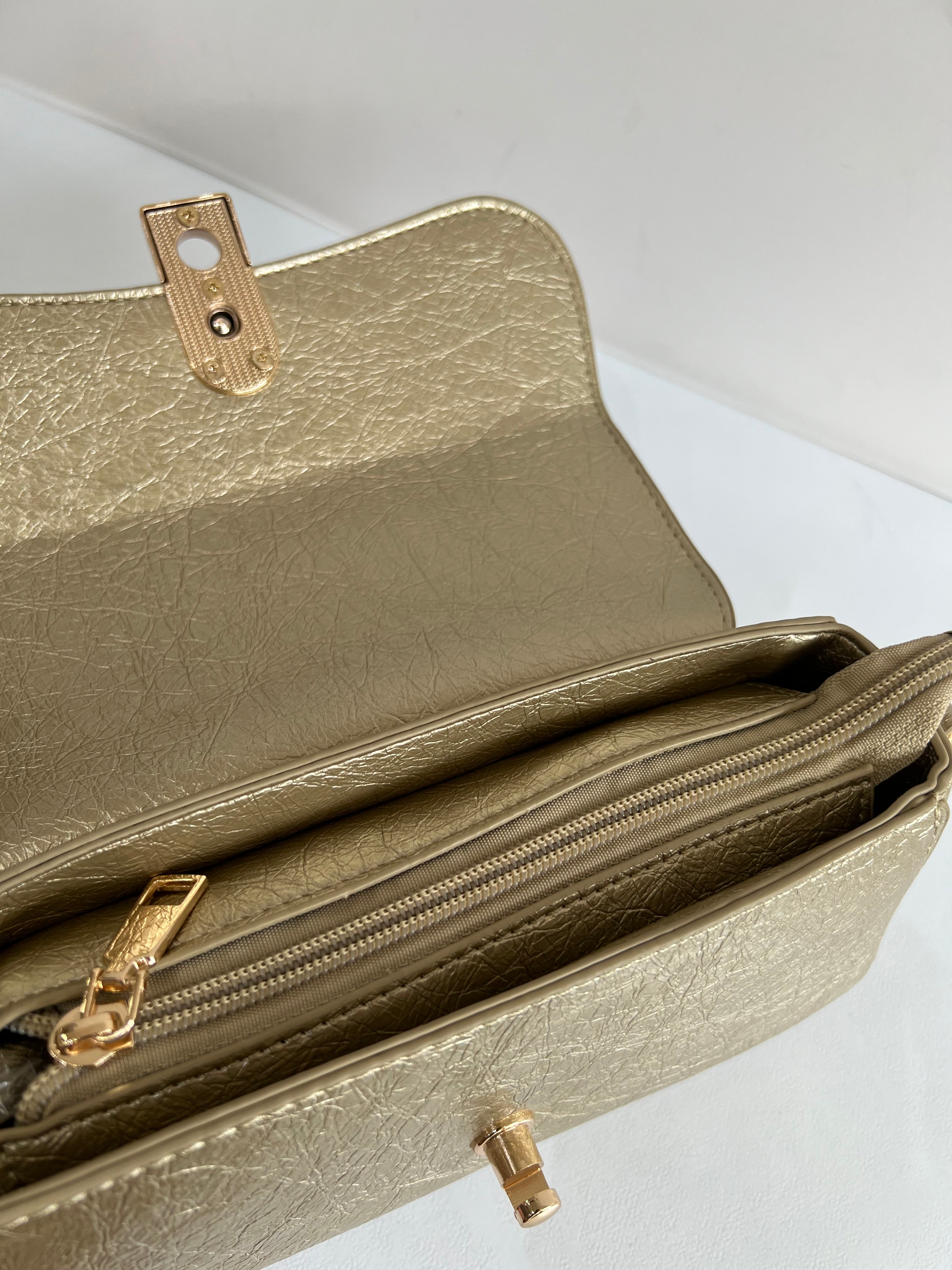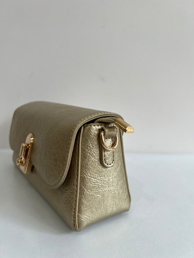 Es un bolso compacto en acabado dorado metálico, con correa larga ajustable para llevar cruzado al cuerpo, tambien correa corta para usarla como shoulder bag.