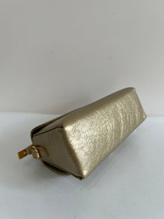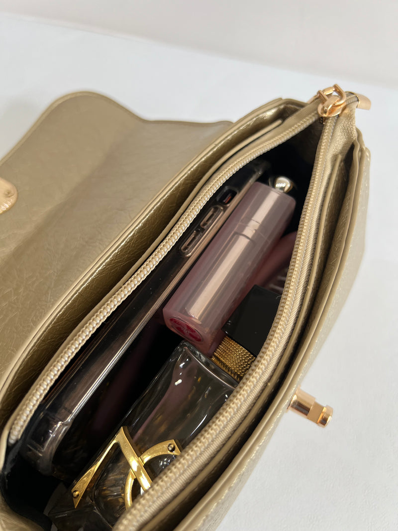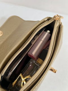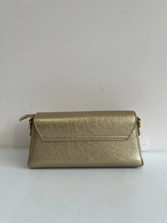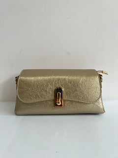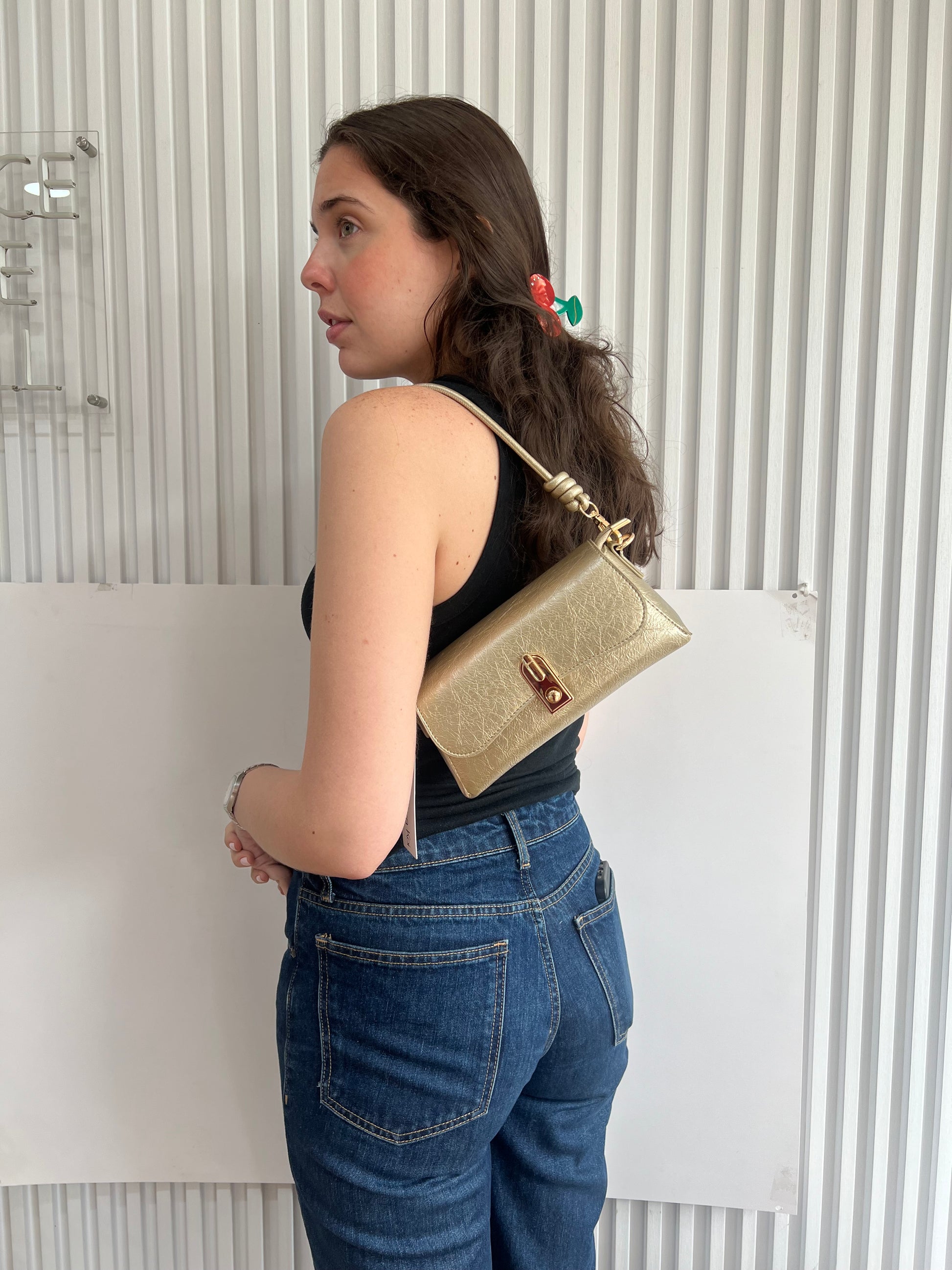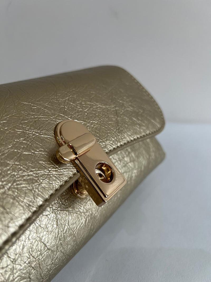 Es un bolso compacto en acabado dorado metálico, con correa larga ajustable para llevar cruzado al cuerpo, tambien correa corta para usarla como shoulder bag.