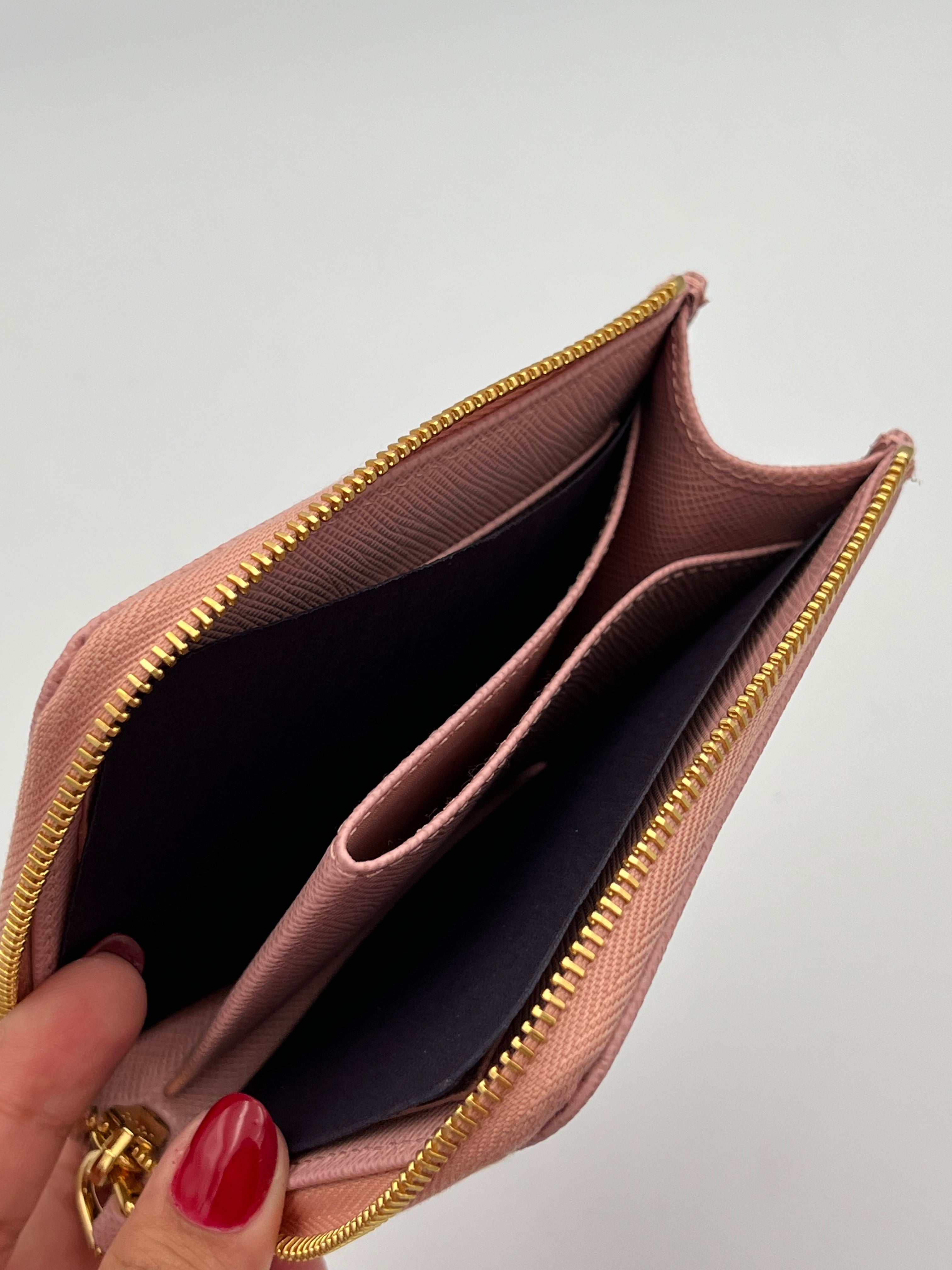 Es una cartera compacta de piel Saffiano con el icónico logo triangular de Prada en el exterior y cierre con cremallera alrededor para mayor seguridad en forma diagonal. En su interior incluye varios compartimentos para billetes y múltiples ranuras para tarjetas.