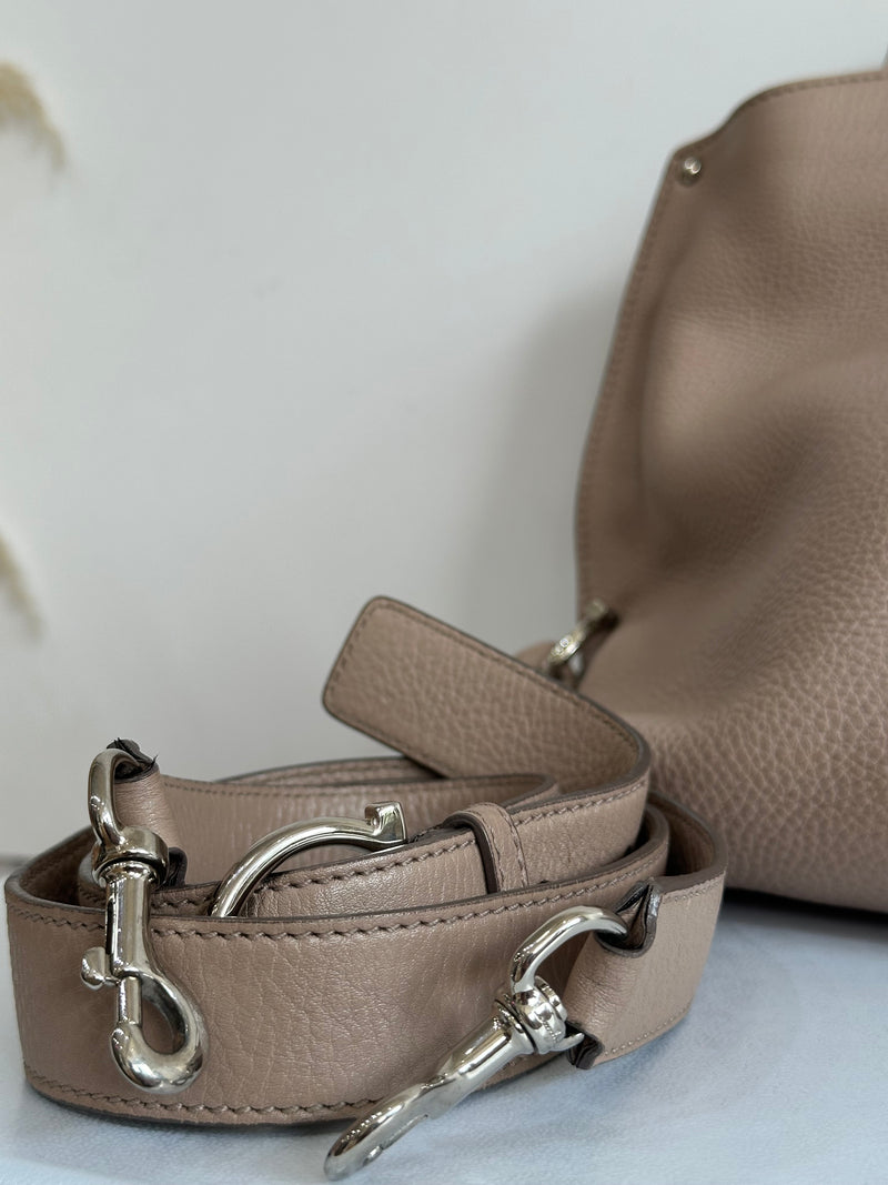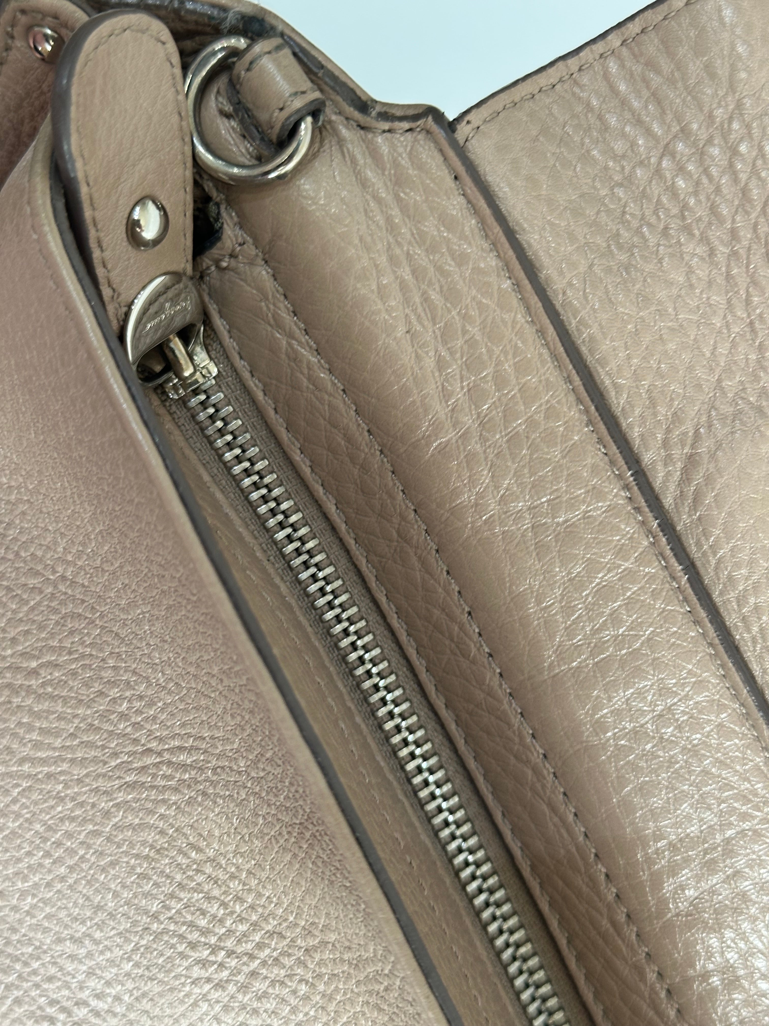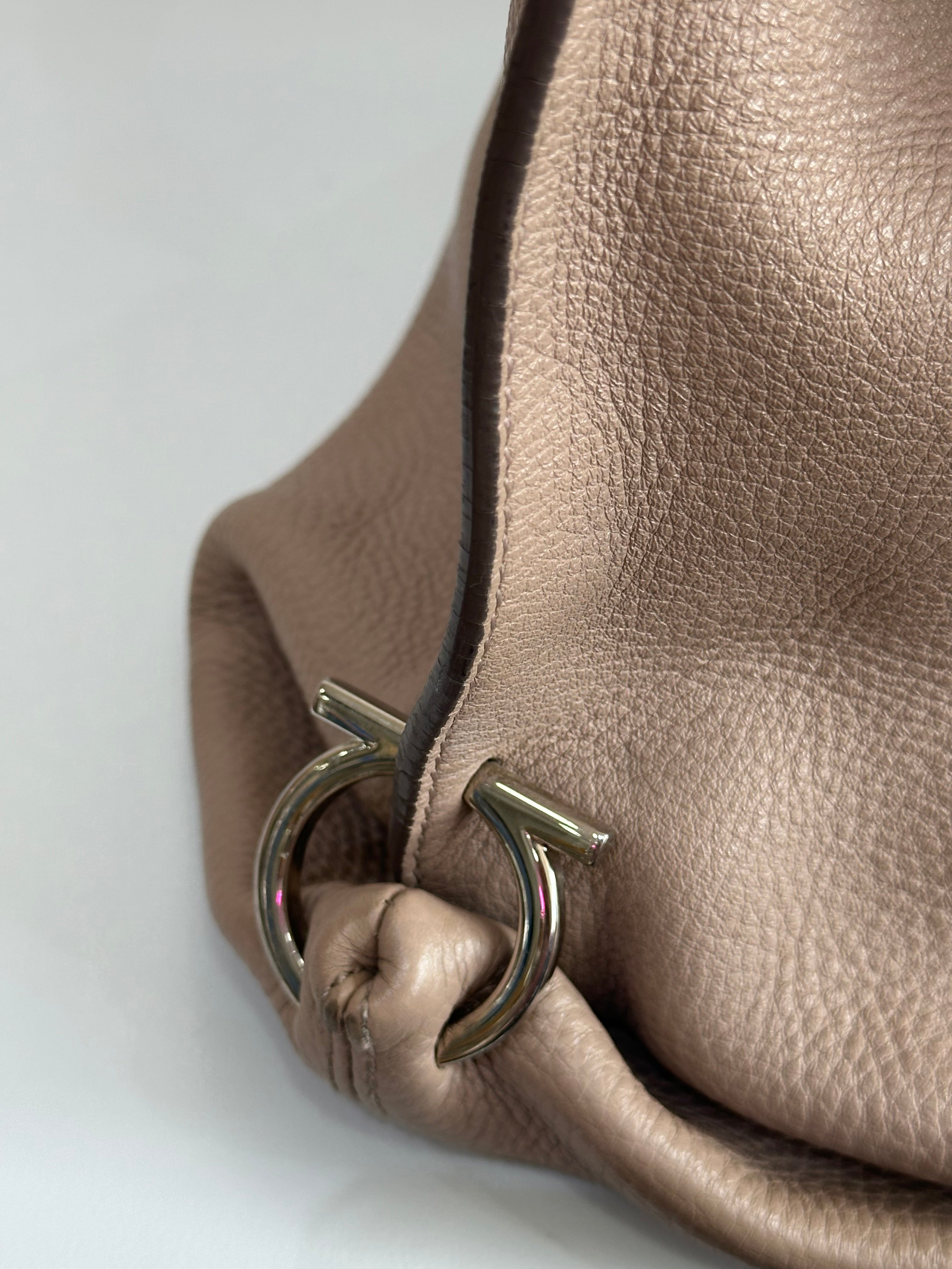 El interior, forrado en tela, incluye un bolsillo con cremallera y un bolsillo plano, ofreciendo organización adicional. Presenta un diseño estructurado con el icónico cierre Gancini dorado. Con asa corta y una correa de hombro ajustable y desmontable.