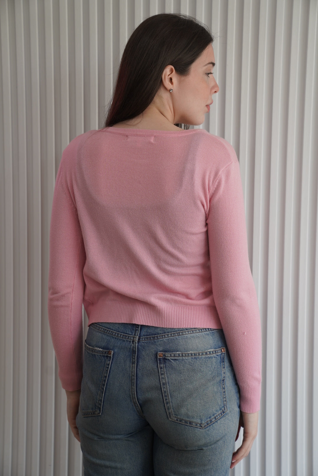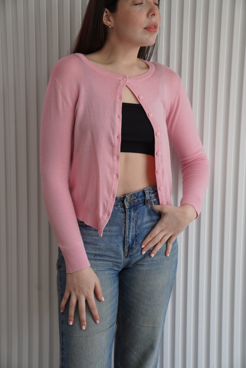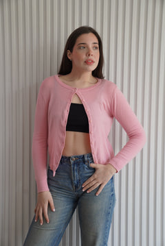 Este suéter de tela muy ligera cuenta con cierre de botones.