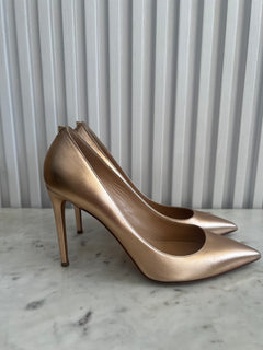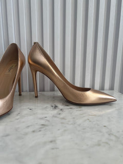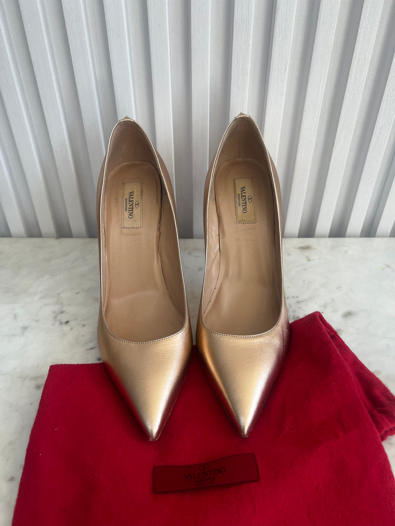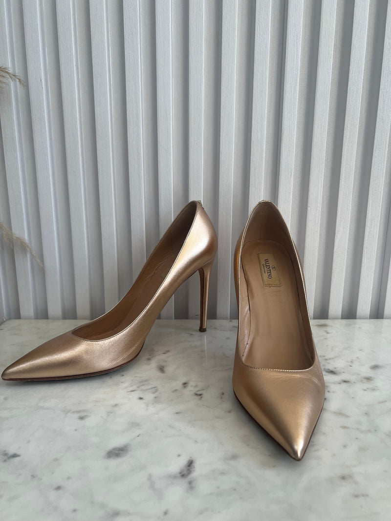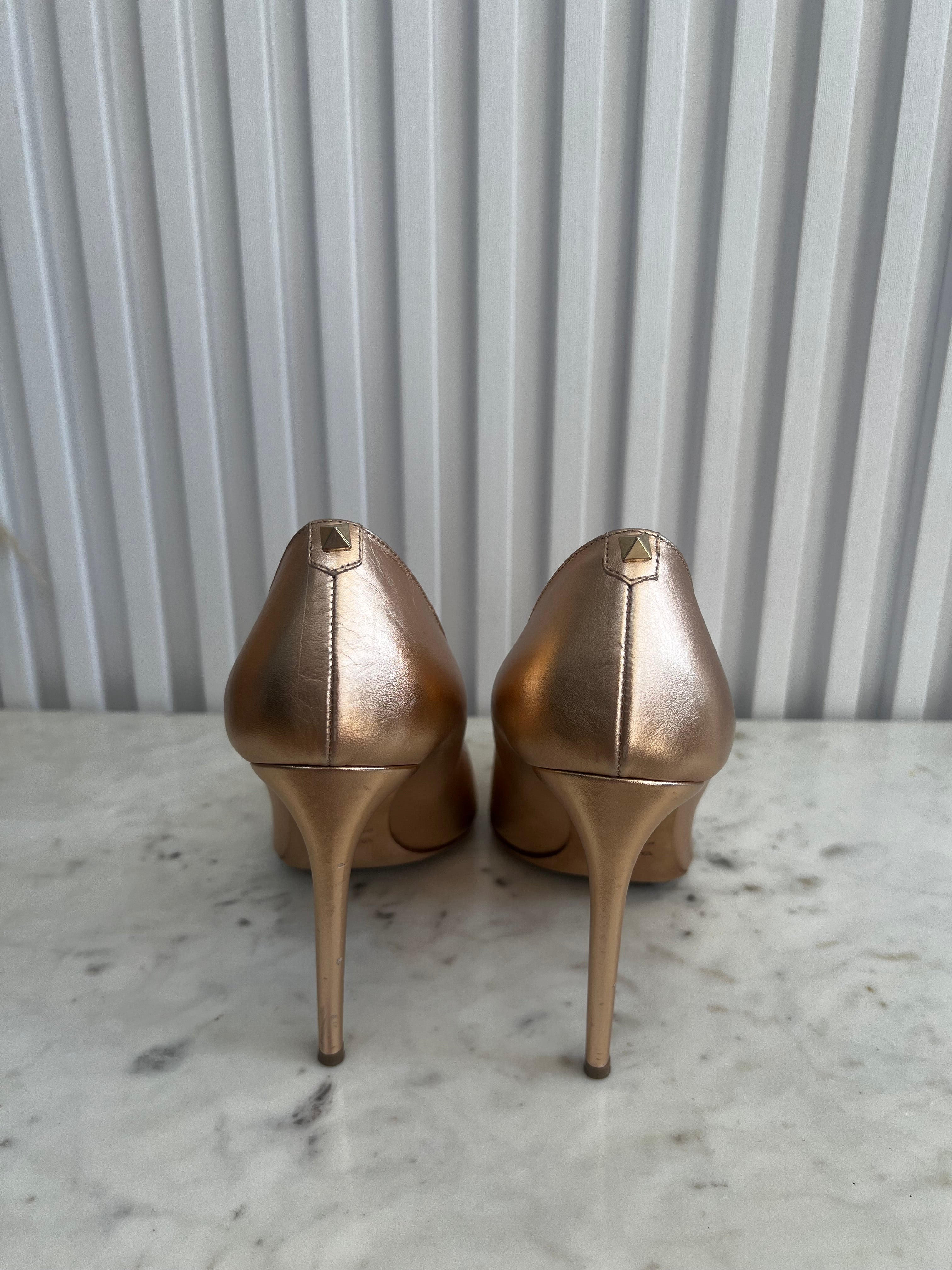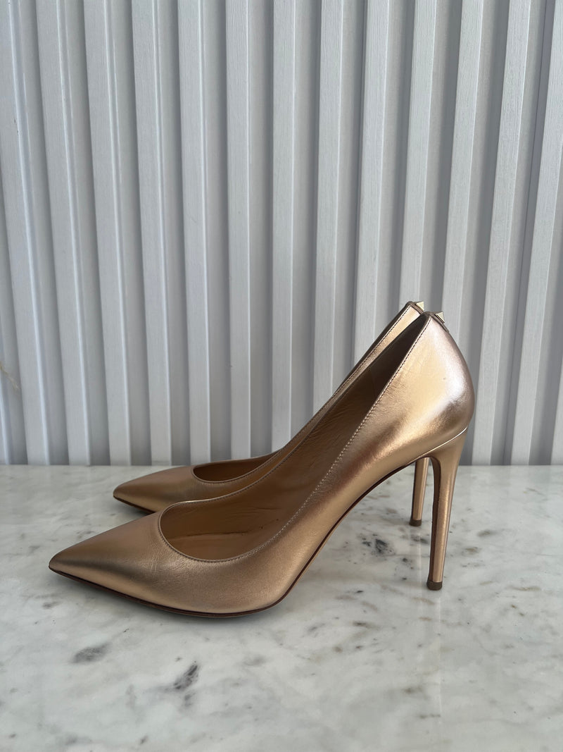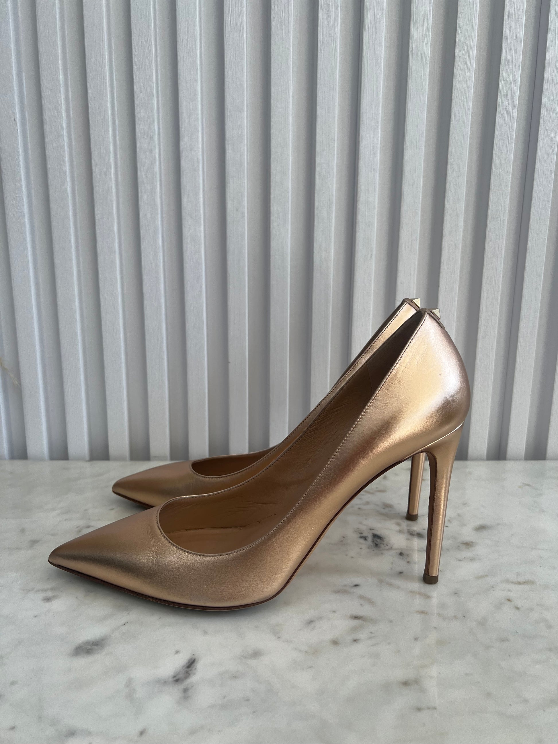 Estos tacones stiletto con cuero rose gold tienen un alto de 11cm. En la parte trasera tienen un detalle del emblemático Rockstud Valentino.