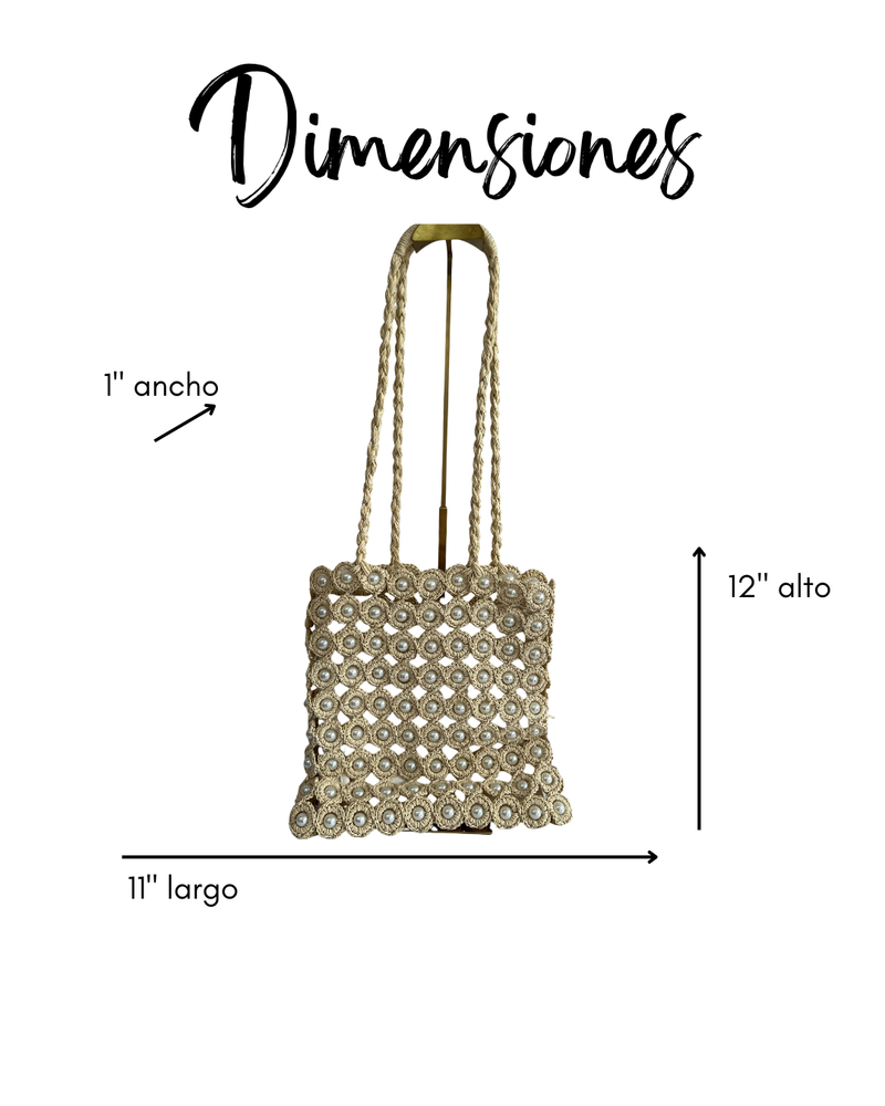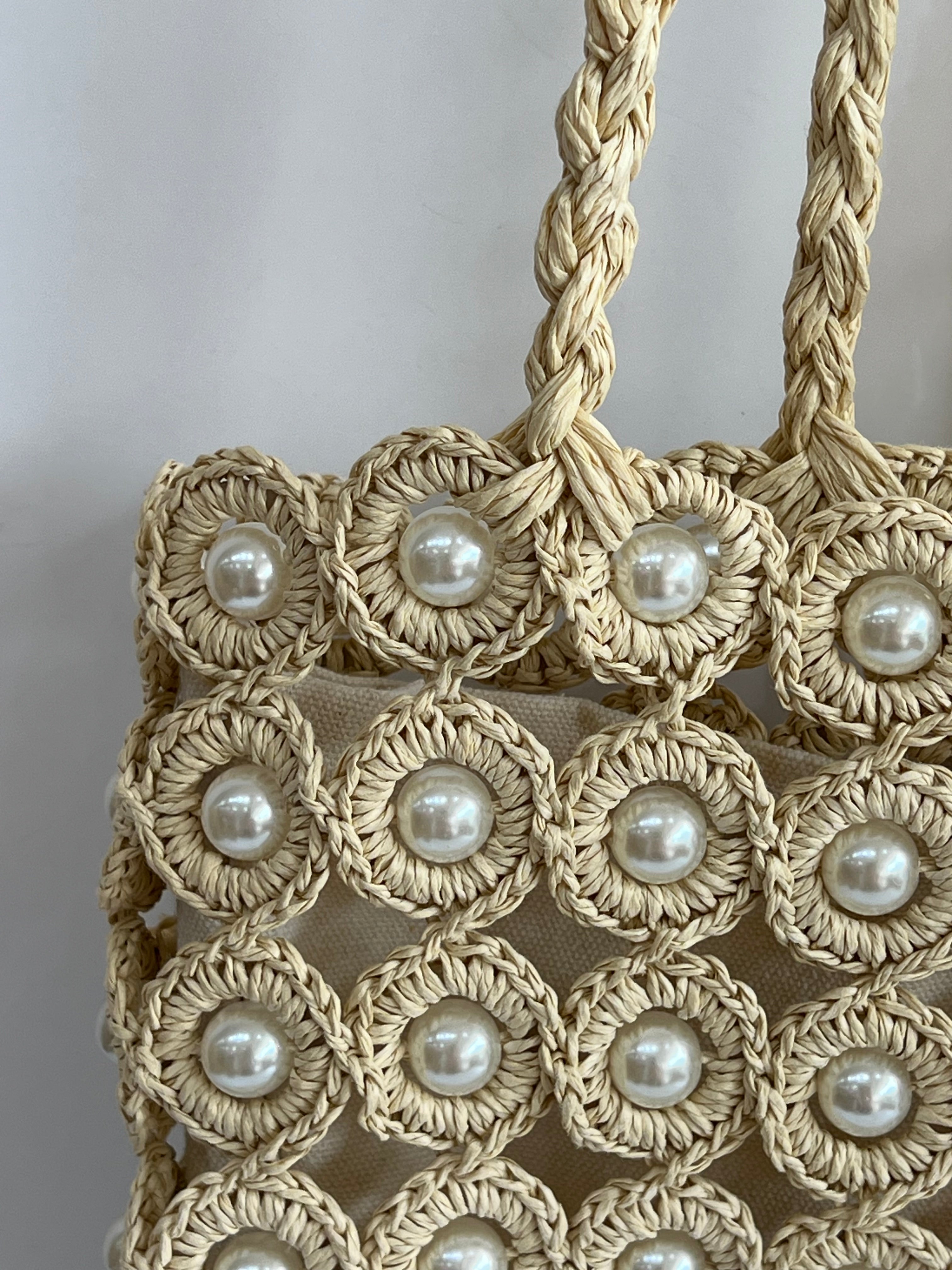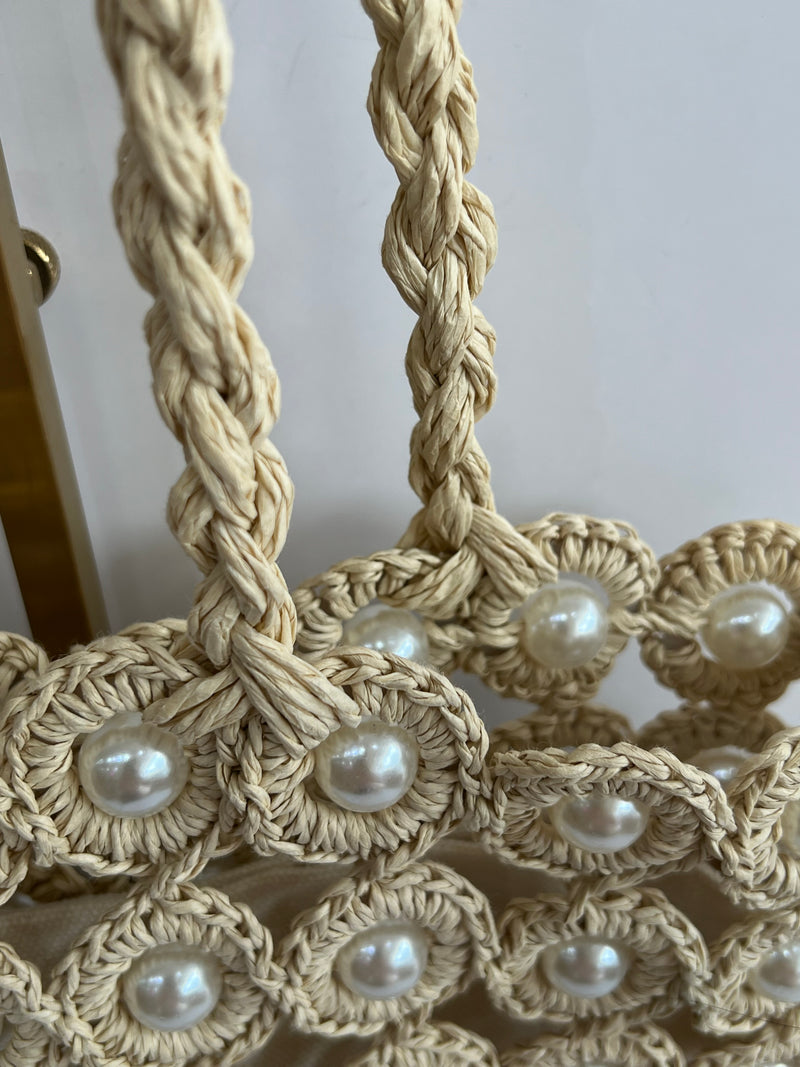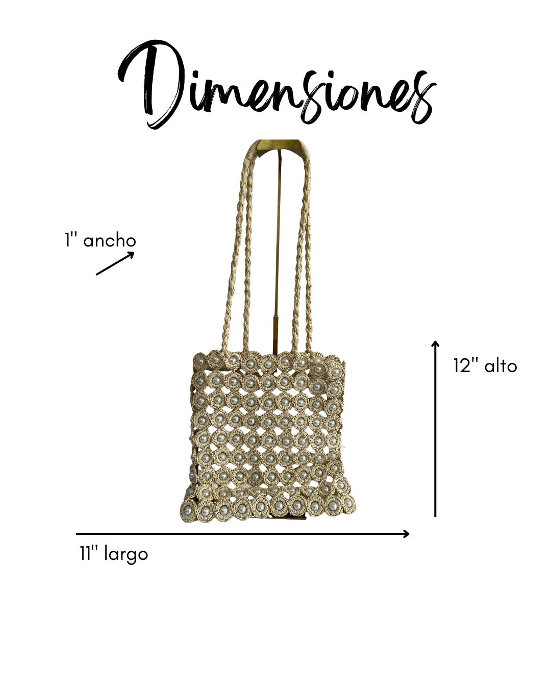 Es una bolsa tejida en paja con detalles de perlas decorativas y asas resistentes para llevar al hombro.
