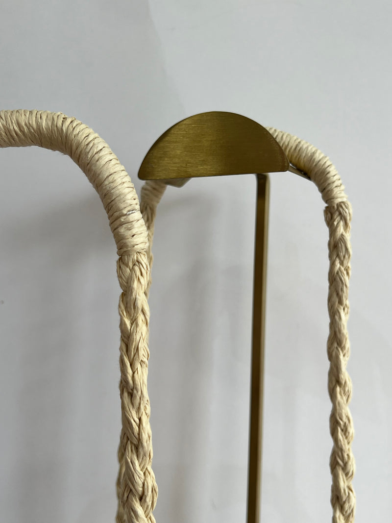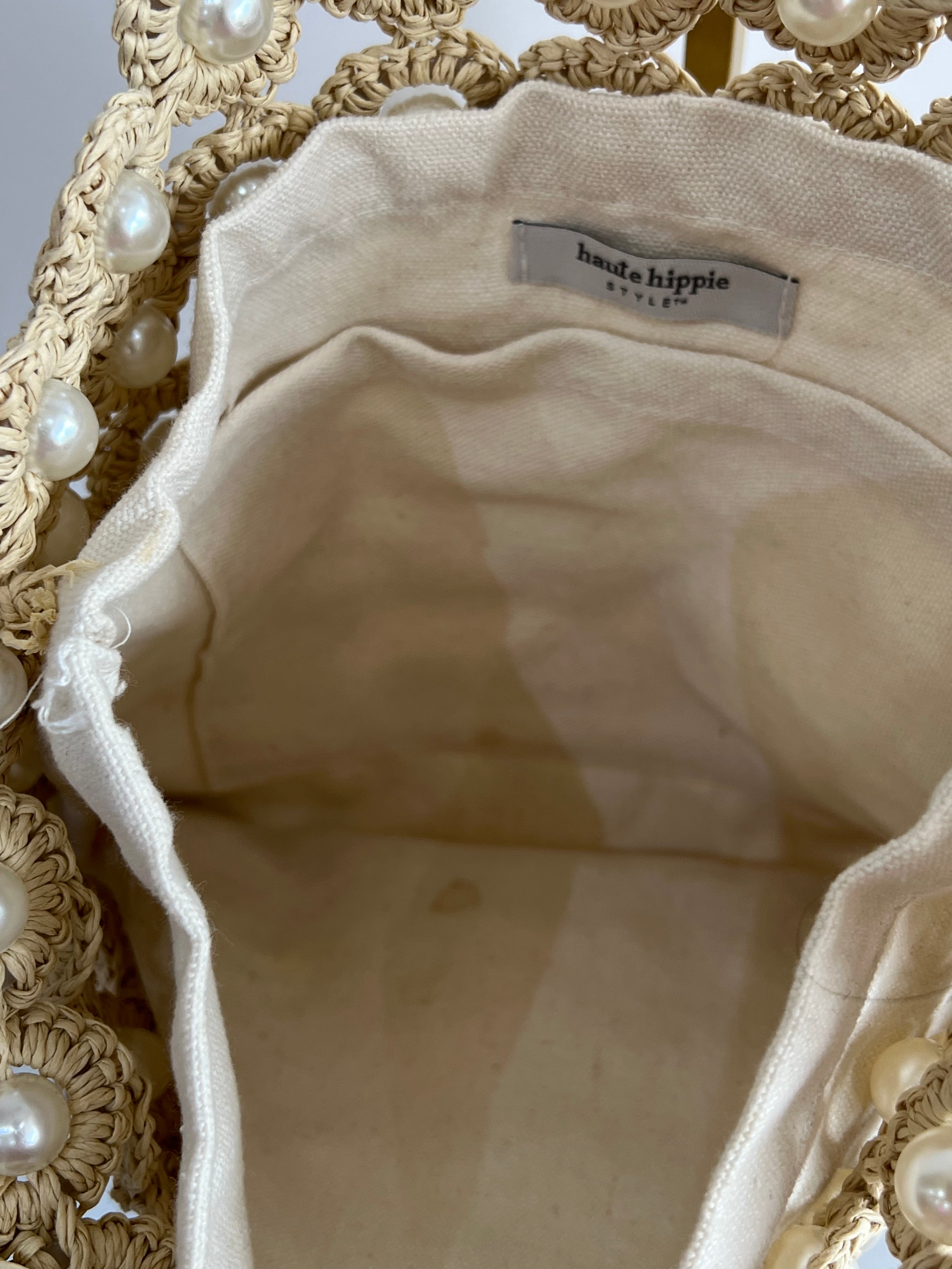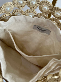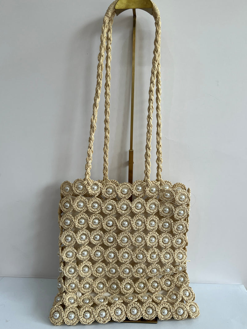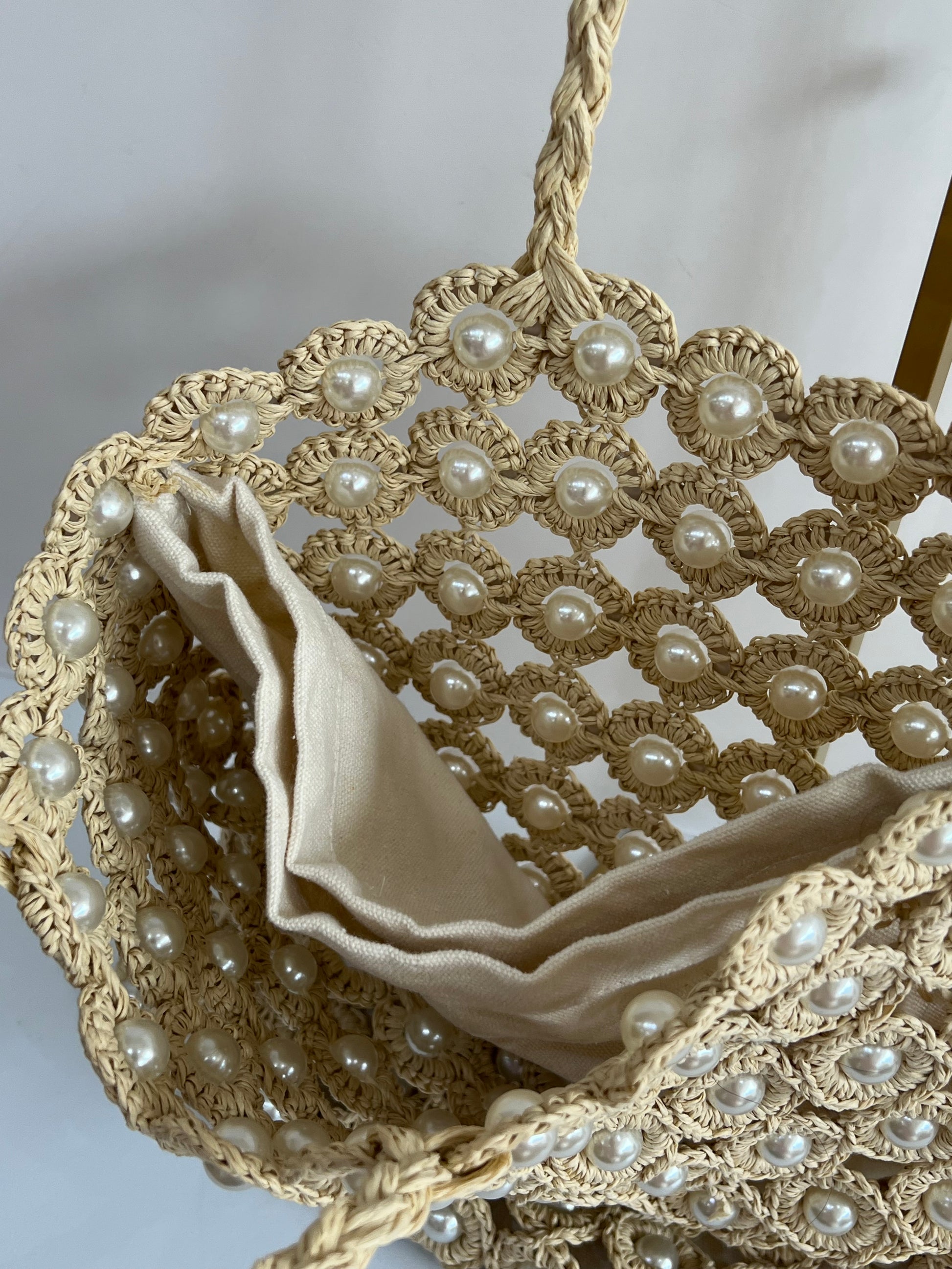 Es una bolsa tejida en paja con detalles de perlas decorativas y asas resistentes para llevar al hombro.