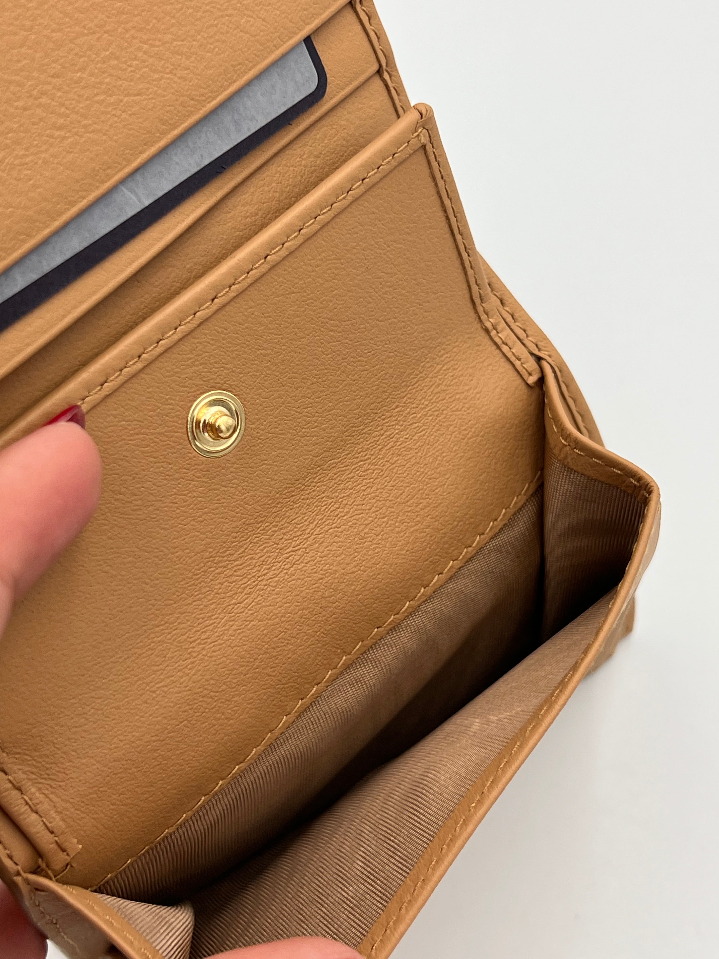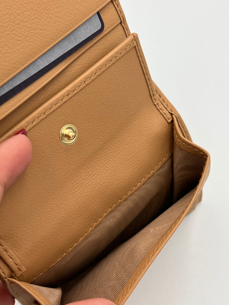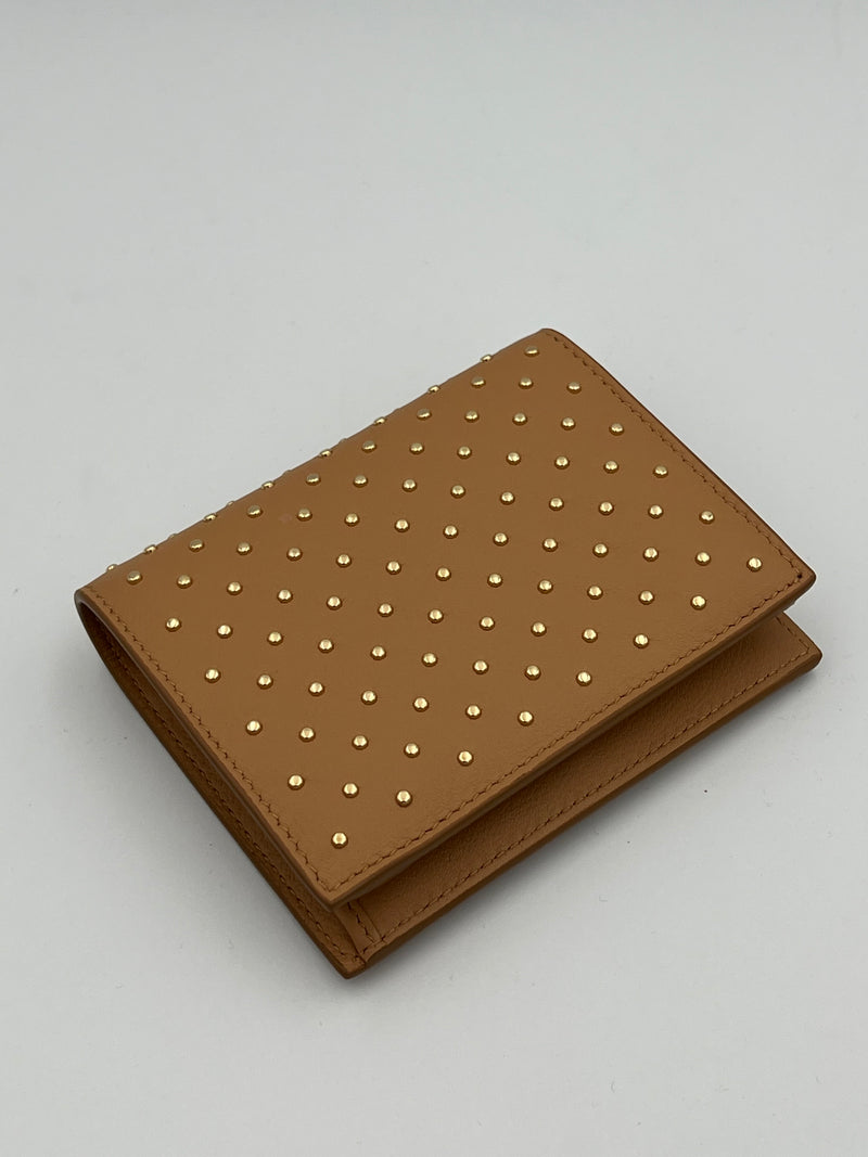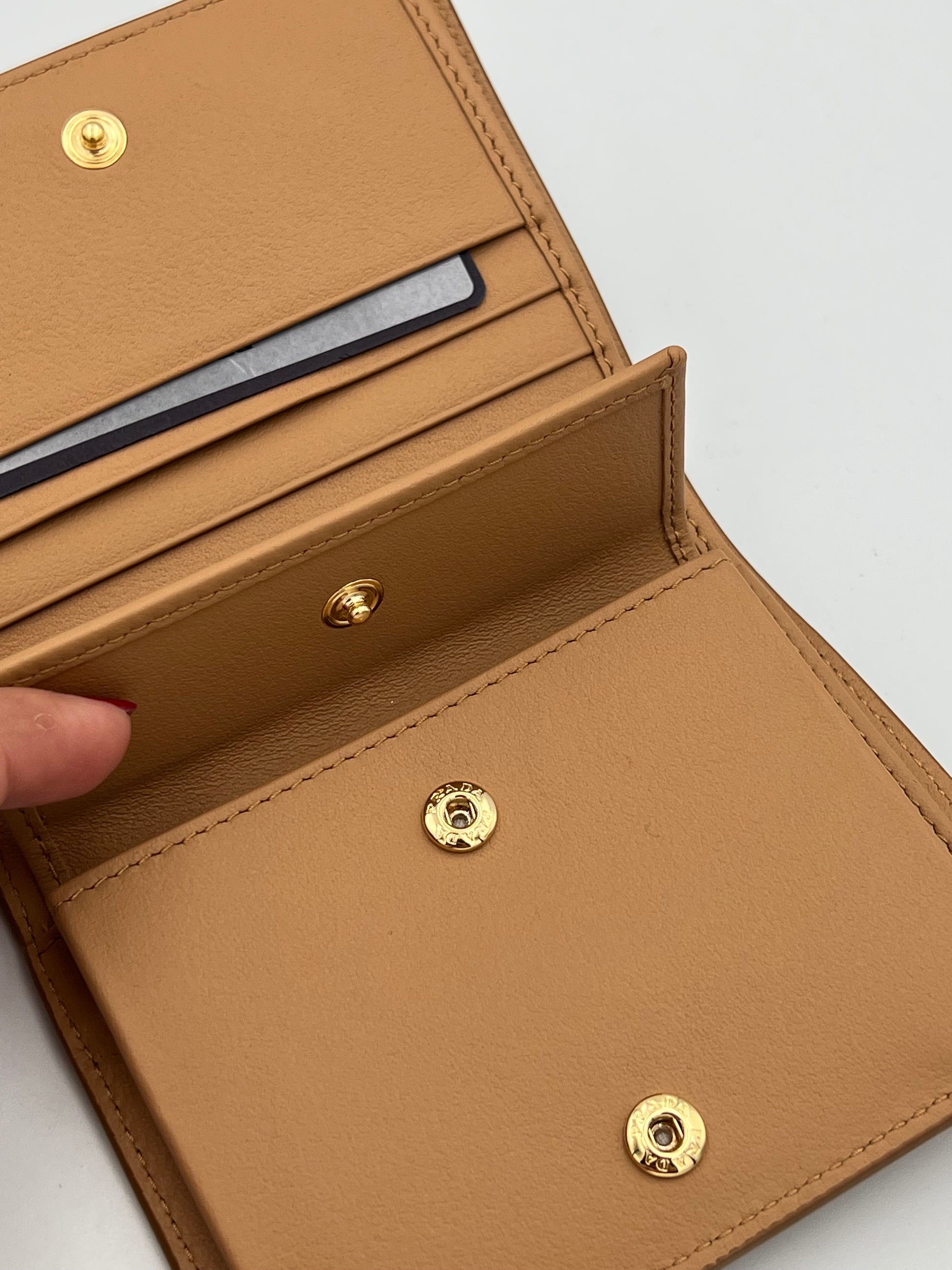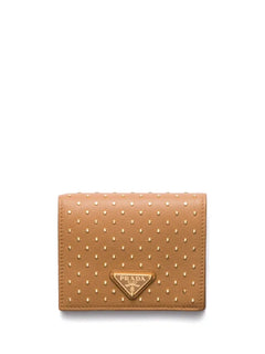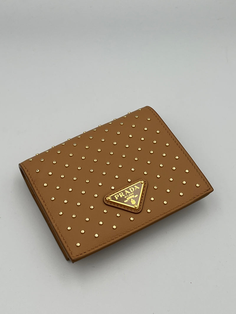 billetera compacta con el icónico logo triangular de Prada en el exterior, decorada con studs en dorado y cierre de metal. En su interior incluye varios compartimentos para billetes, múltiples ranuras para tarjetas y un pequeño bolsillo.
