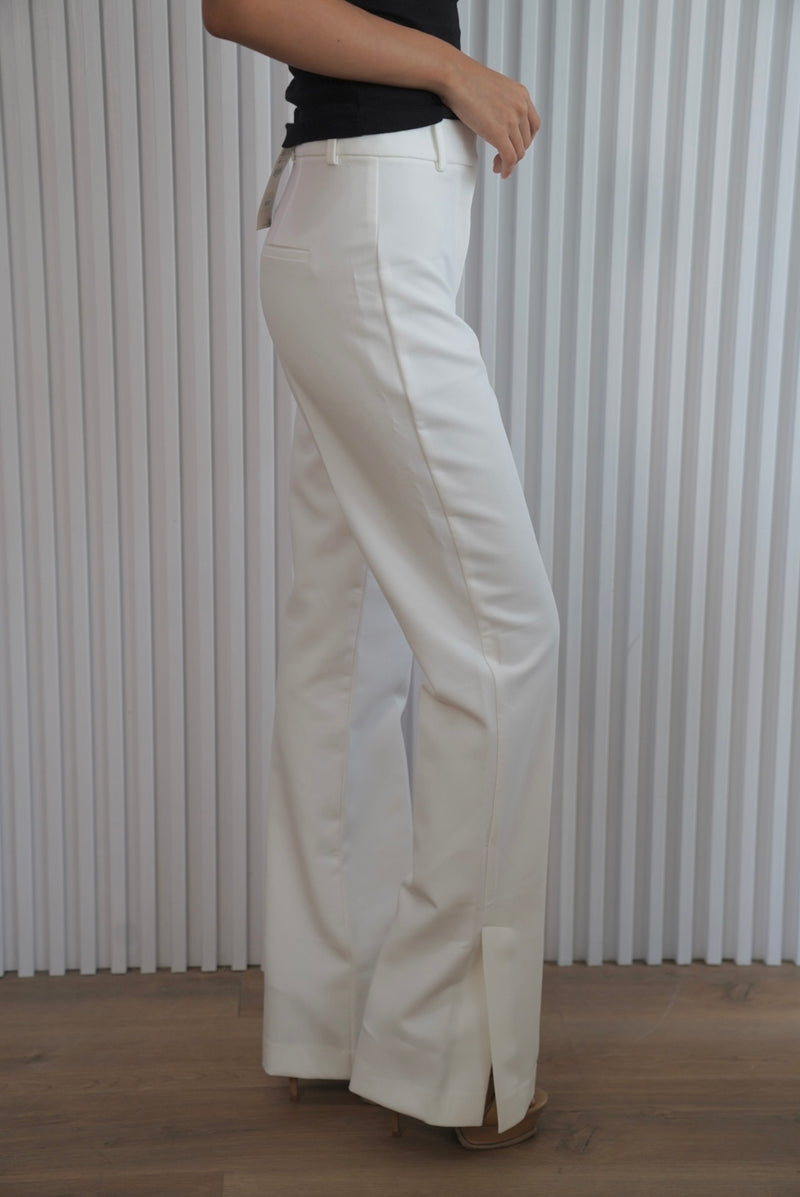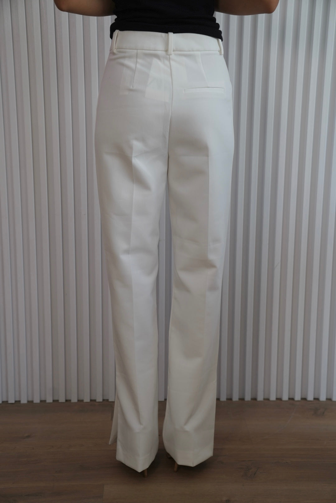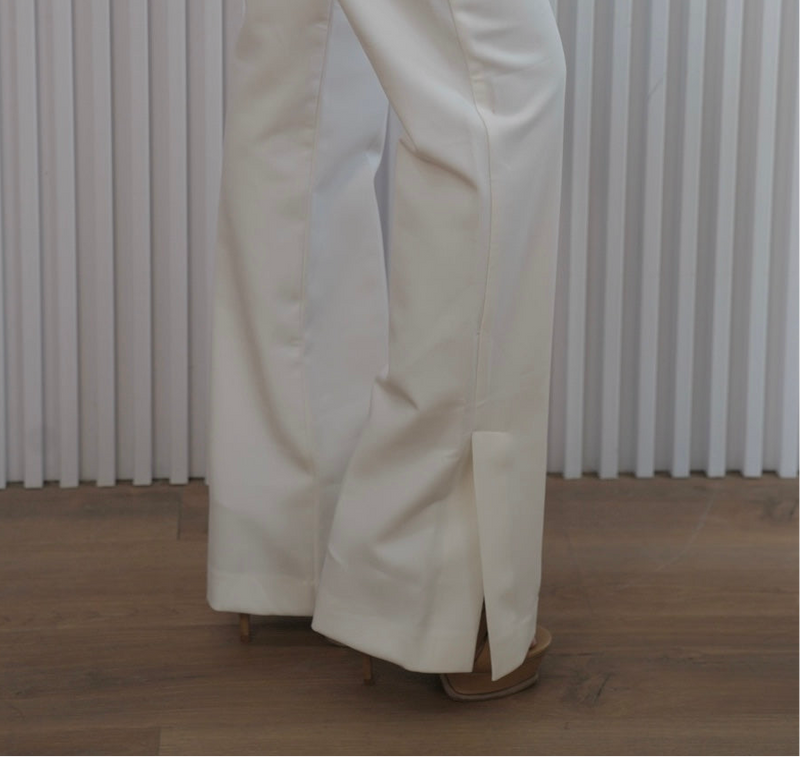 Estos pantalones de tiro alto, cuentan con un botón y zipper escondido. Cuentan con una pequeña abertura en cada pierna.