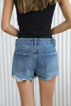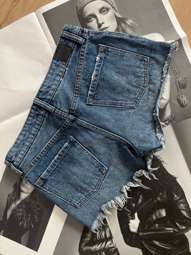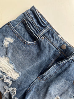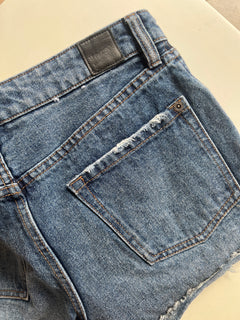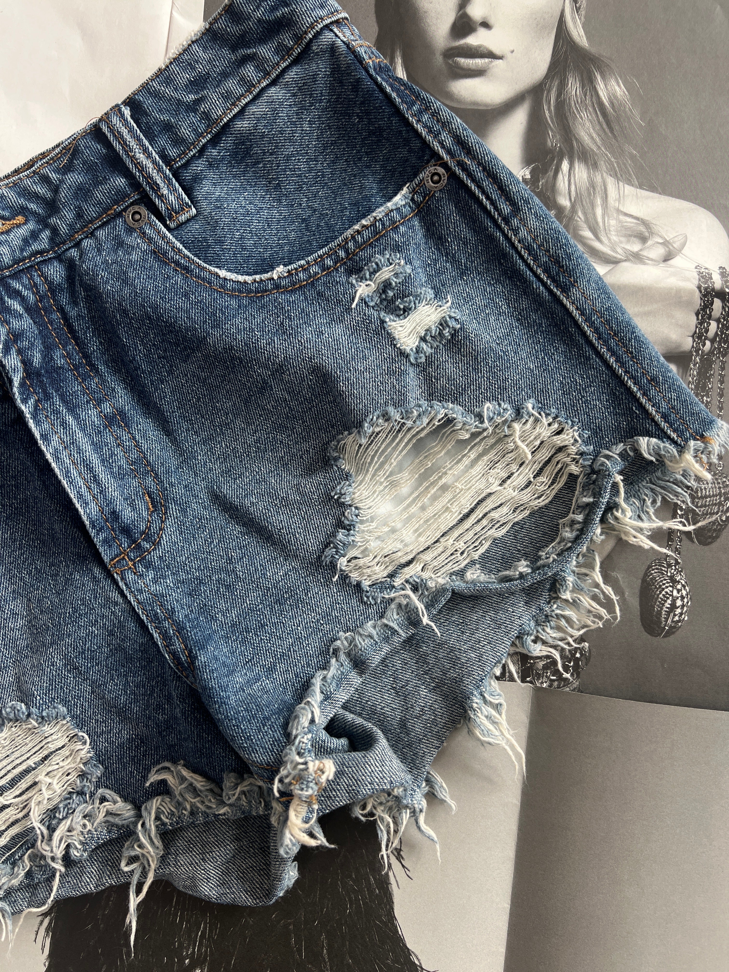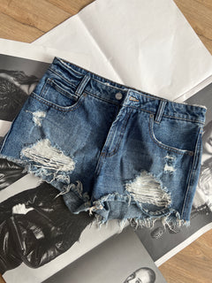 Shorts jeans cortos elaborados de algodón, color azul oscuro, diseño ripped en la parte frontal y bordes deshilachados, cierre frontal con zíper y botón.