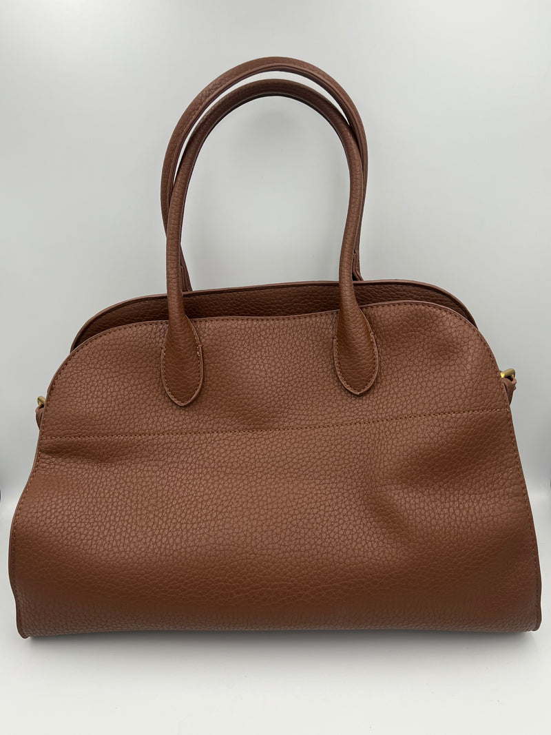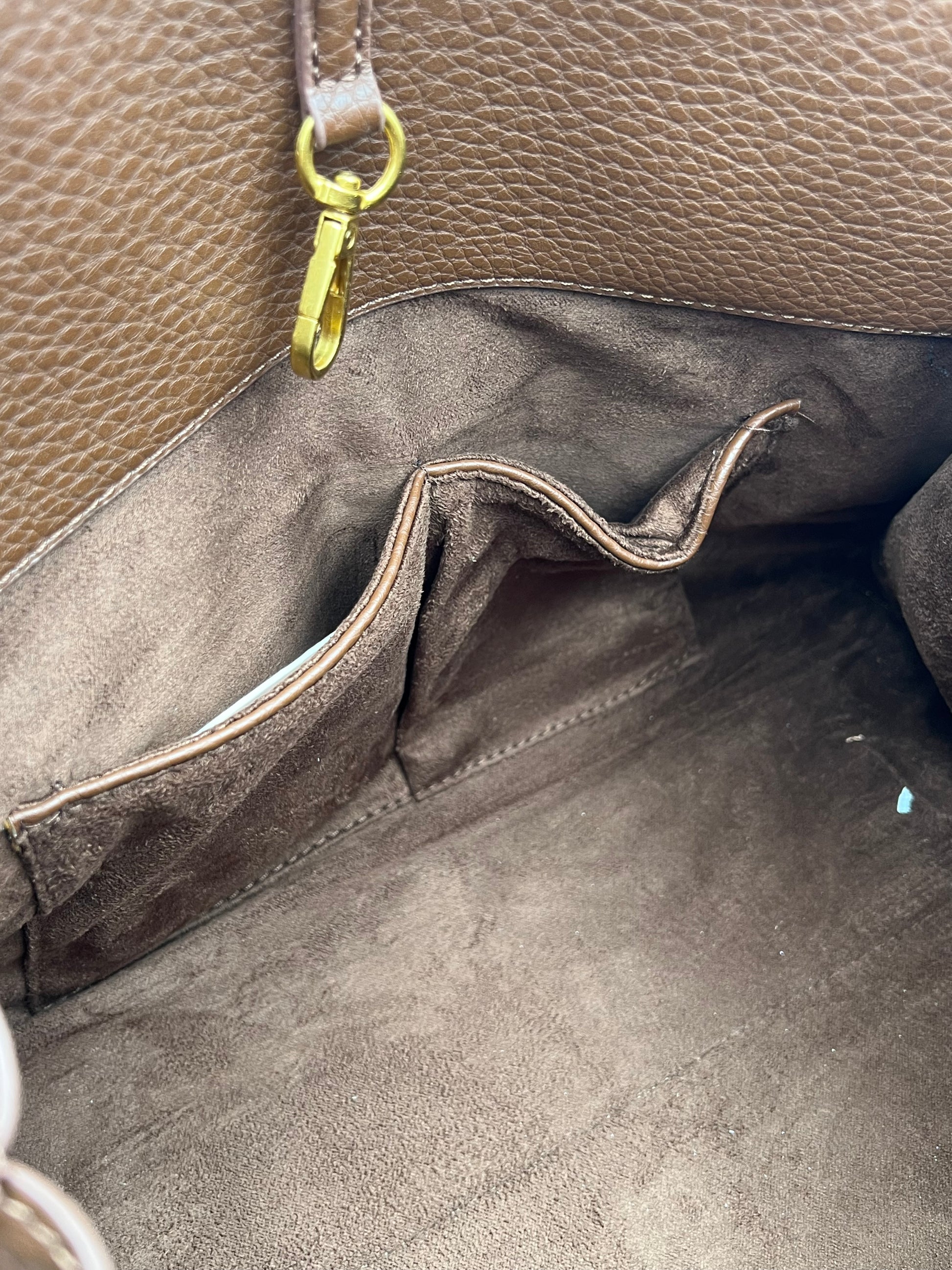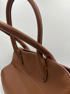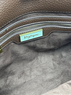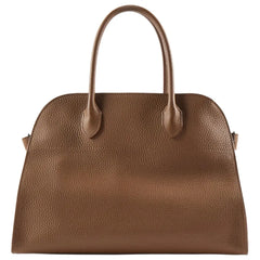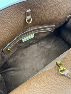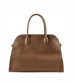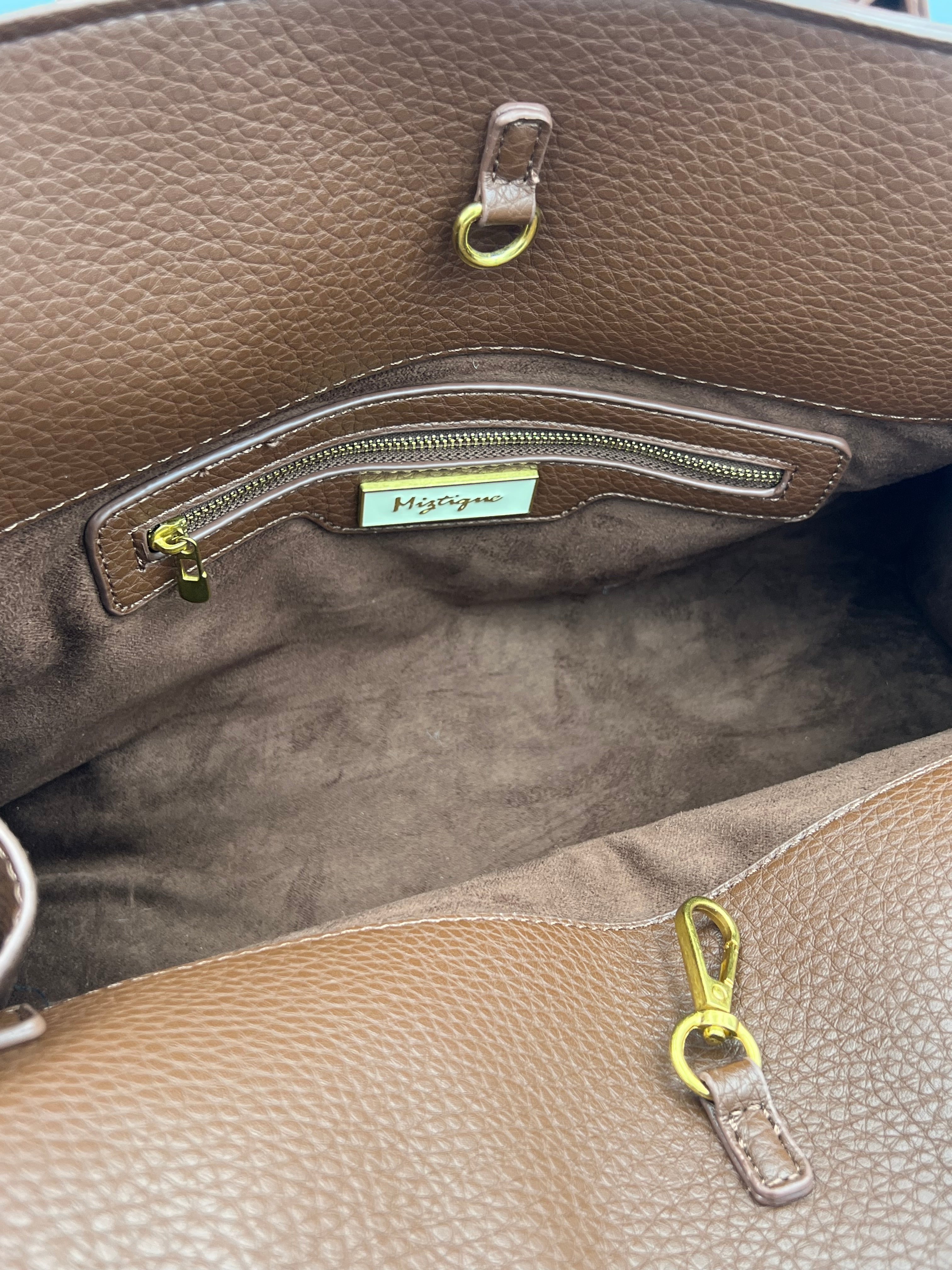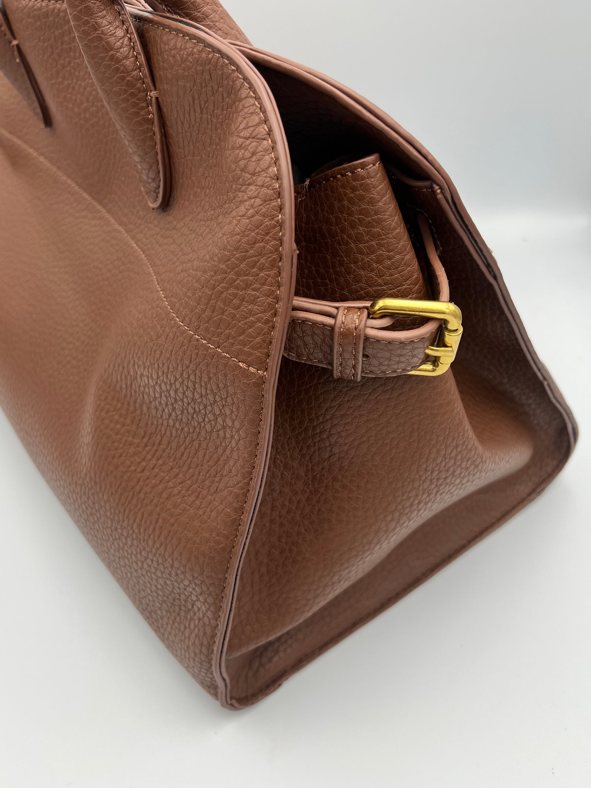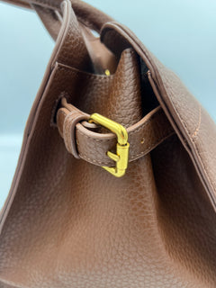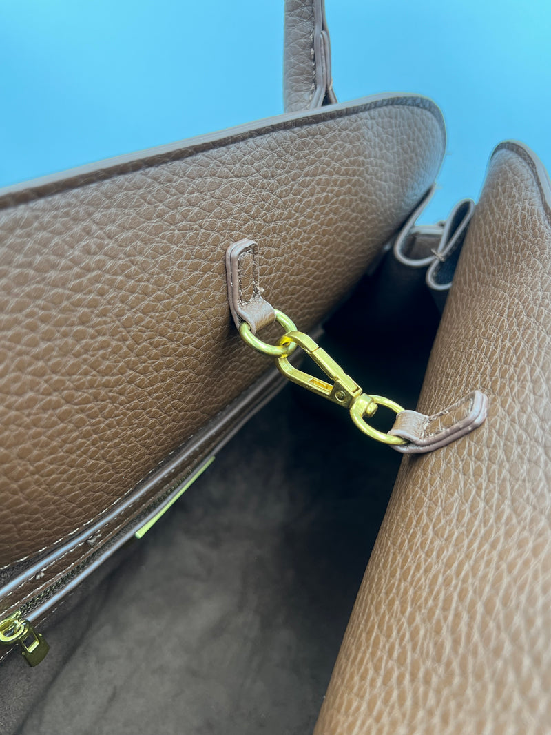 bolso en cafe elaborado en sintetico granulado con asas cortas, cuenta con un compartimento con cierre, tambien tiene broche en medio. Un estilo muy minimalista y de moda.