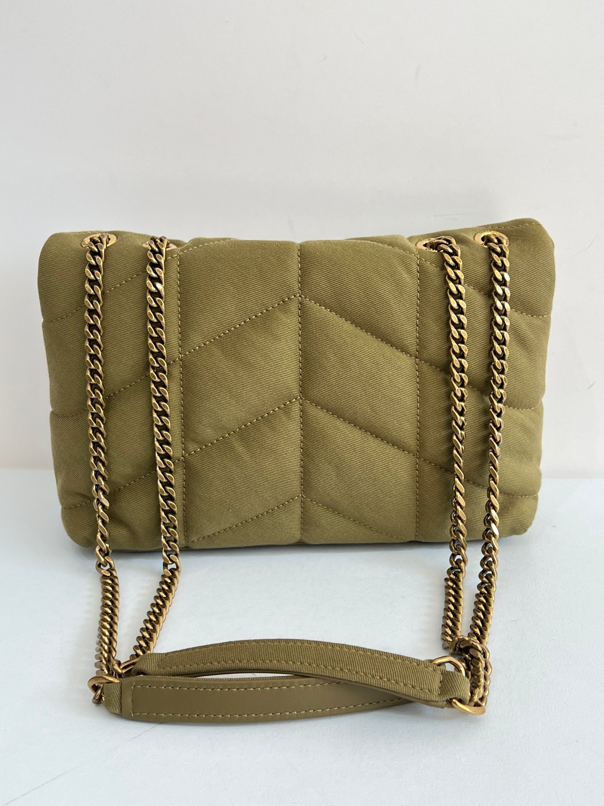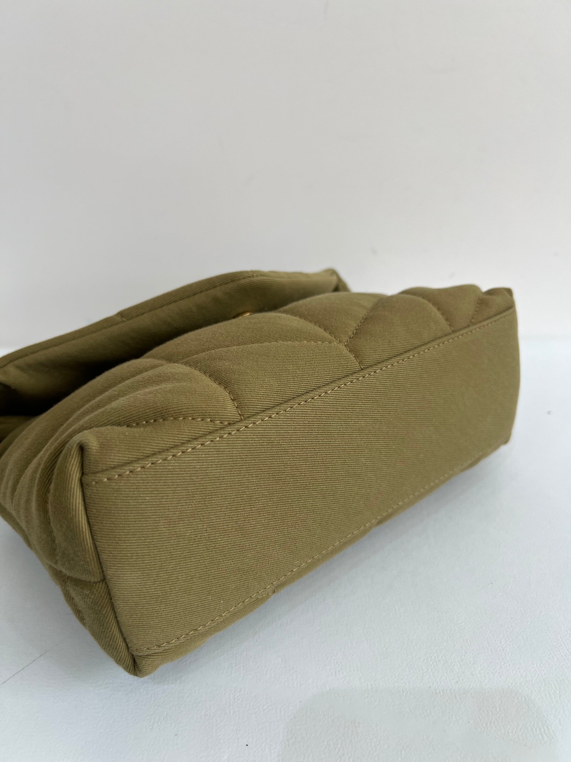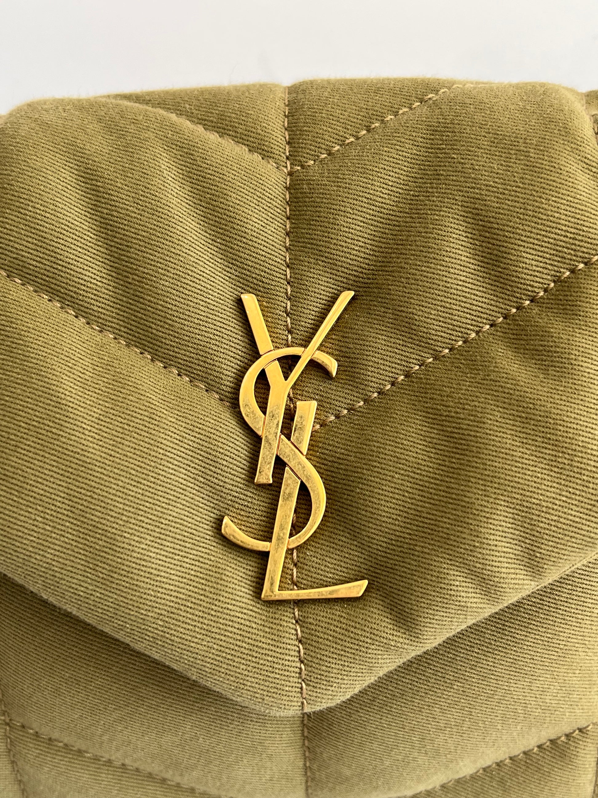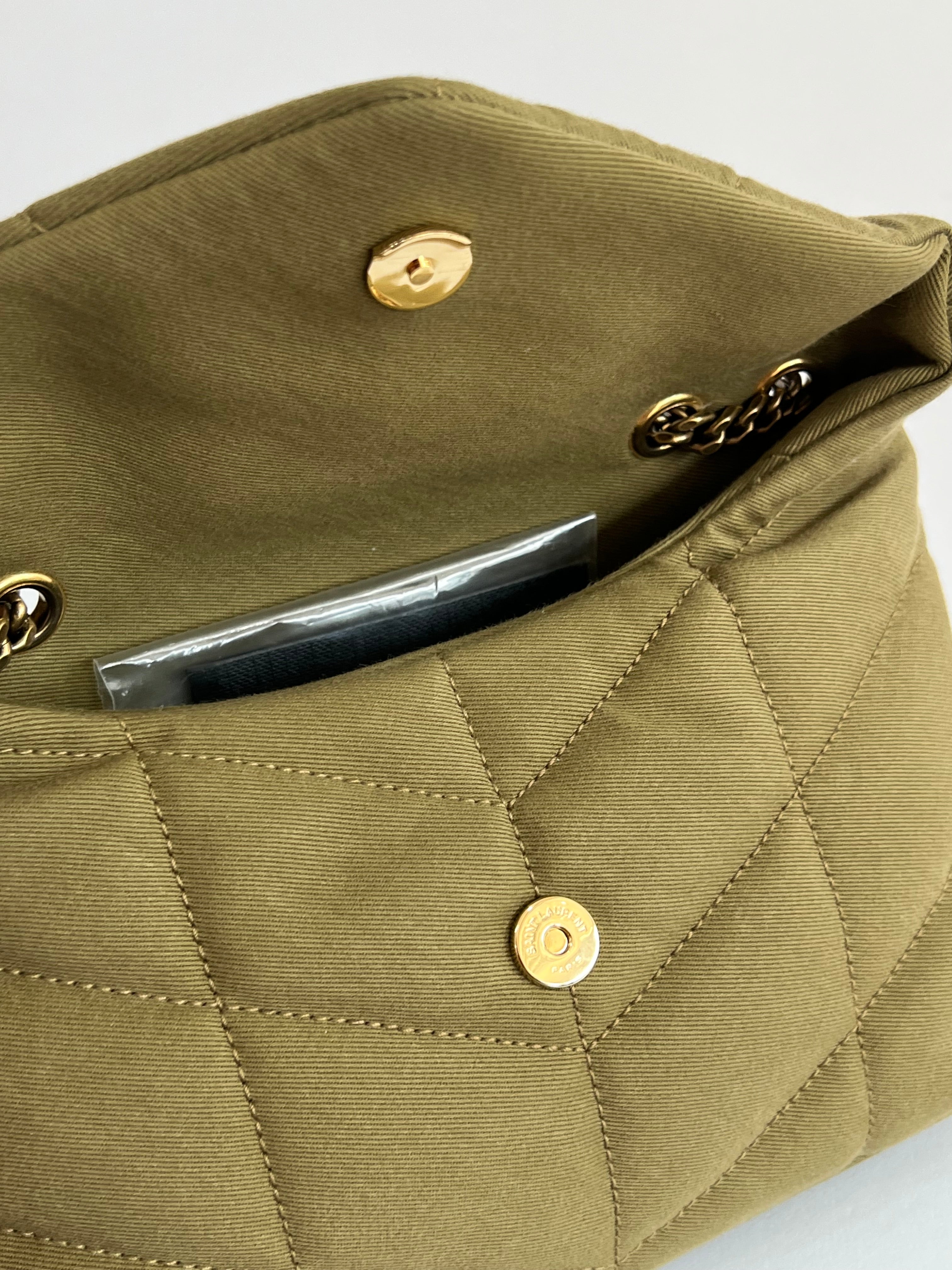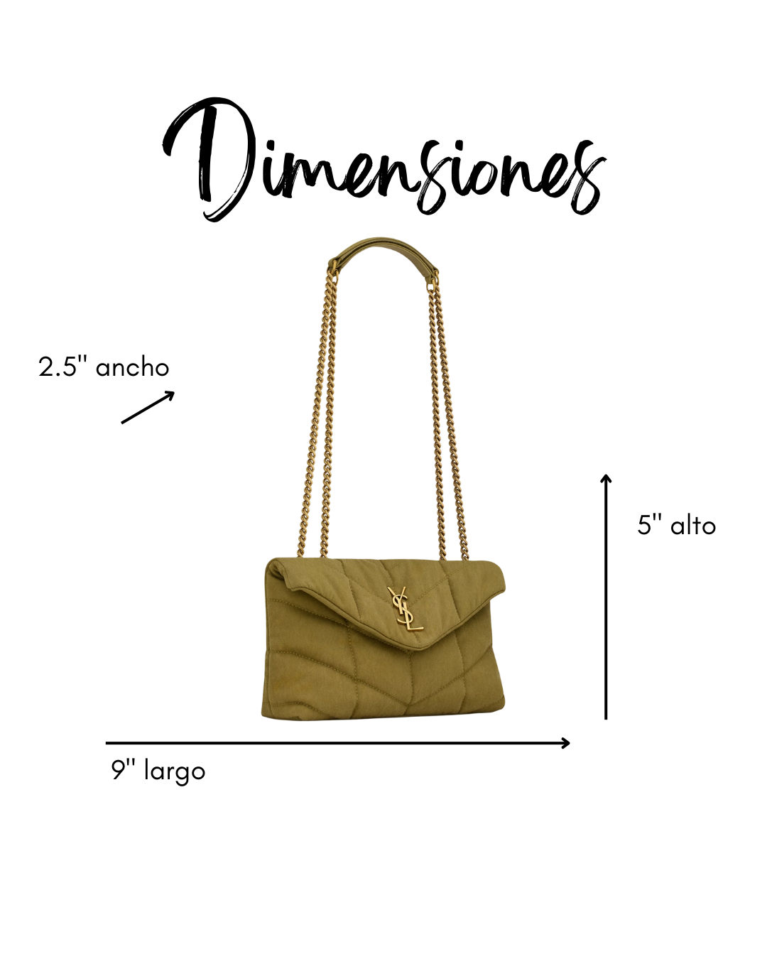 La Toy Puffer está hecha de tela de con acabado acolchado, con costuras en chevron. Cierre en solapa con el icónico logo YSL en dorado y cadena para llevar al hombro. Cabe celular, llaves, wallet y mas.