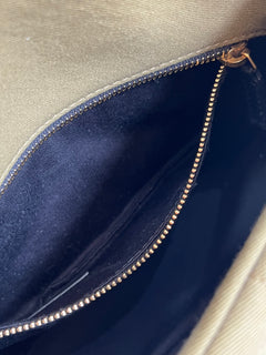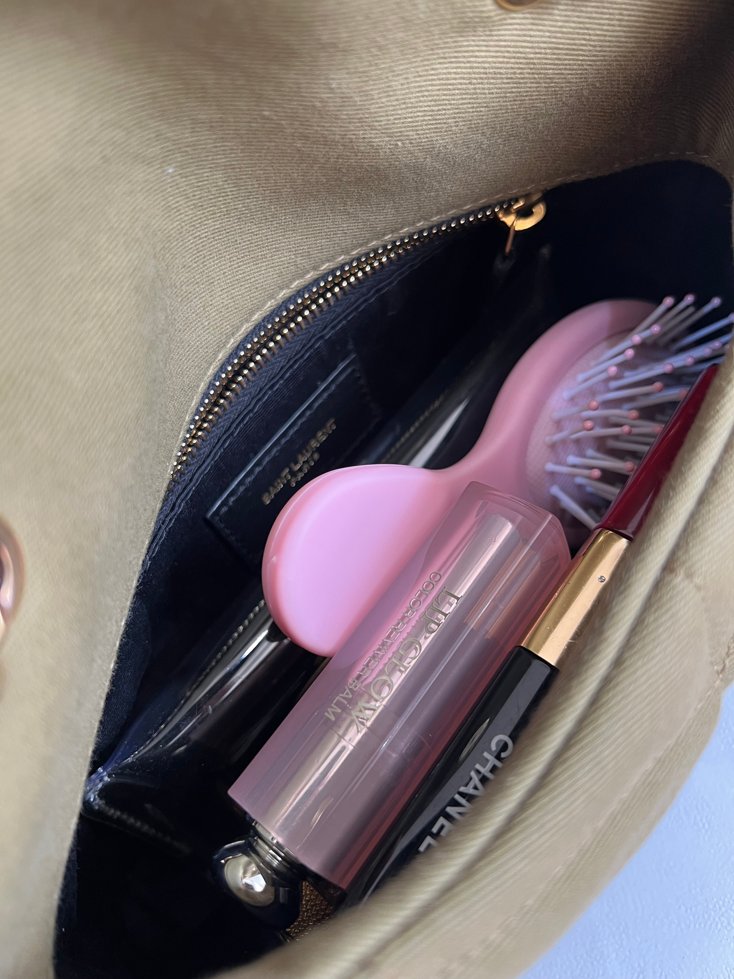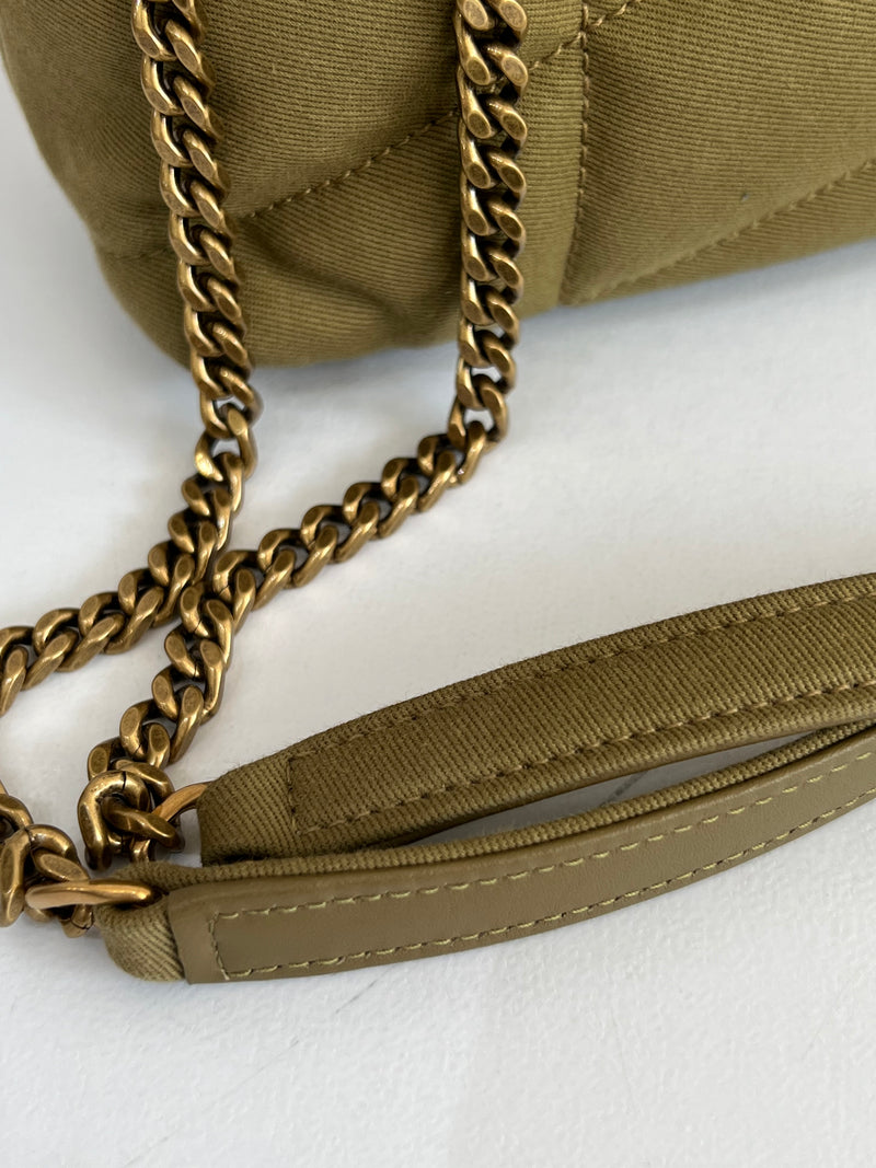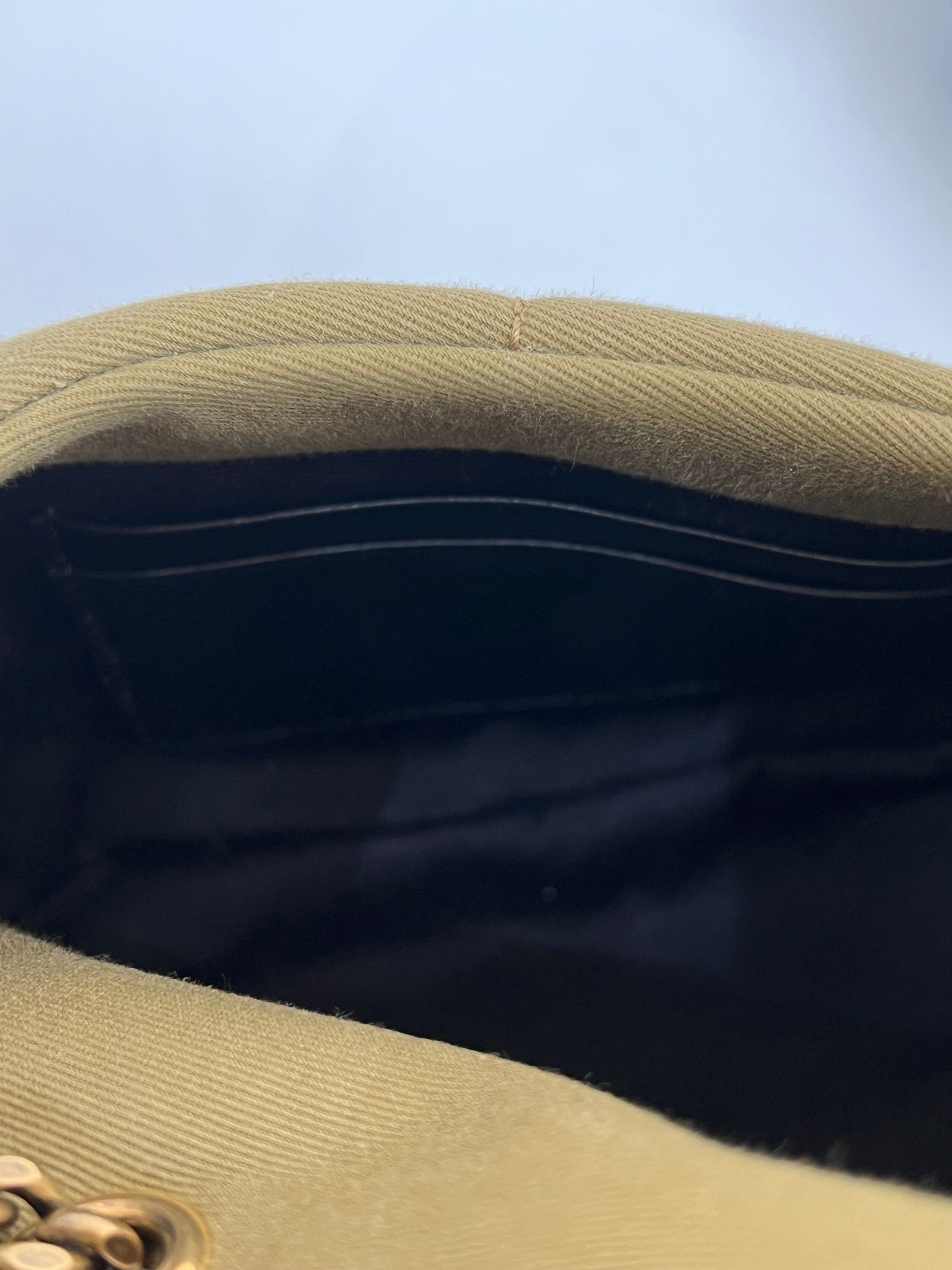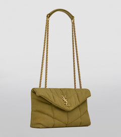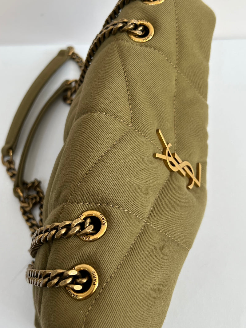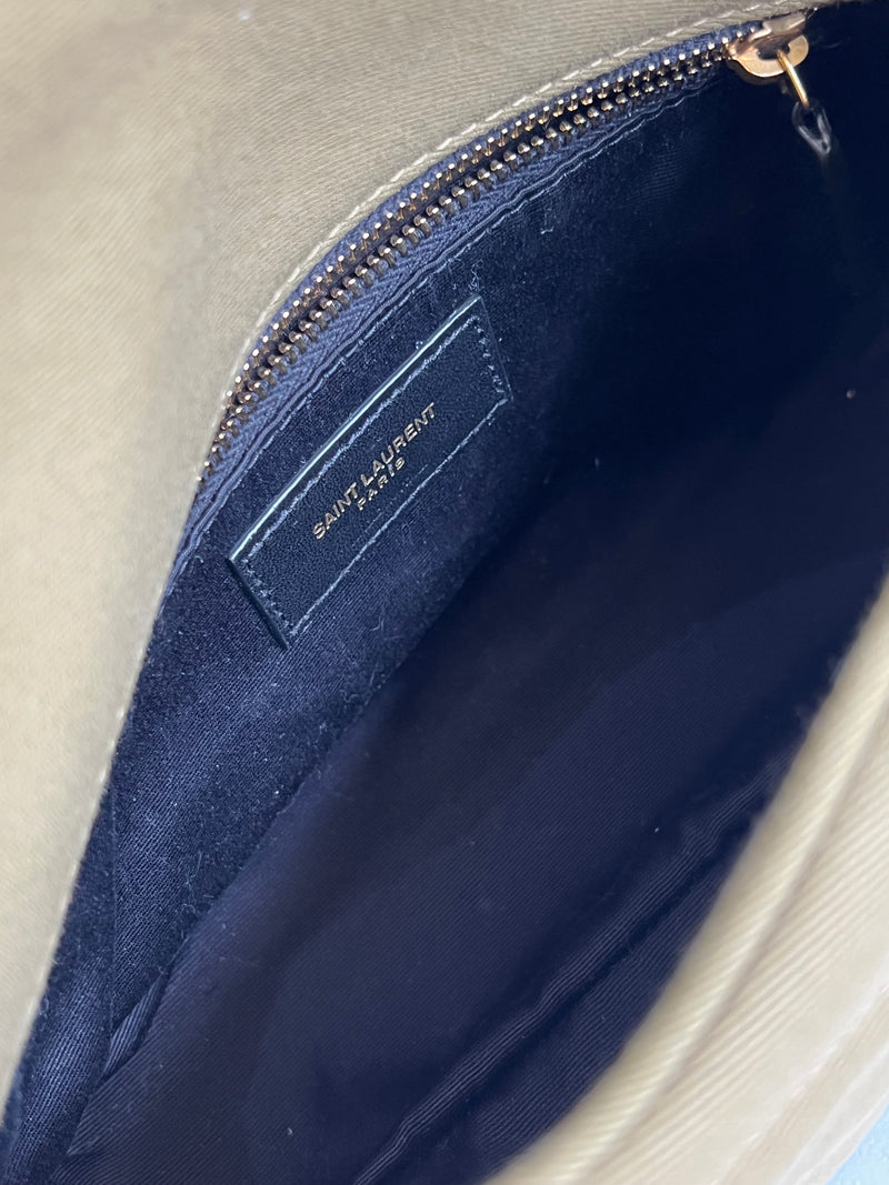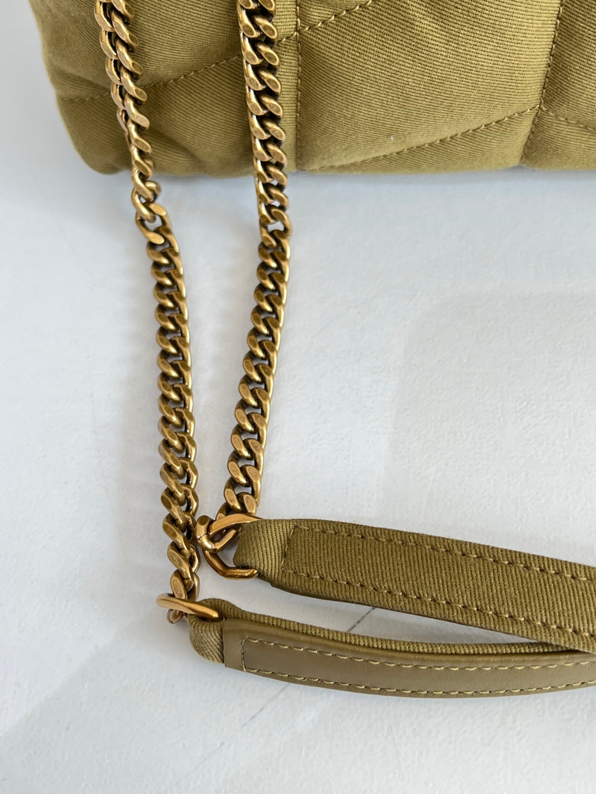 La Toy Puffer está hecha de tela de con acabado acolchado, con costuras en chevron. Cierre en solapa con el icónico logo YSL en dorado y cadena para llevar al hombro. Cabe celular, llaves, wallet y mas.