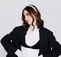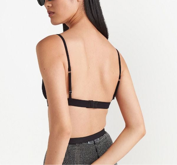 Este bralette está confeccionado en color negro, con su logotipo de triángulo esmaltado, copas triangulares, correas de hombro ajustables y elásticas, cierre de gancho y ojal en la parte trasera. Pueden estilizarlo de diversas formas.