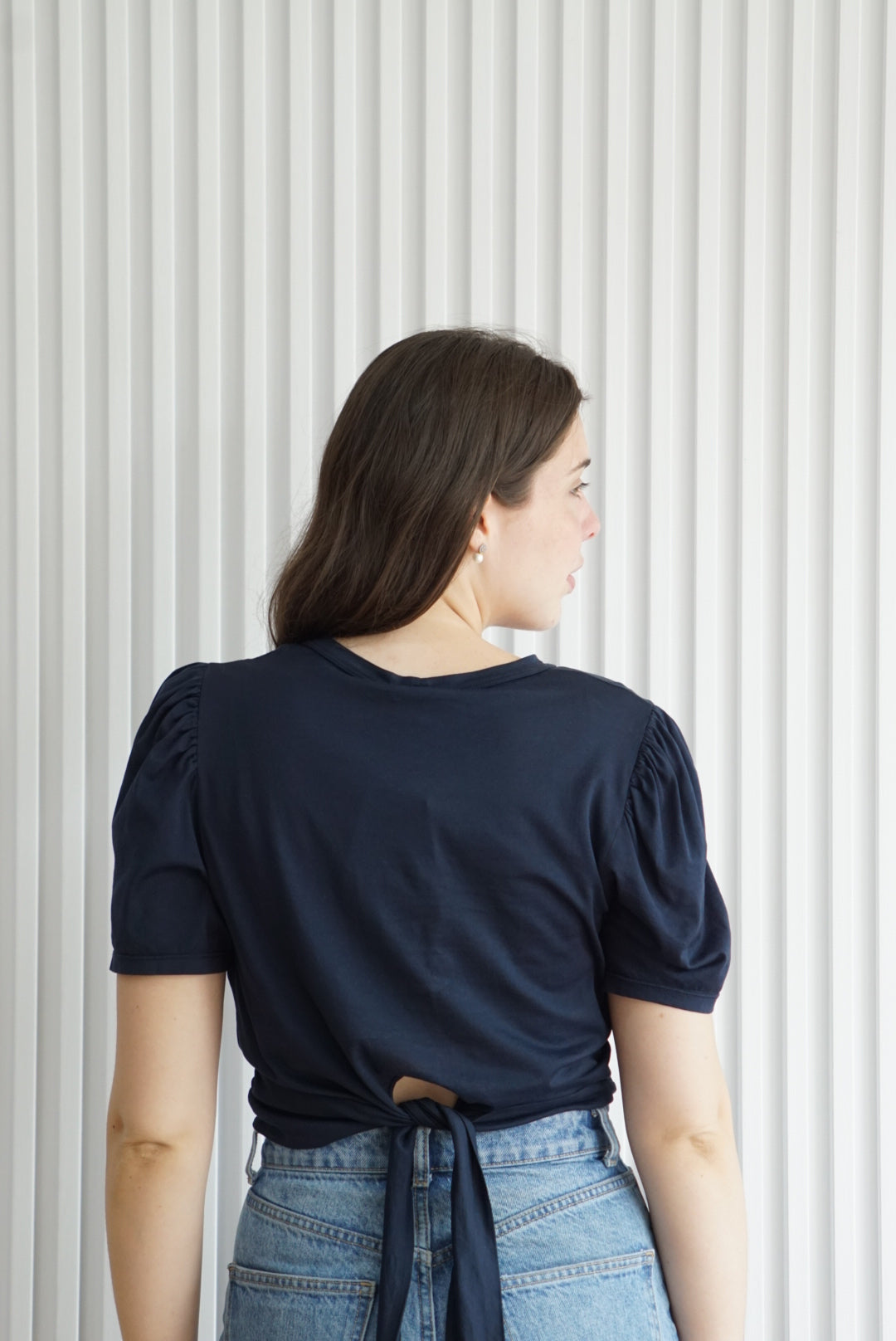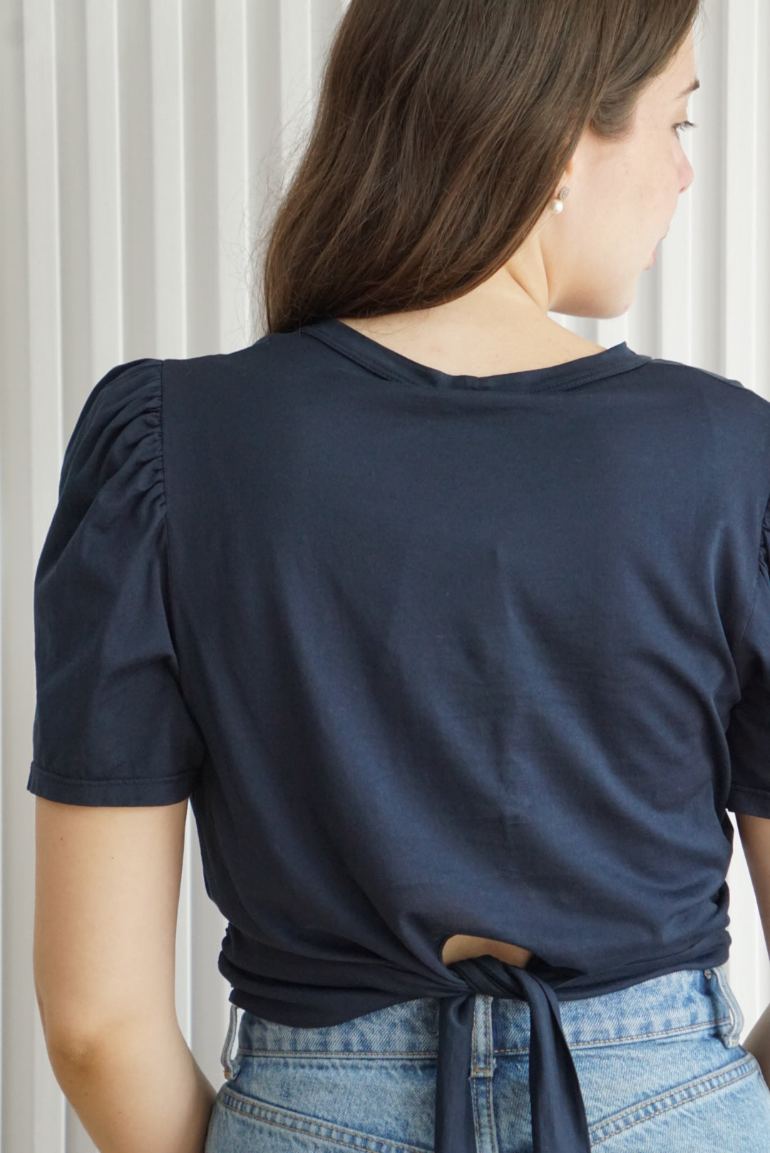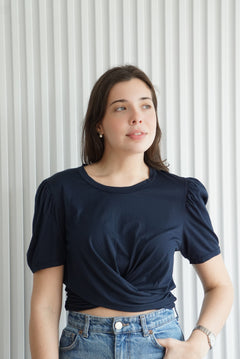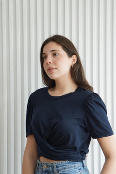 Este croptop esta fabricado en algodón, su diseño es de puffy sleeves y tiene un amarre en la parte trasera.