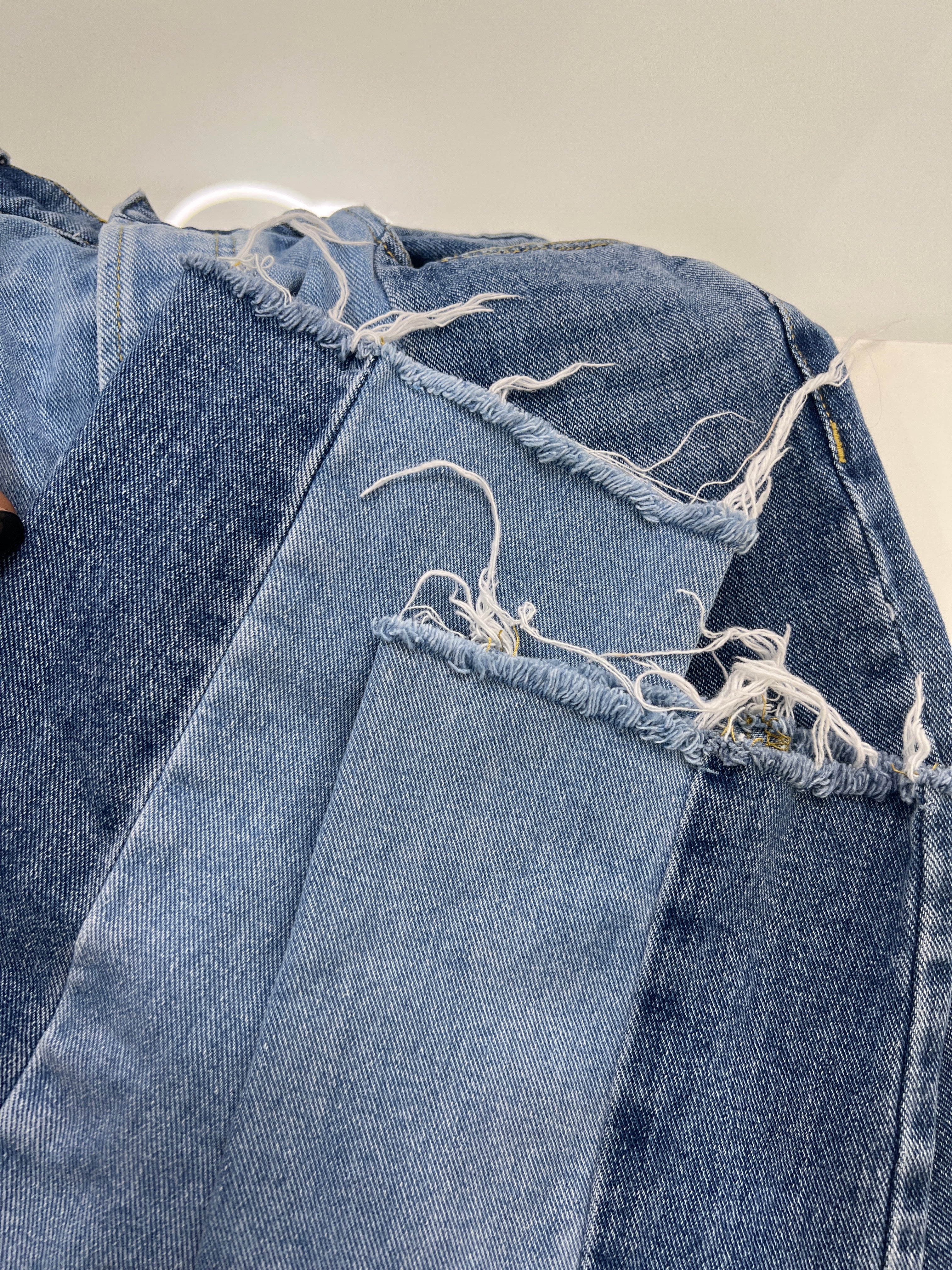 Jeans elaborados de algodón, tiro alto a la cintura, diseño de dos tonos de Azul, cierre frontal con botones, 2 bolsillos traseros y 2 frontales, diseño con borde deshilachado en las piernas.