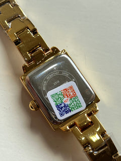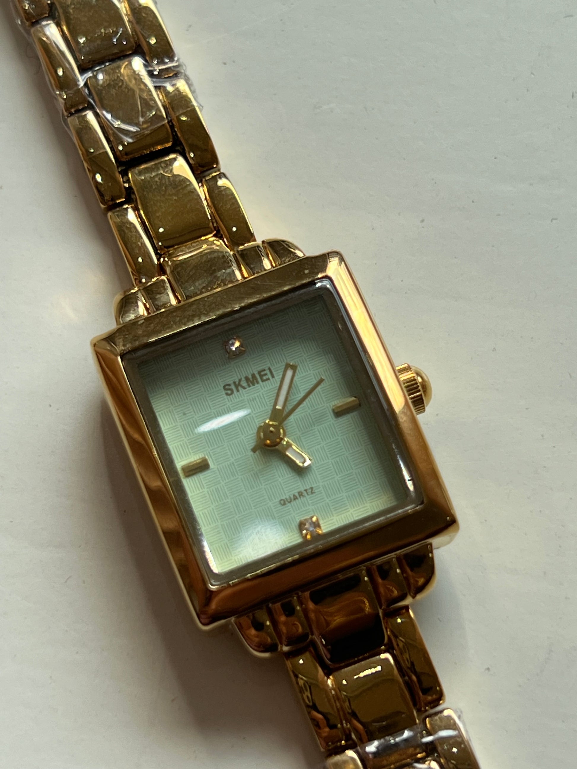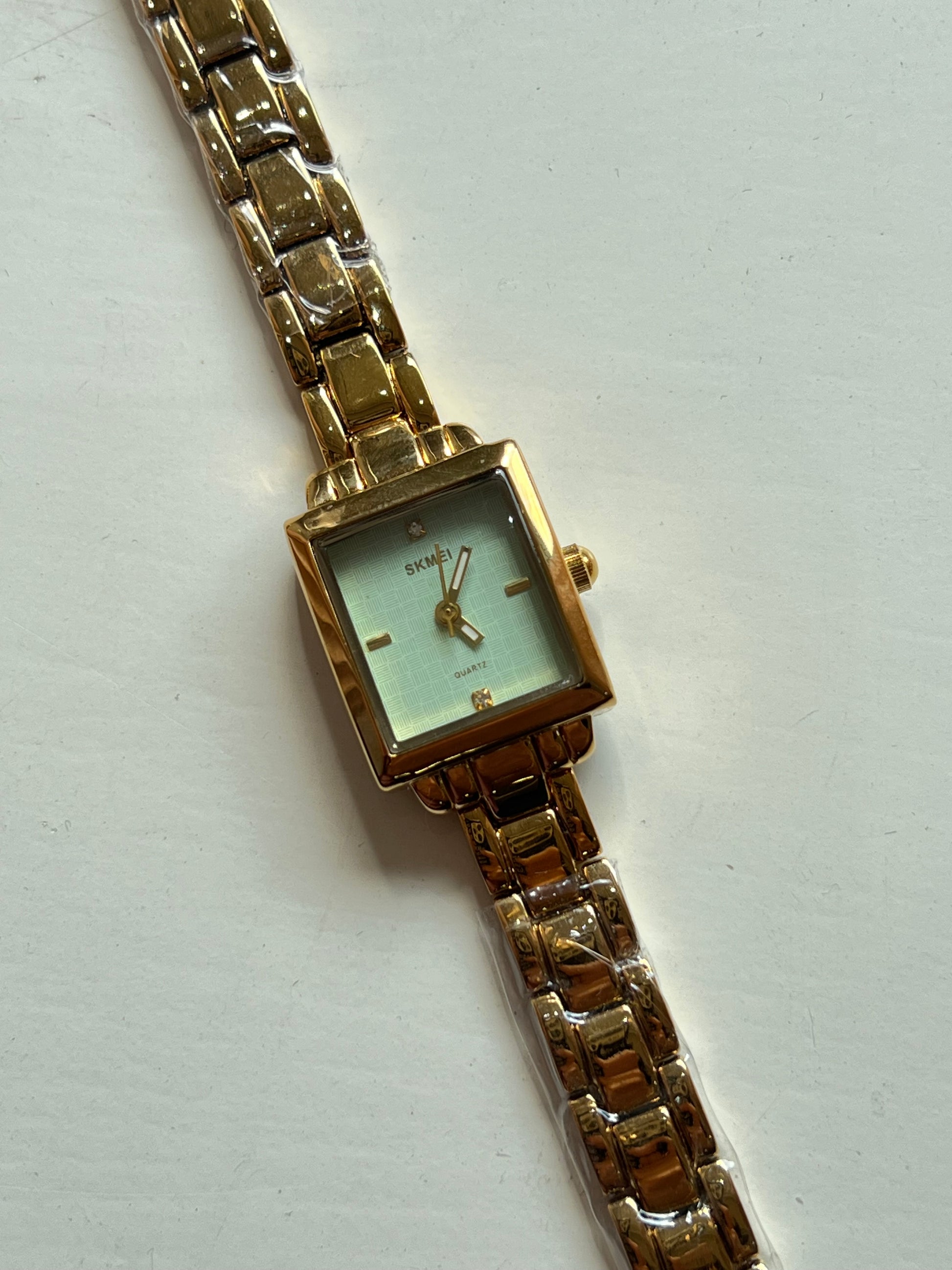 Reloj de pulsera SKMEI mecanico. Tiene caja cuadrada en tono dorado, esfera en color menta con indicadores en forma de pequeños cristales y manecillas doradas. Su correa metálica de eslabones dorados cuenta con cierre ajustable. Batería no recargable. Resistente al agua.