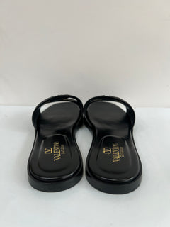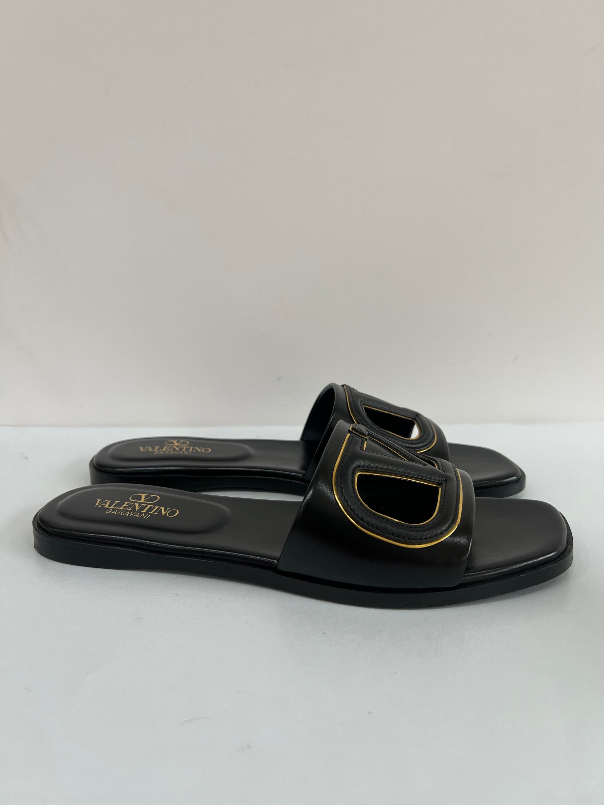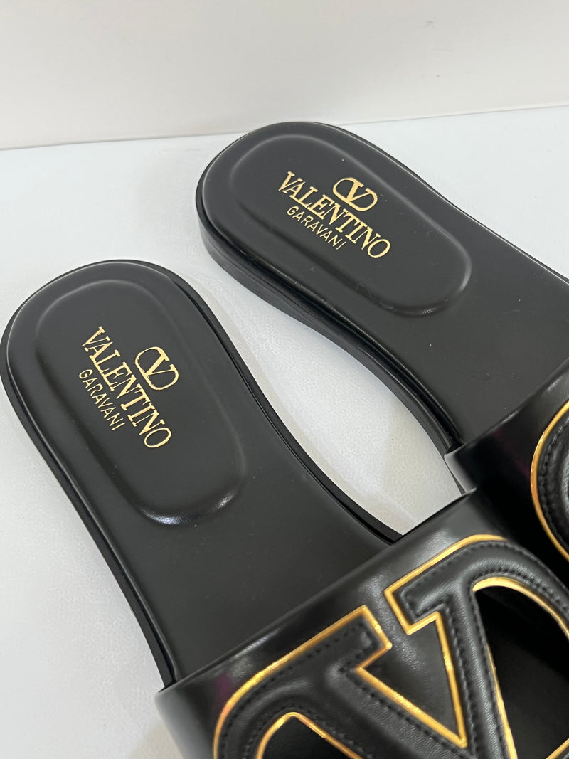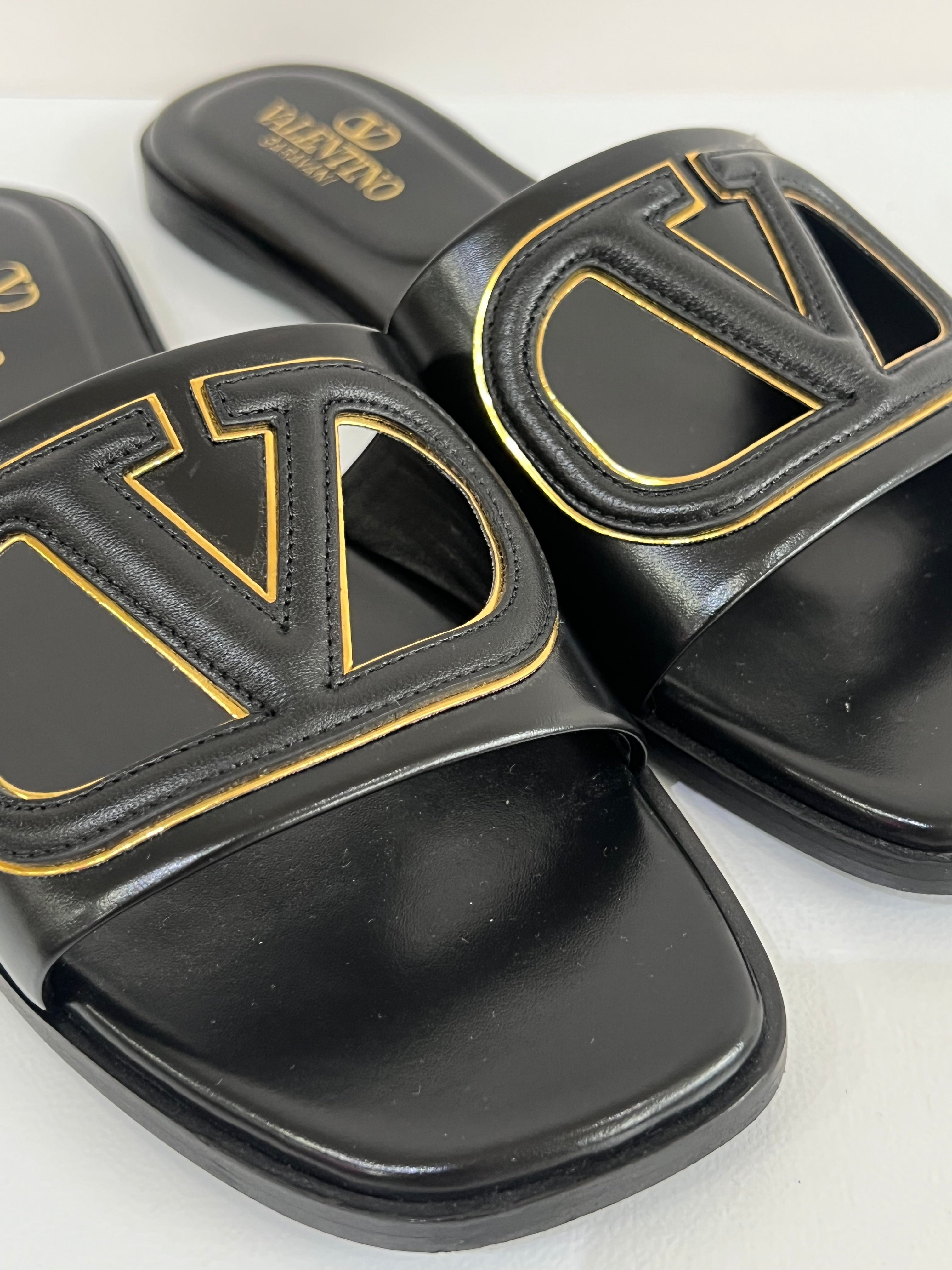 Sandalia tipo slide en cuero de becerro con logotipo “V” recortado en la tira superior. Plantilla acolchonada, suela plana y calce fácil.
