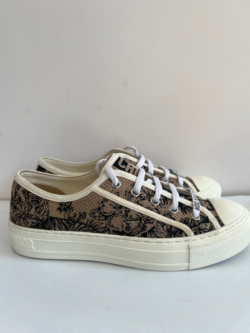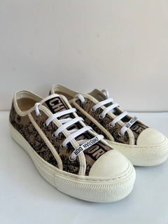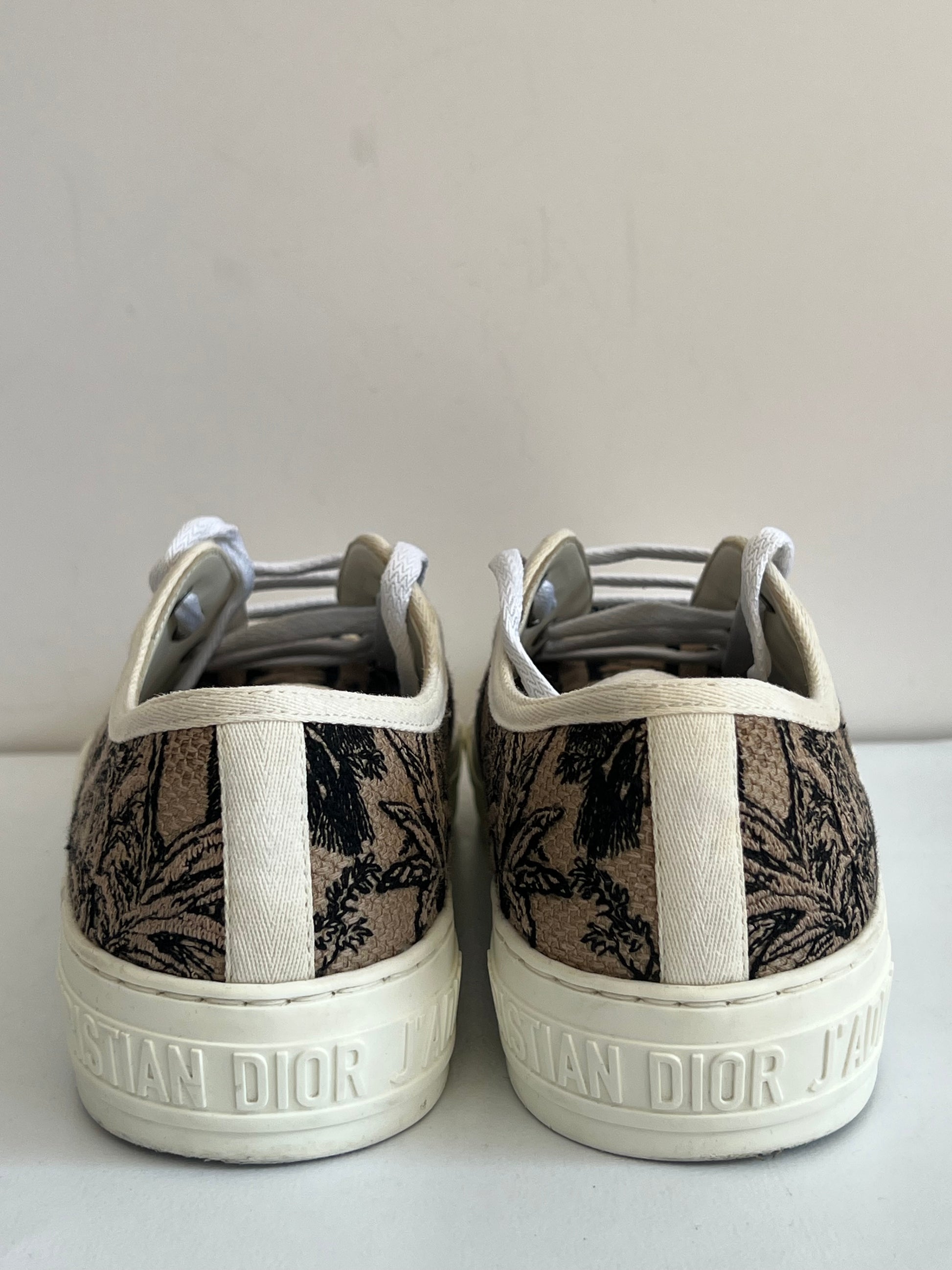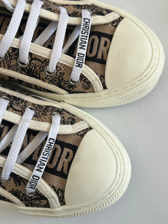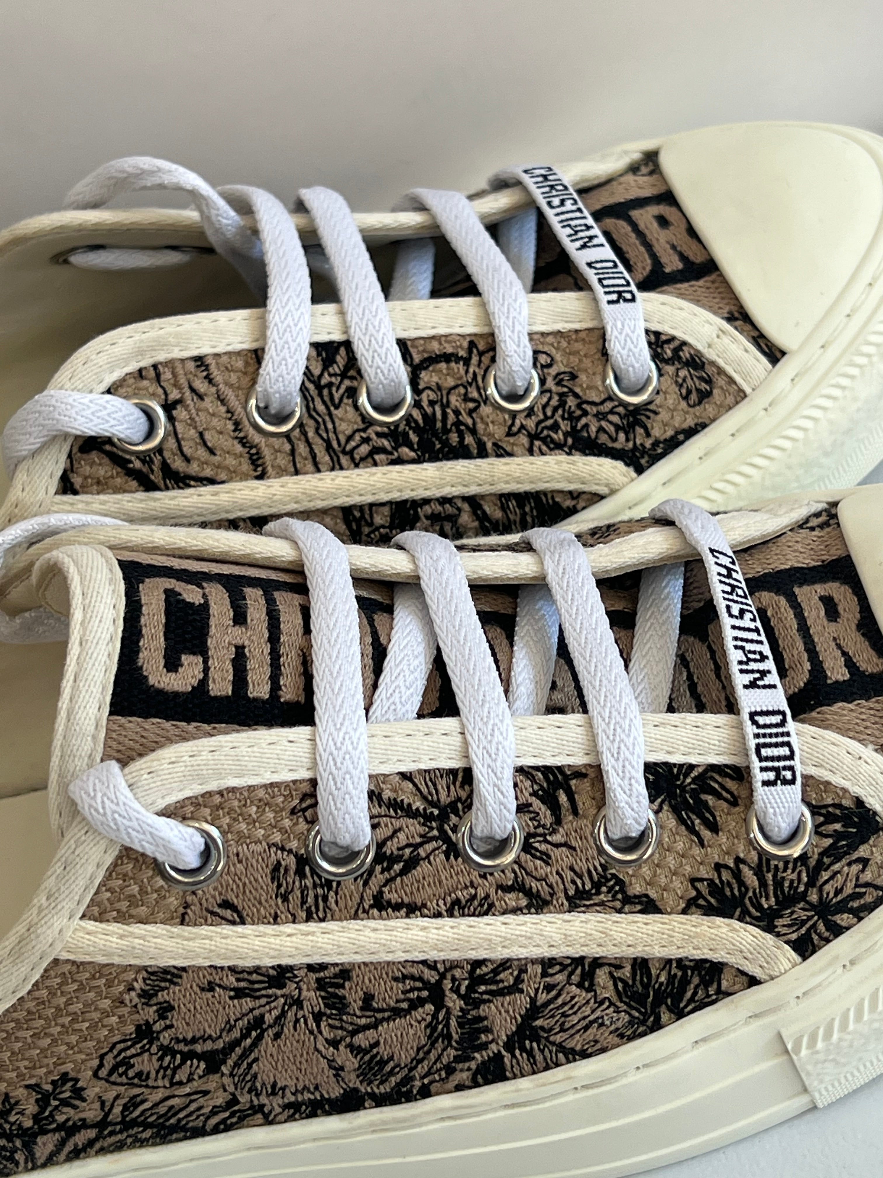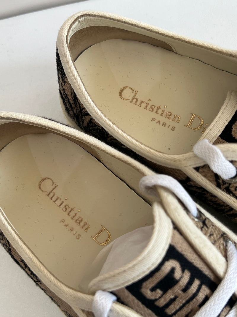 Zapatillas bajas en lona blanca con punta redonda de goma, cordones planos, ojales metálicos y suela gruesa de caucho con el logotipo “Christian Dior” en el lateral.