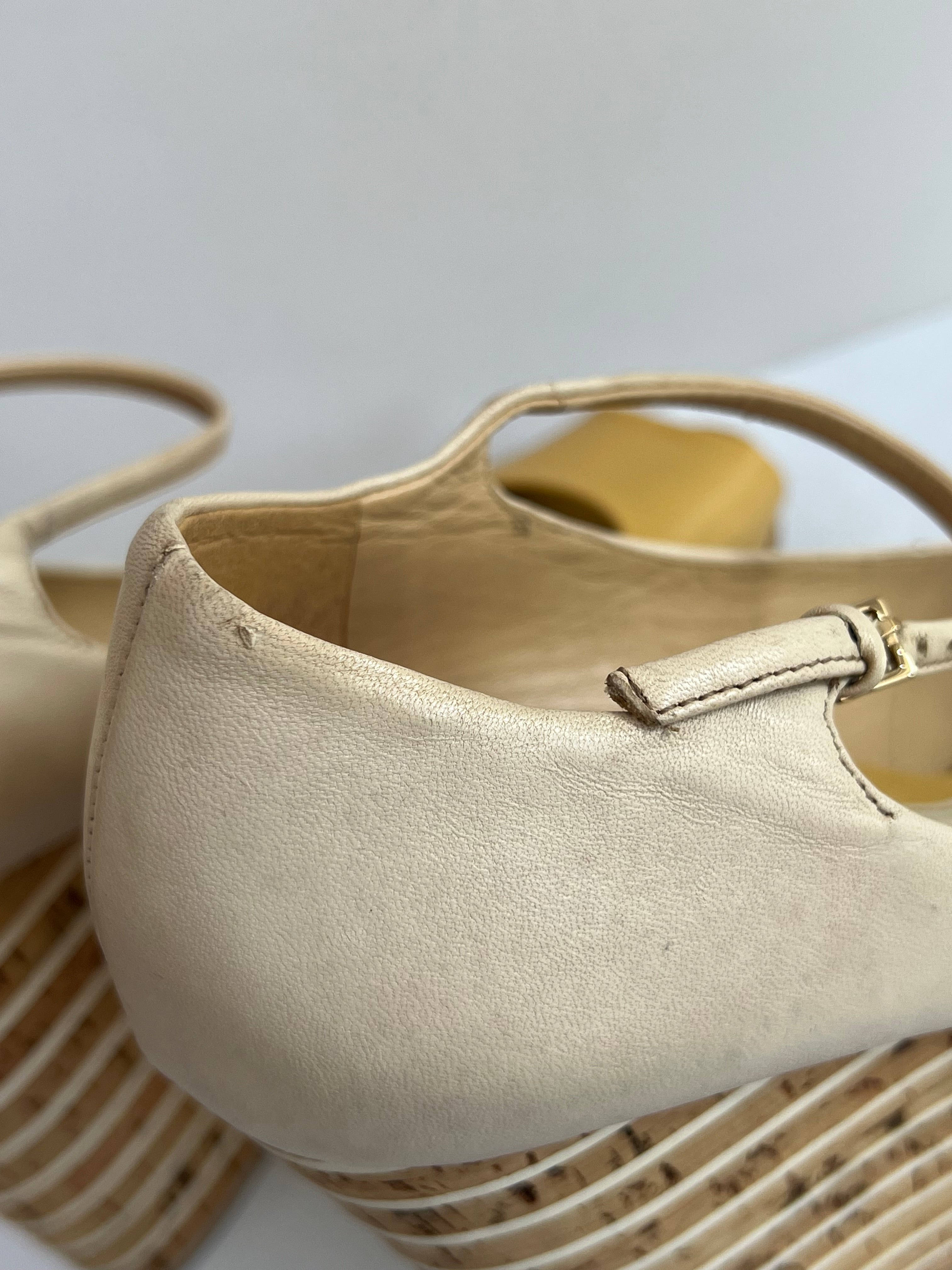 Sandalias con plataforma de cuña, confeccionadas en piel con acabado liso. Incorporan correa ajustable en el tobillo.