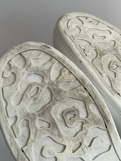 Zapatillas bajas en piel blanca con punta redonda, cordones planos, lengüeta y talón en el mismo tono. Suela de goma blanca sobredimensionada y lisa.