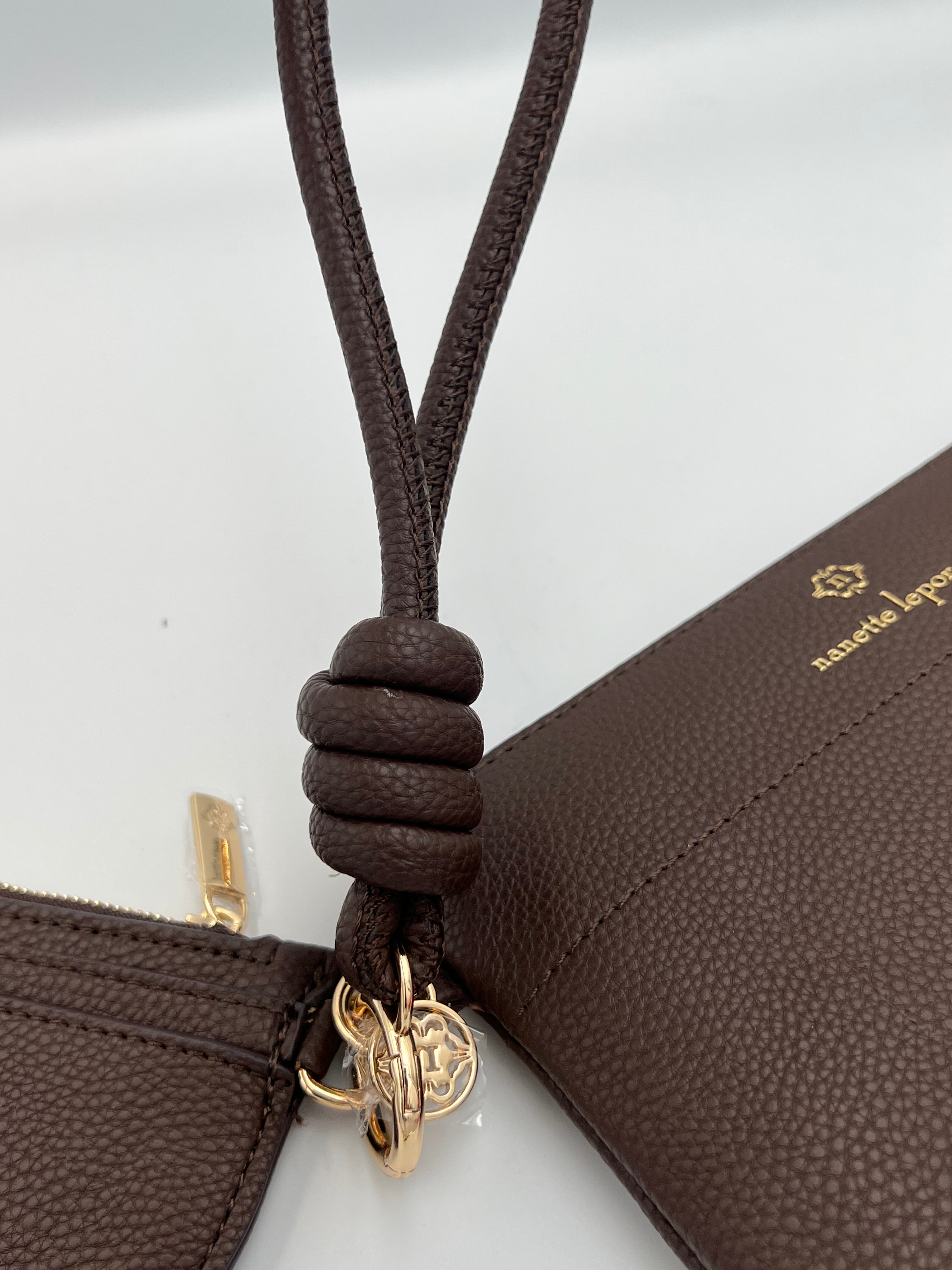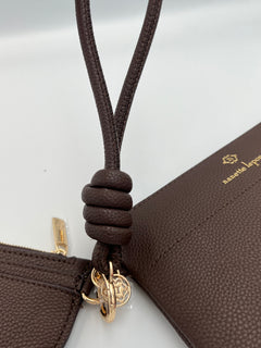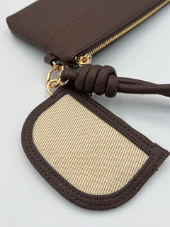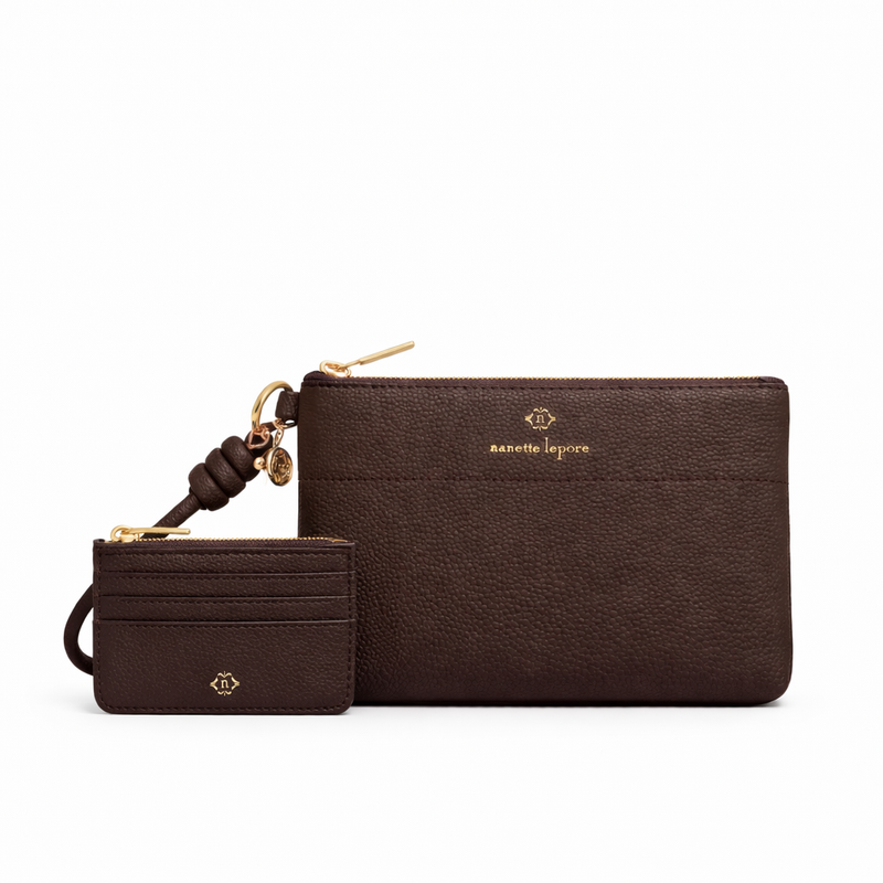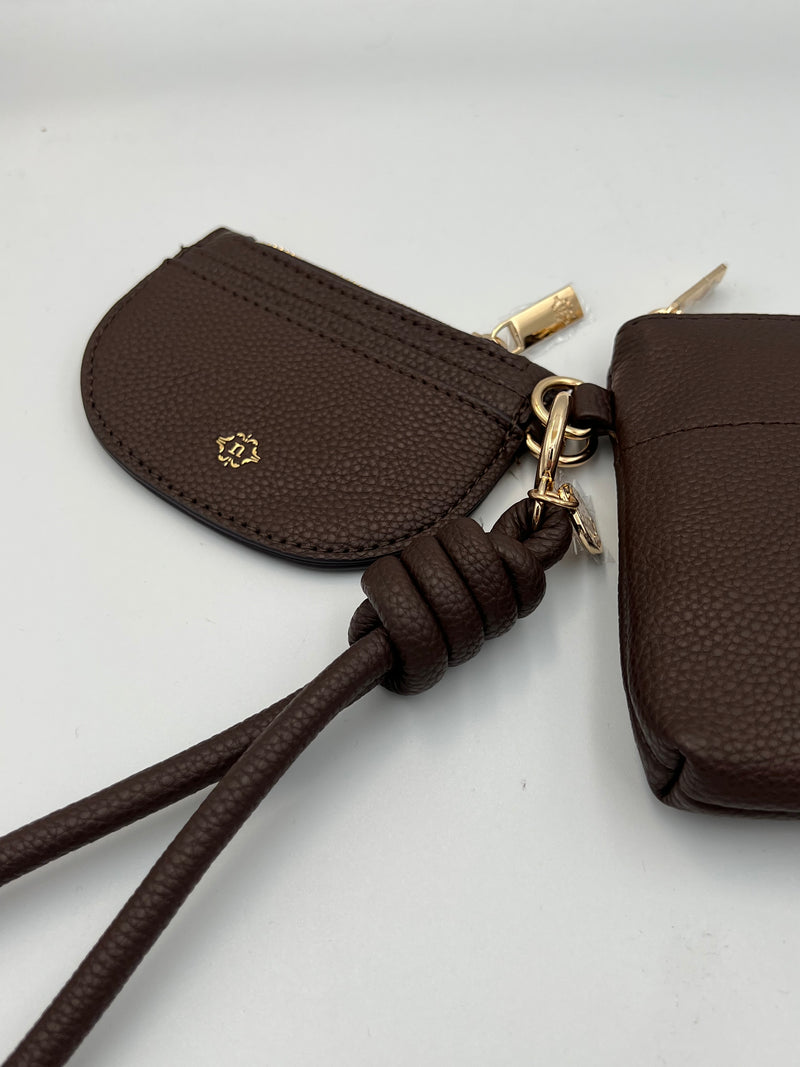 Wristlet pouch compacto y funcional que incluye un tarjetero adicional, ambos hechos en cuero sintético con acabado texturizado y herraje en dorado. El pouch porta cierre con cremallera y suficiente espacio para tarjetas, billetes y esenciales. Color dark brown.