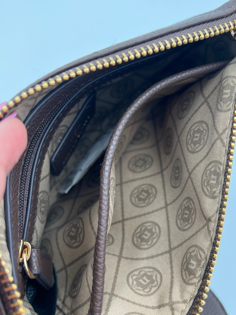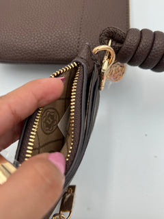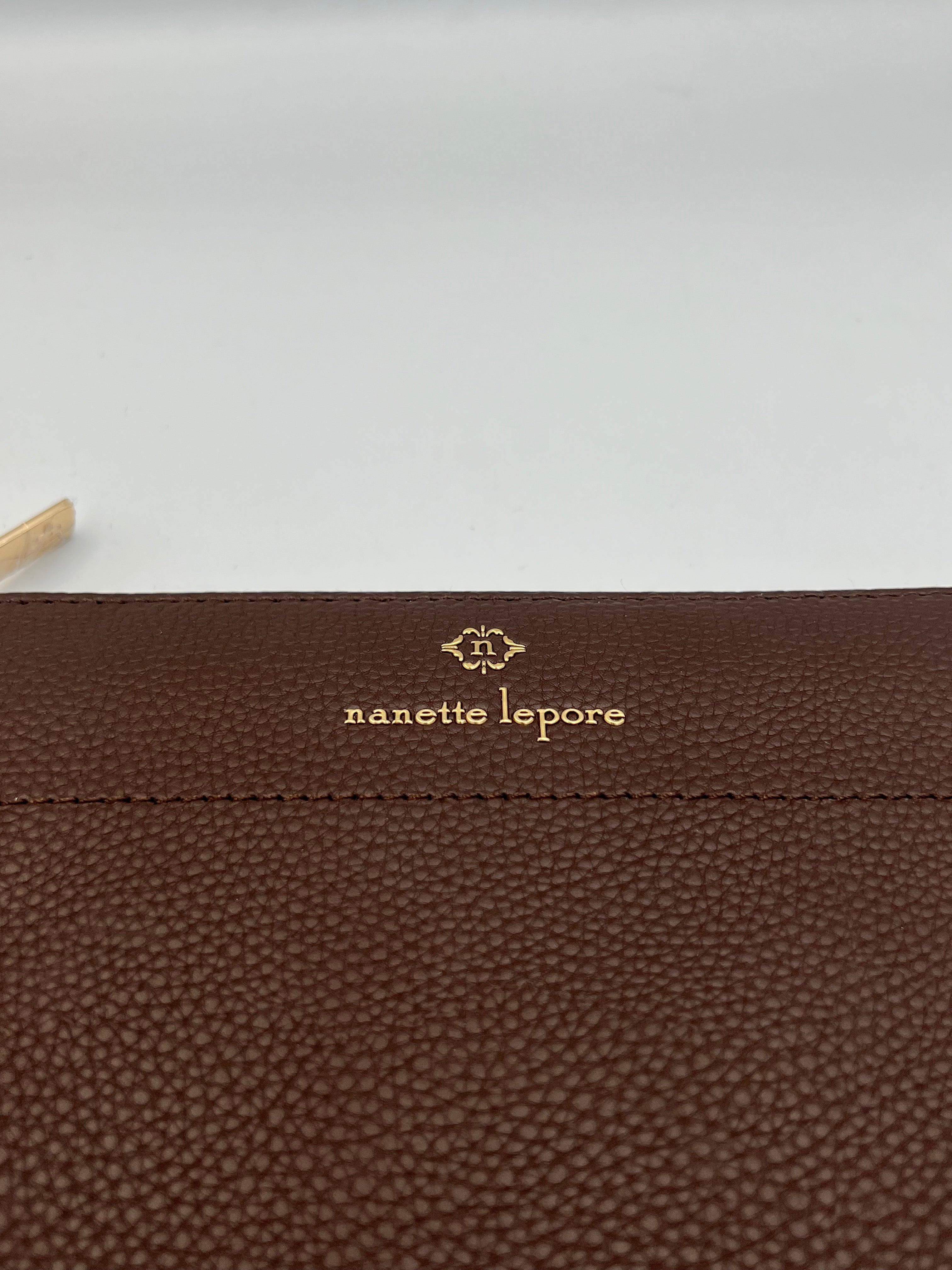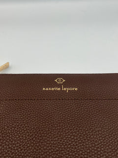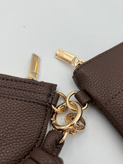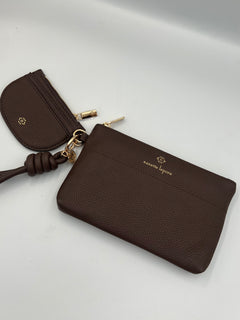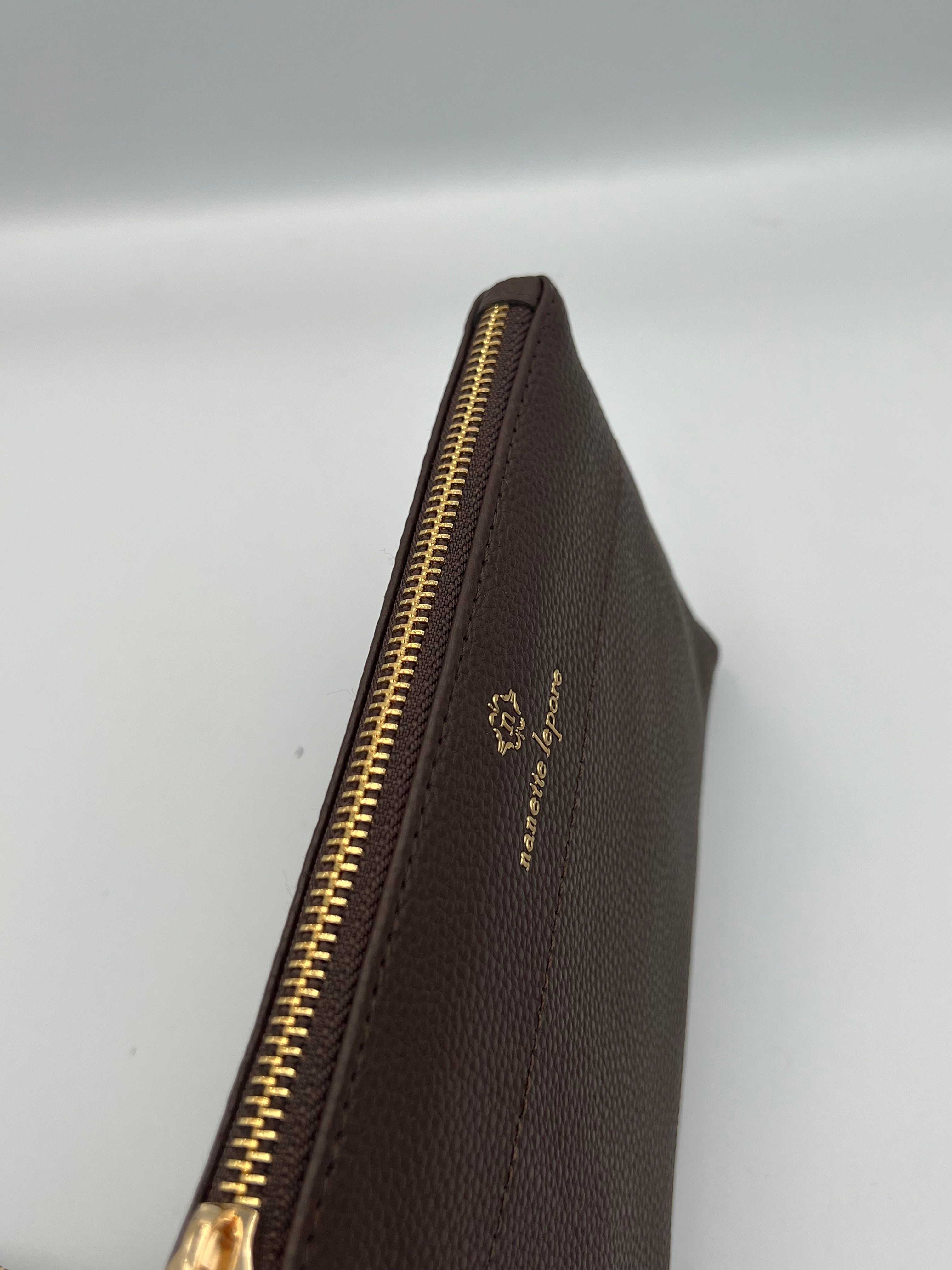 Wristlet pouch compacto y funcional que incluye un tarjetero adicional, ambos hechos en cuero sintético con acabado texturizado y herraje en dorado. El pouch porta cierre con cremallera y suficiente espacio para tarjetas, billetes y esenciales. Color dark brown.