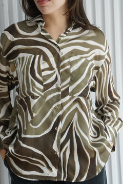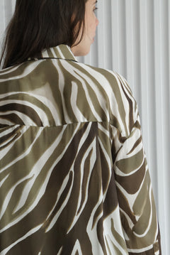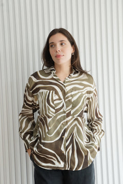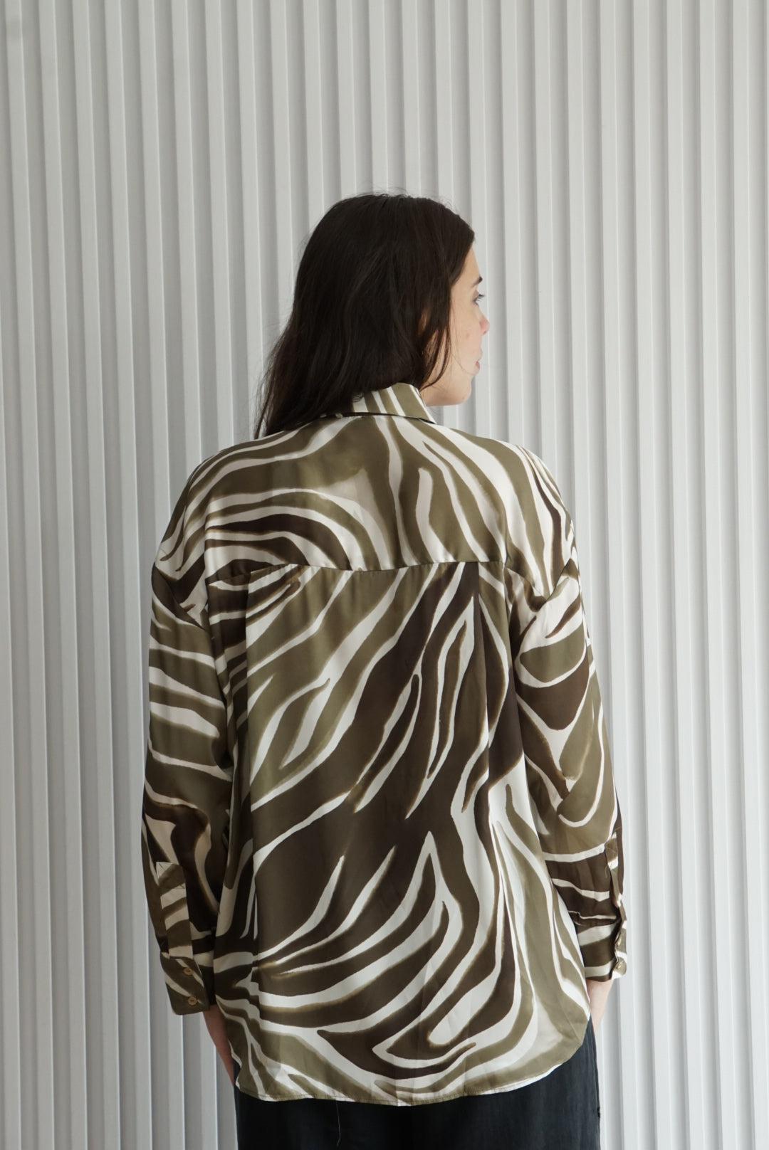 blusa satinada manga larga y de botones con estampado de zebra color verde. Botones dorados. Un básico elevado.